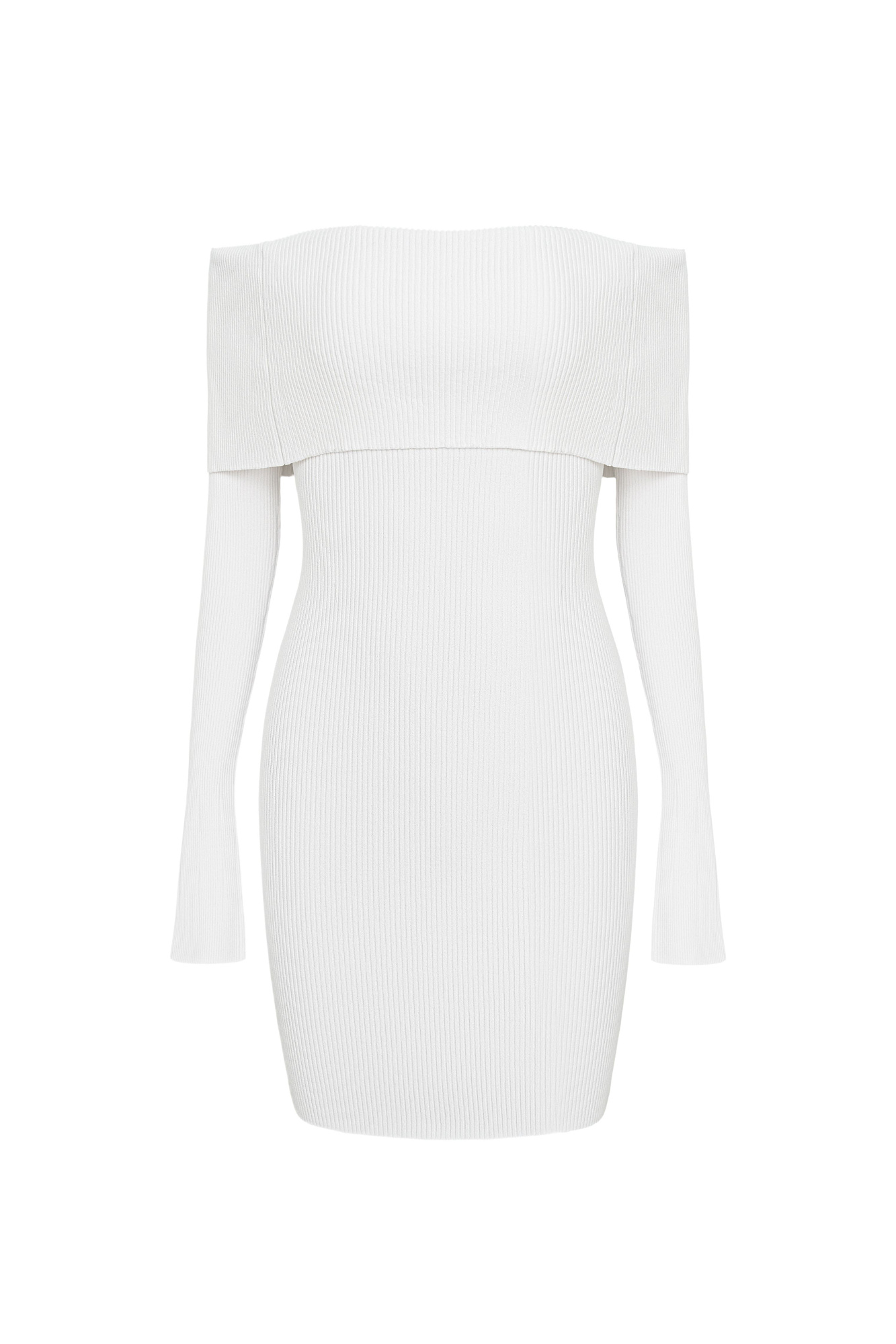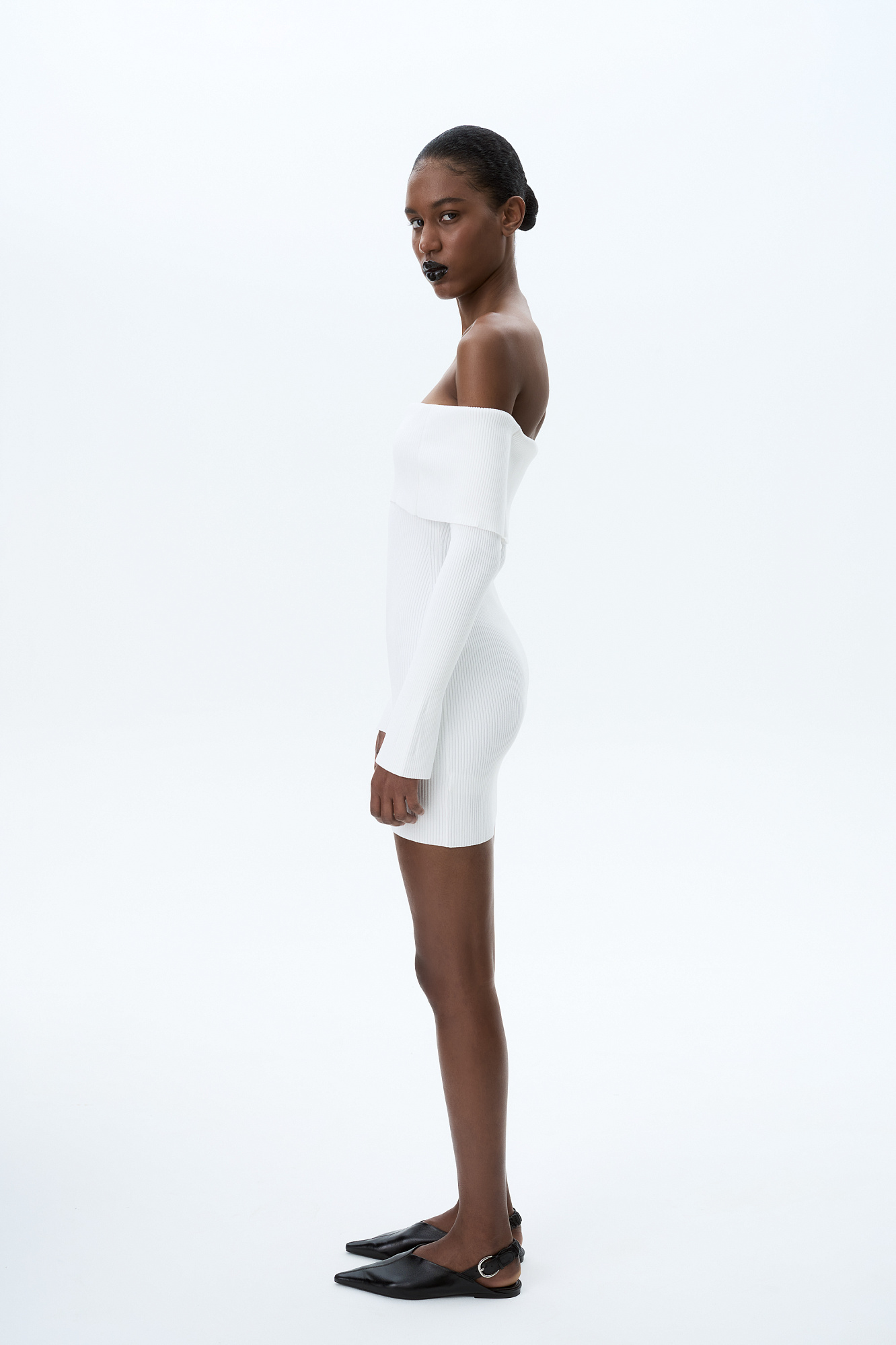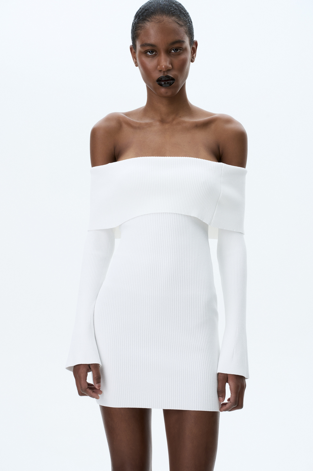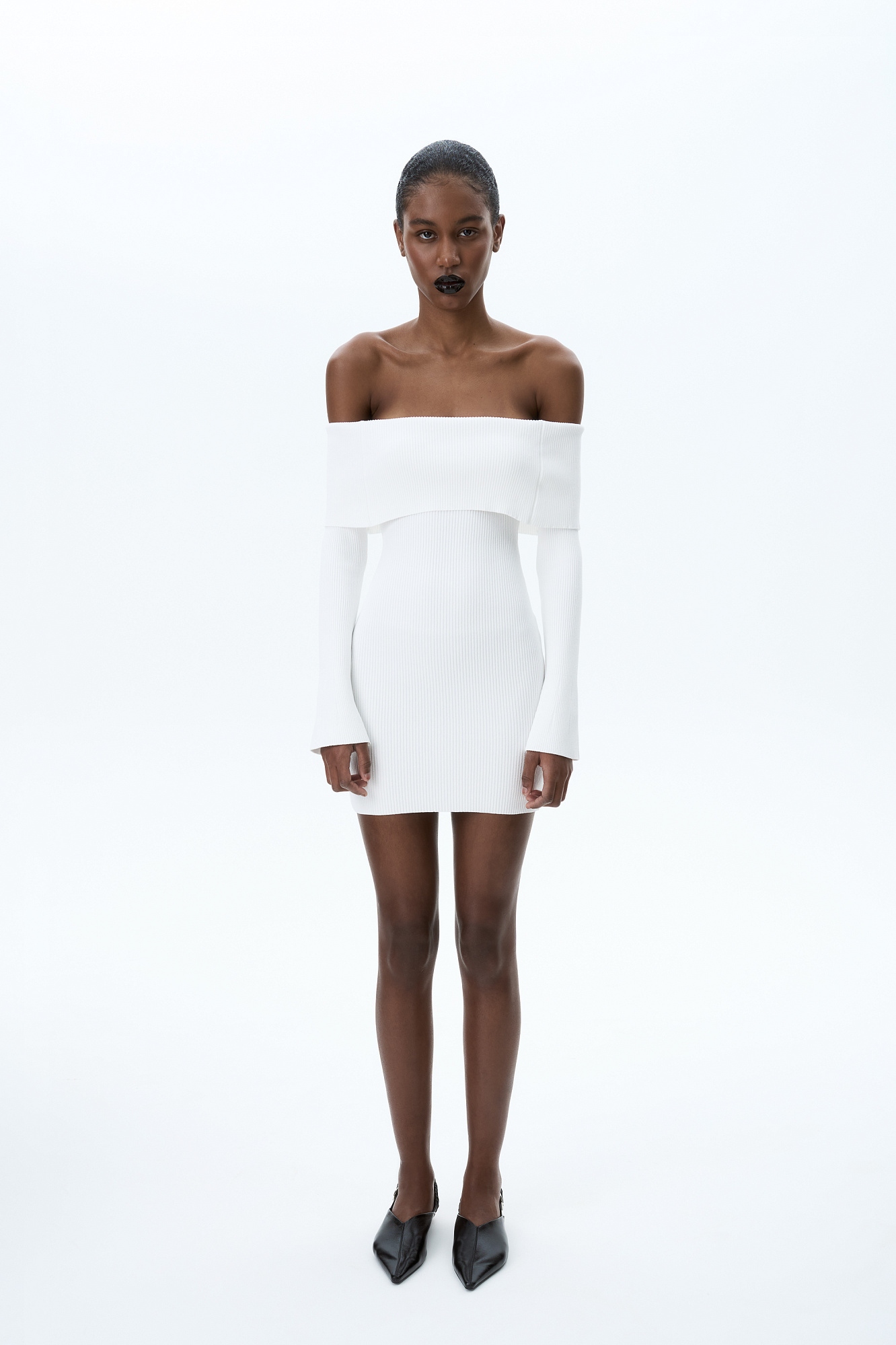 Трикотажное платье длины мини из вискозы в рубчик. Модель приталенного силуэта, с длинными рукавами и открытой линией плеч.