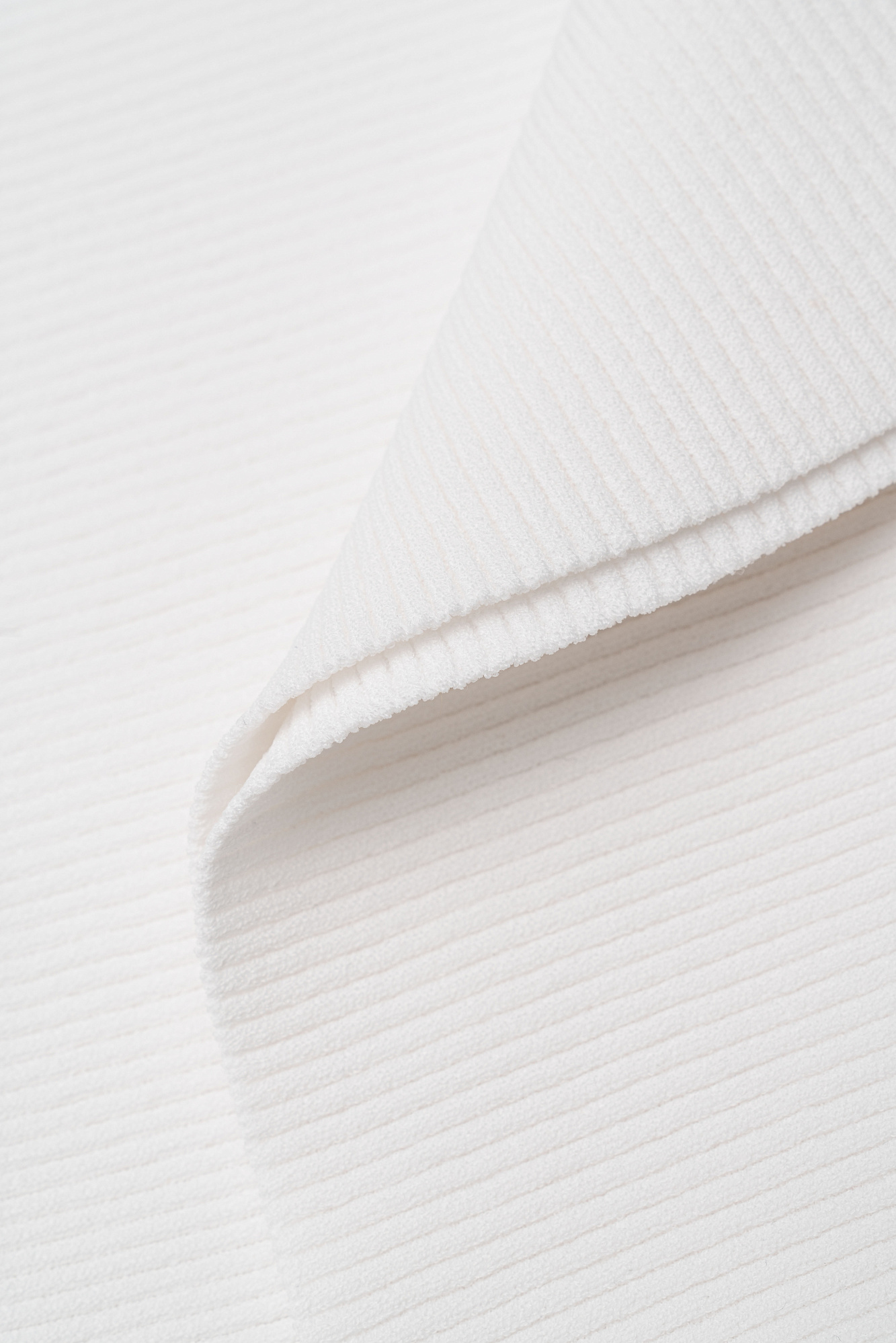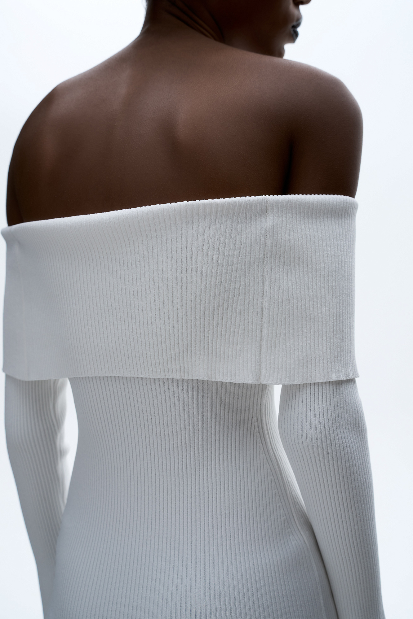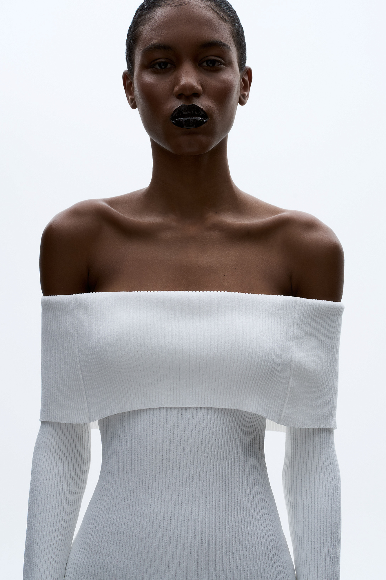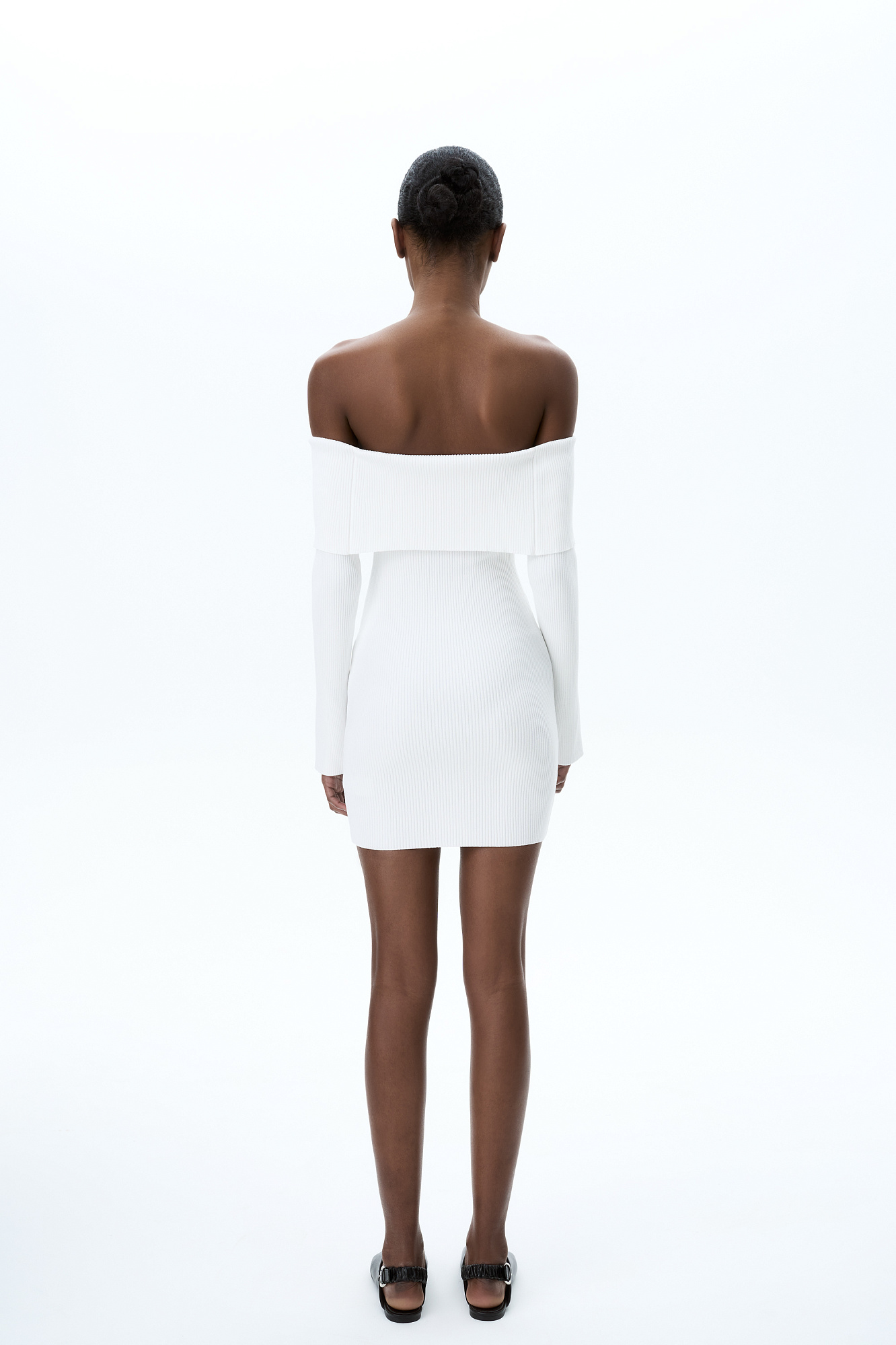 Трикотажное платье длины мини из вискозы в рубчик. Модель приталенного силуэта, с длинными рукавами и открытой линией плеч.