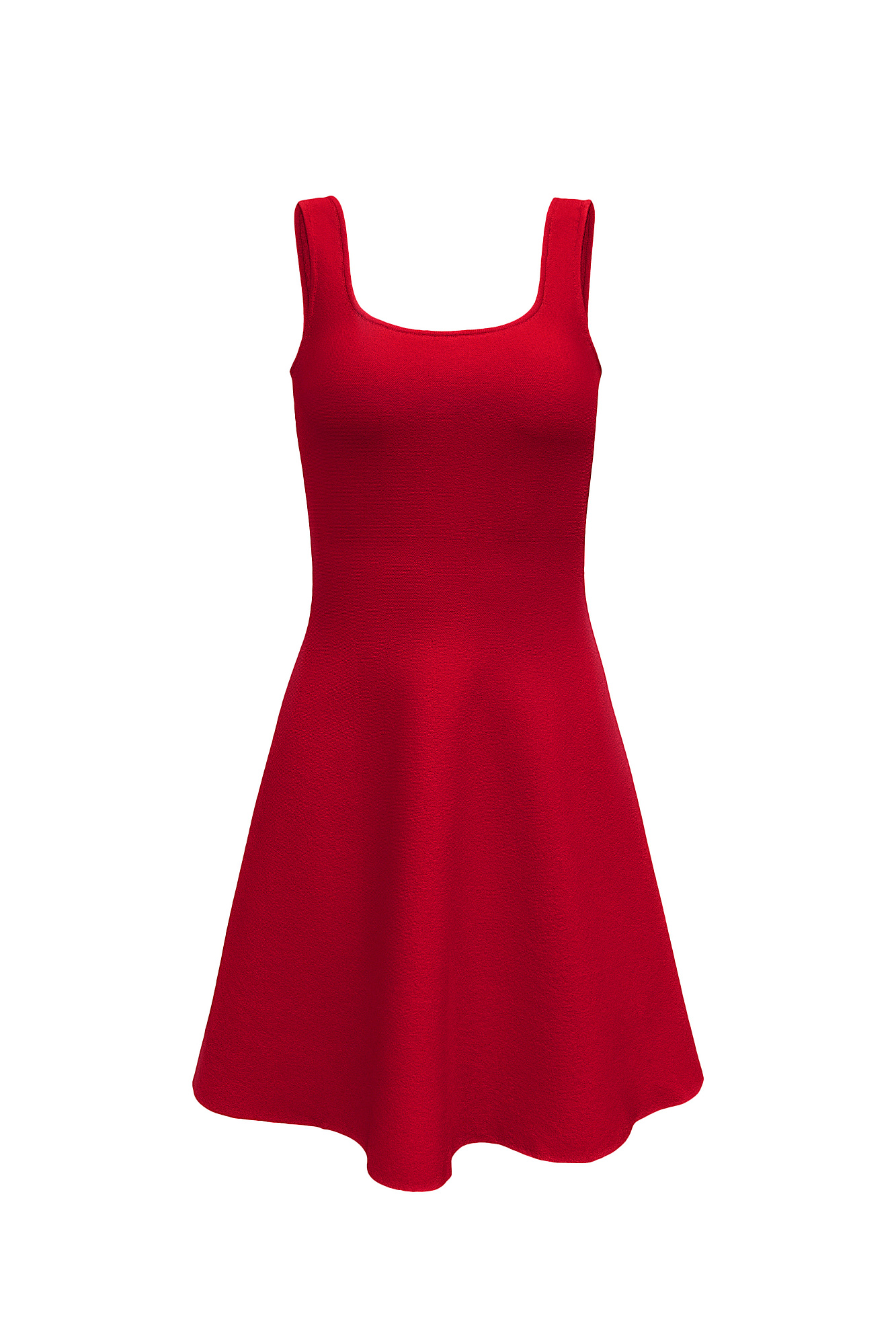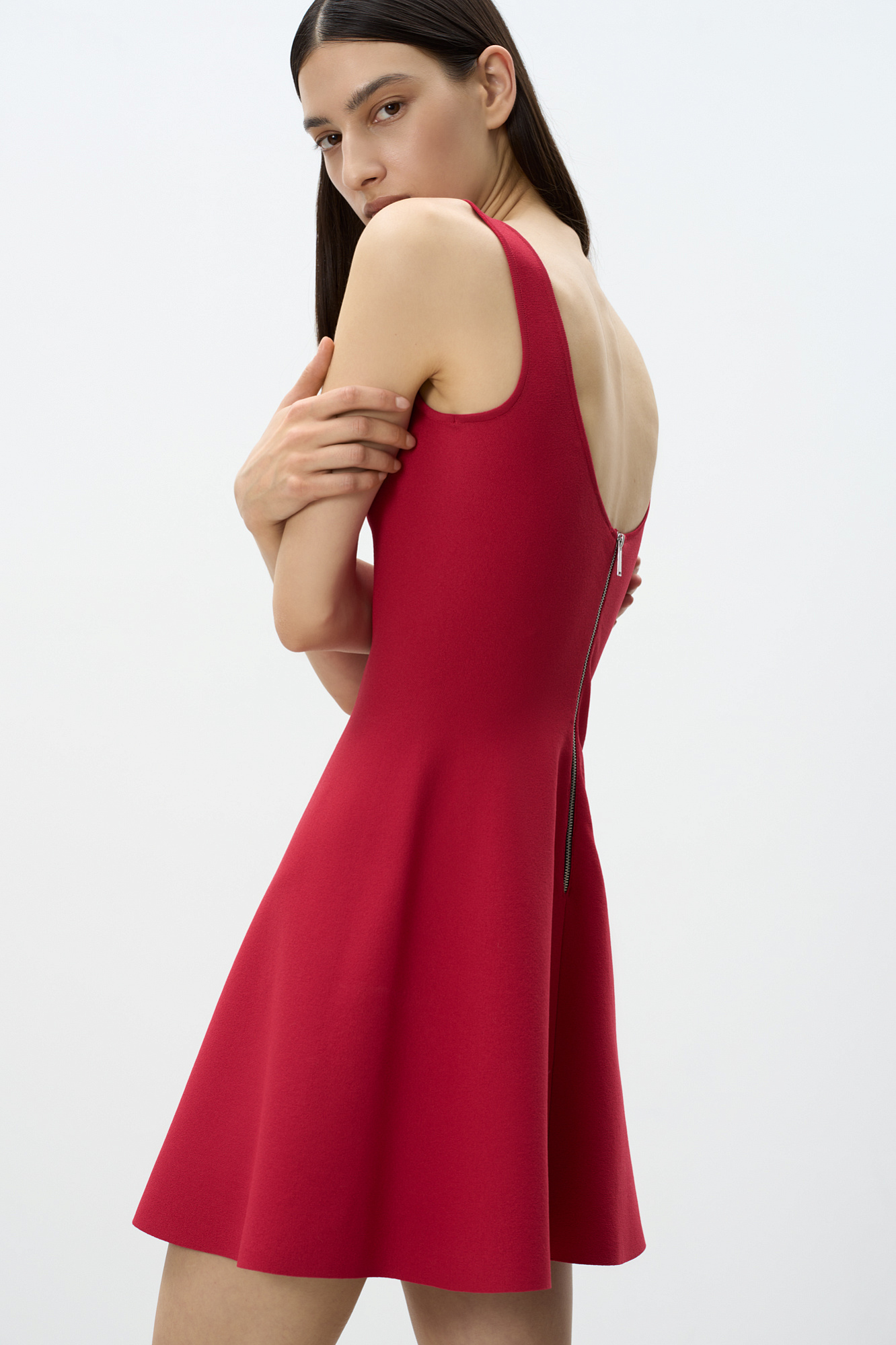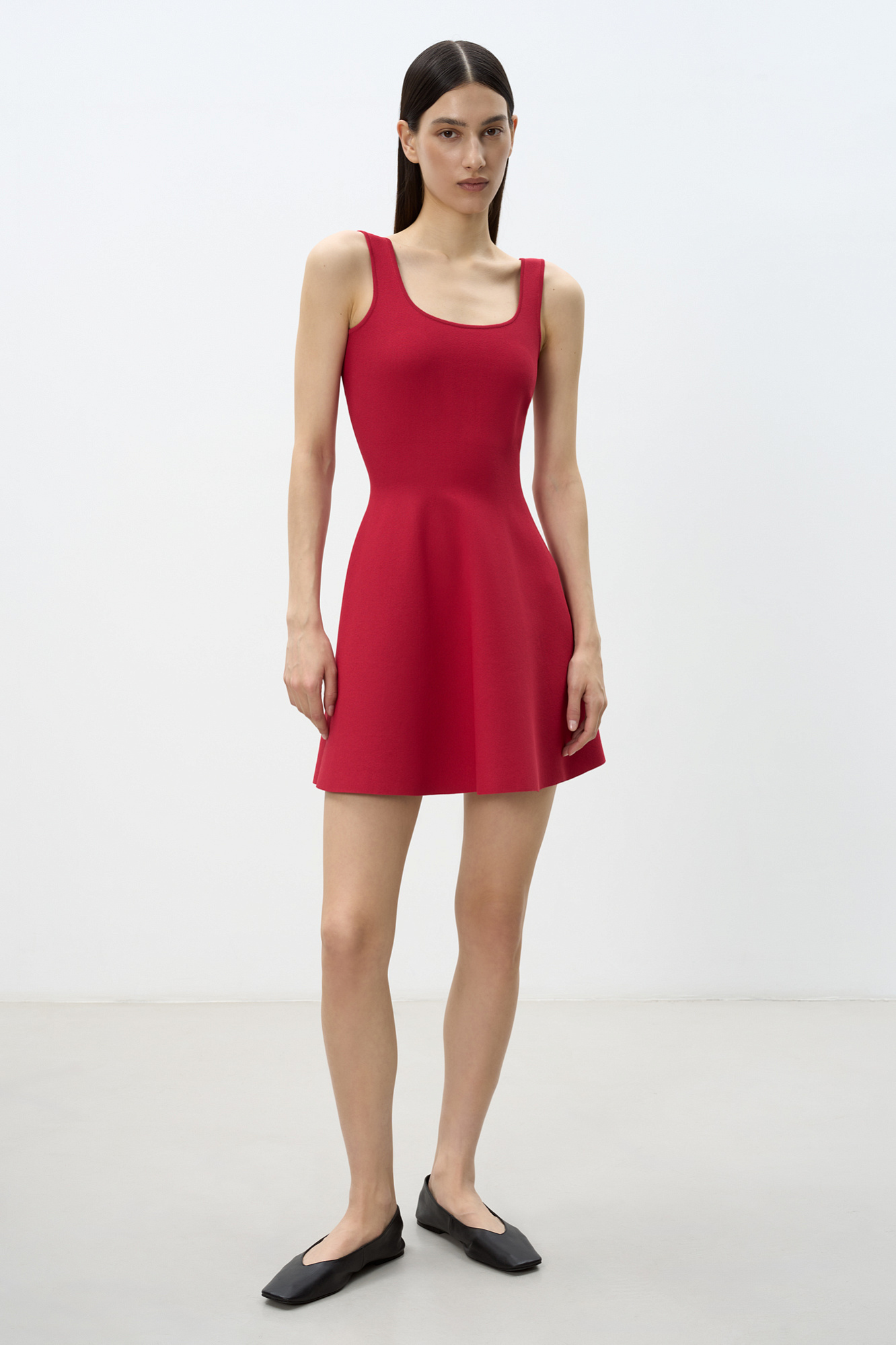 Трикотажное мини платье в стиле baby doll на широких бретелях. Круглый вырез, застежка сзади на молнию. Платье связано из плотной эластичной вискозы, что позволяет прилегать по фигуре и держать объем у юбки.