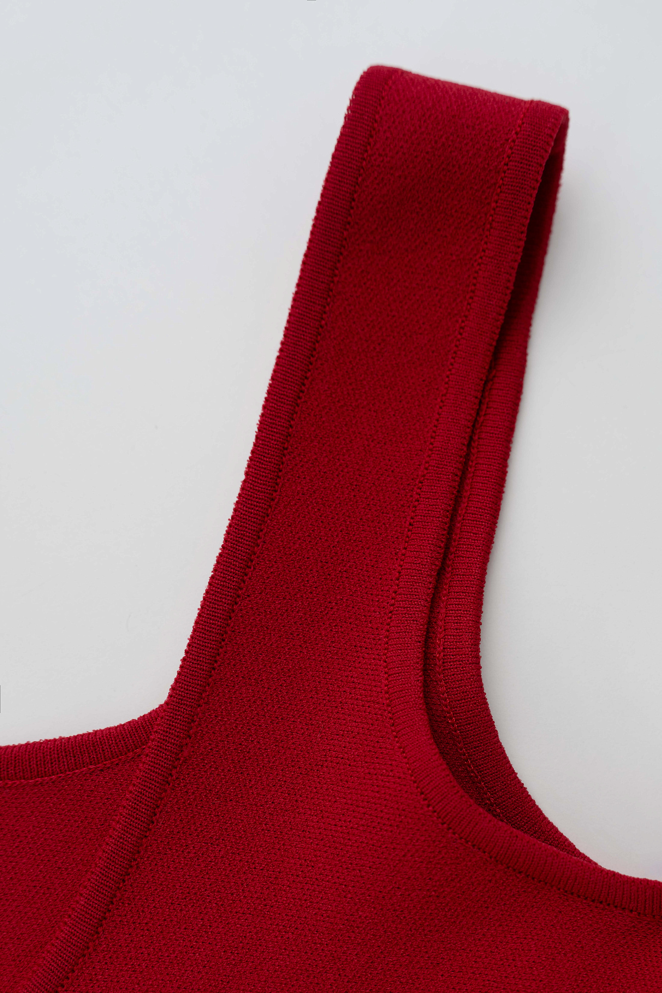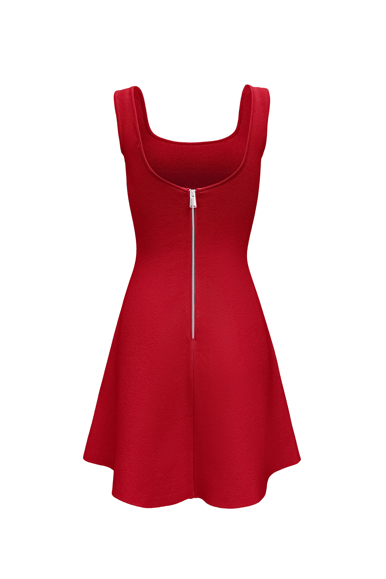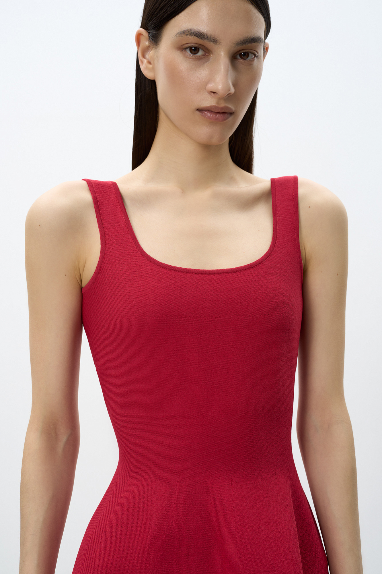 Трикотажное мини платье в стиле baby doll на широких бретелях. Круглый вырез, застежка сзади на молнию. Платье связано из плотной эластичной вискозы, что позволяет прилегать по фигуре и держать объем у юбки.