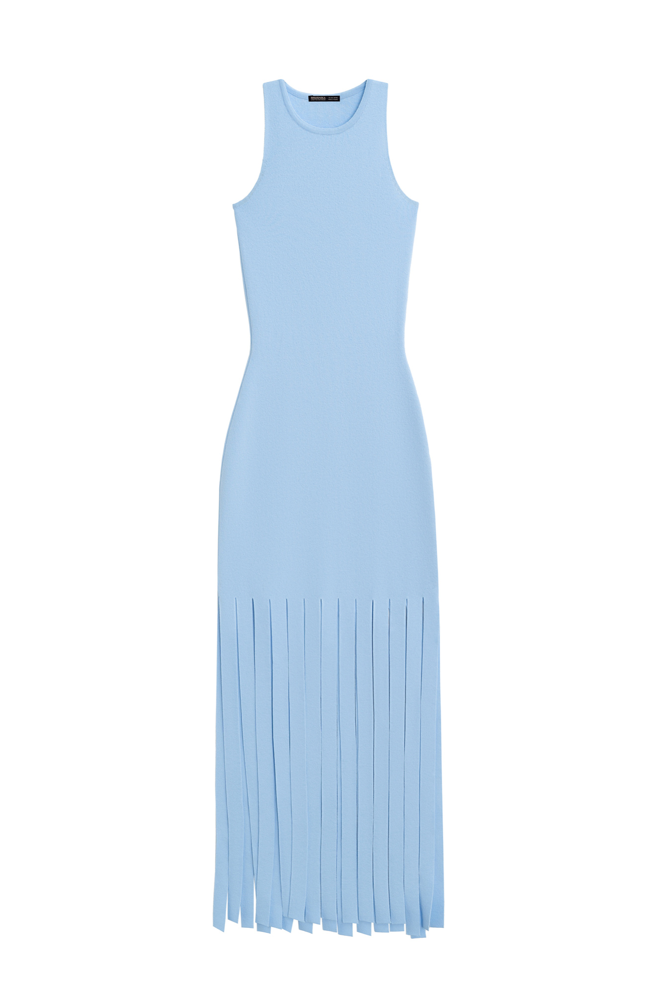 Трикотажное платье длины мини из мягкой вискозы. Модель прителенного лисуэта, без рукавов и круглым вырезом горловины. Изделие декорировано бахромой из широких лент.