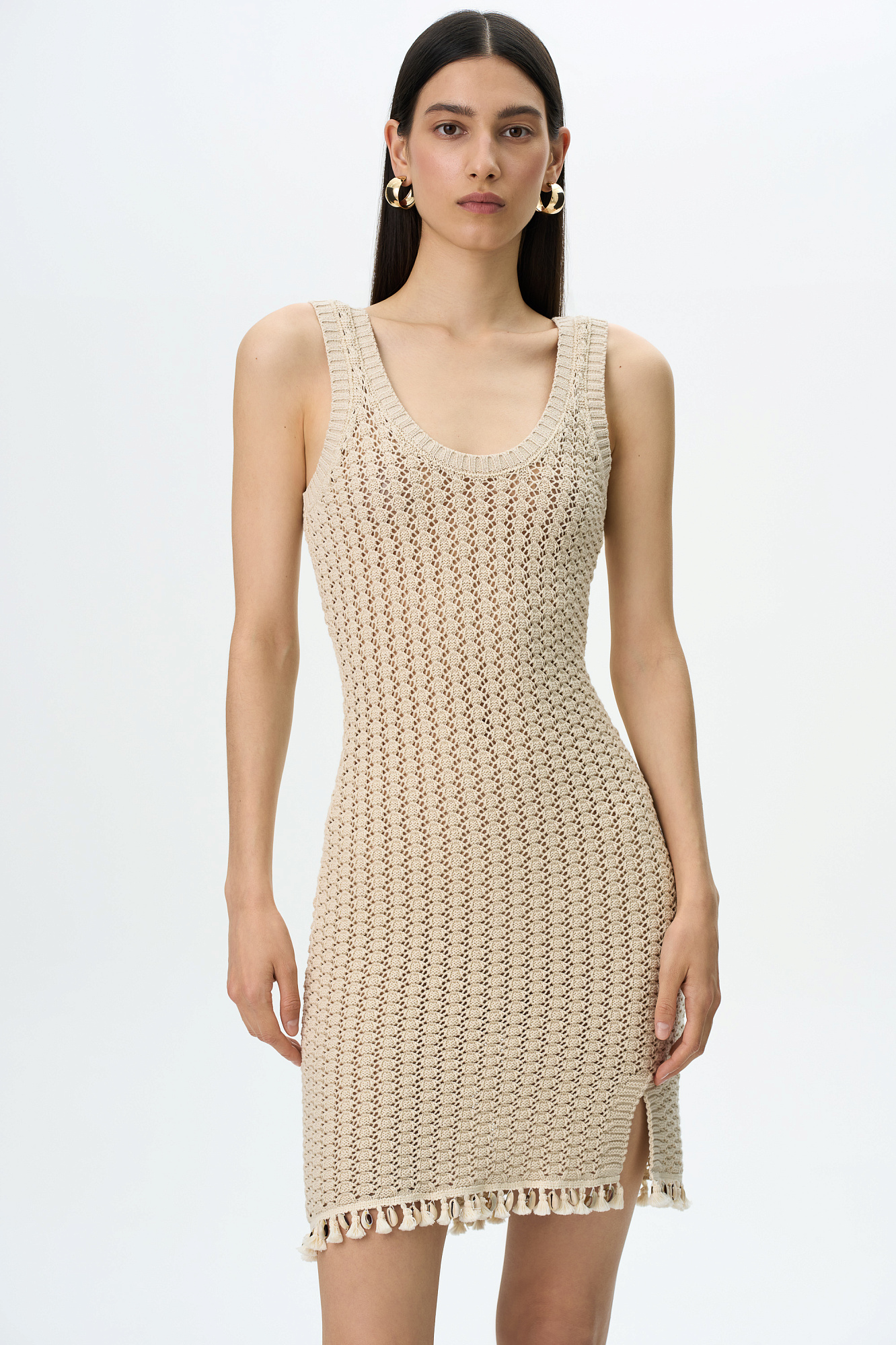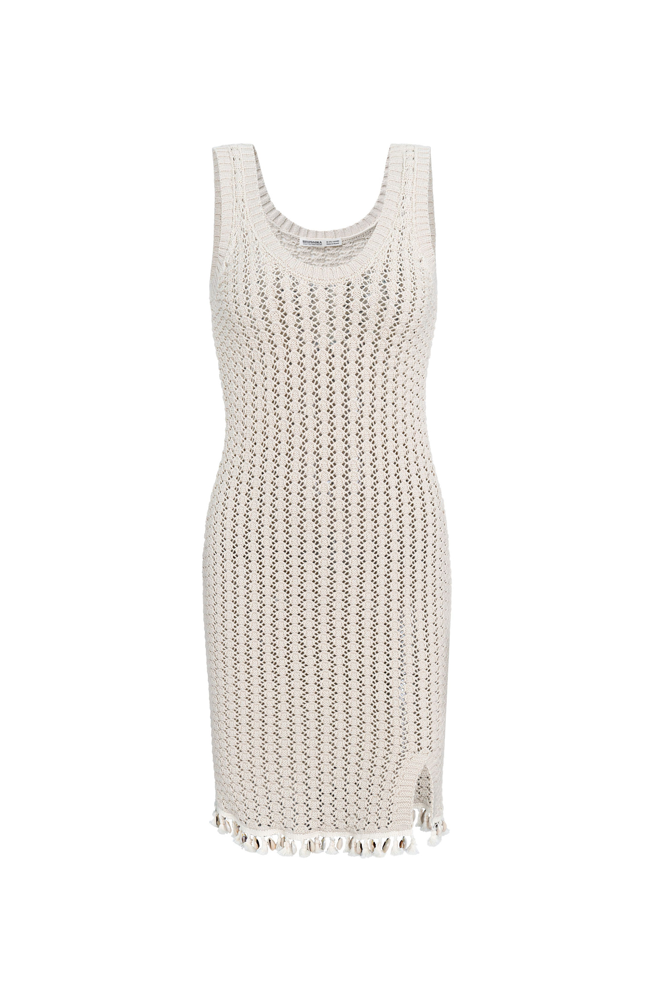 Трикотажное платье длины мини фактурной вязки из хлопка. Модель приталенного силуэта, с U-образным вырезом горловины и широкими бретелями. Изделие декорировано тесьмой с ракушками и пайетками .