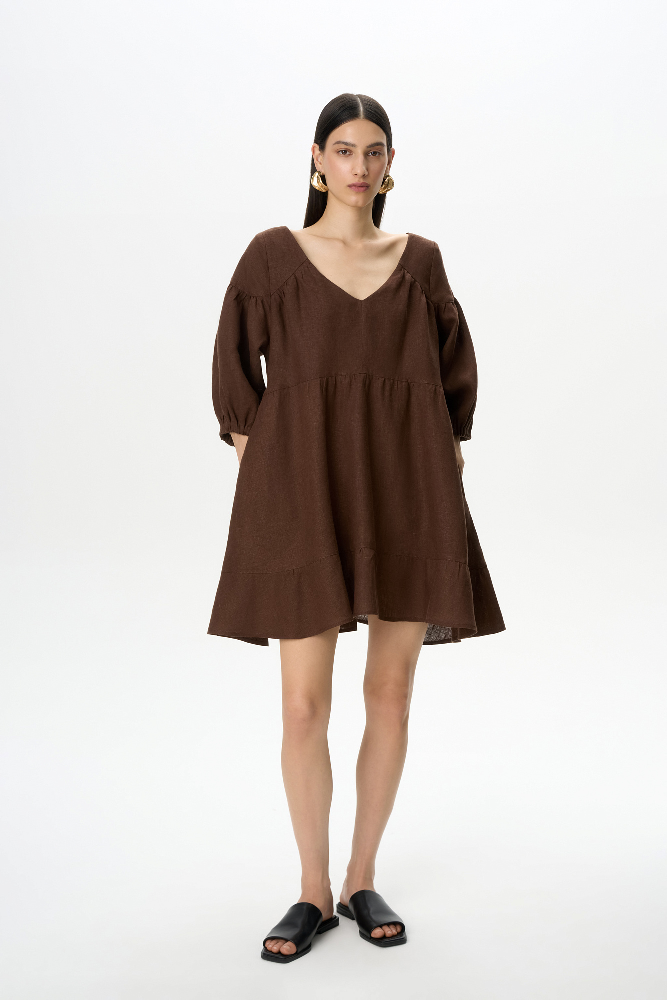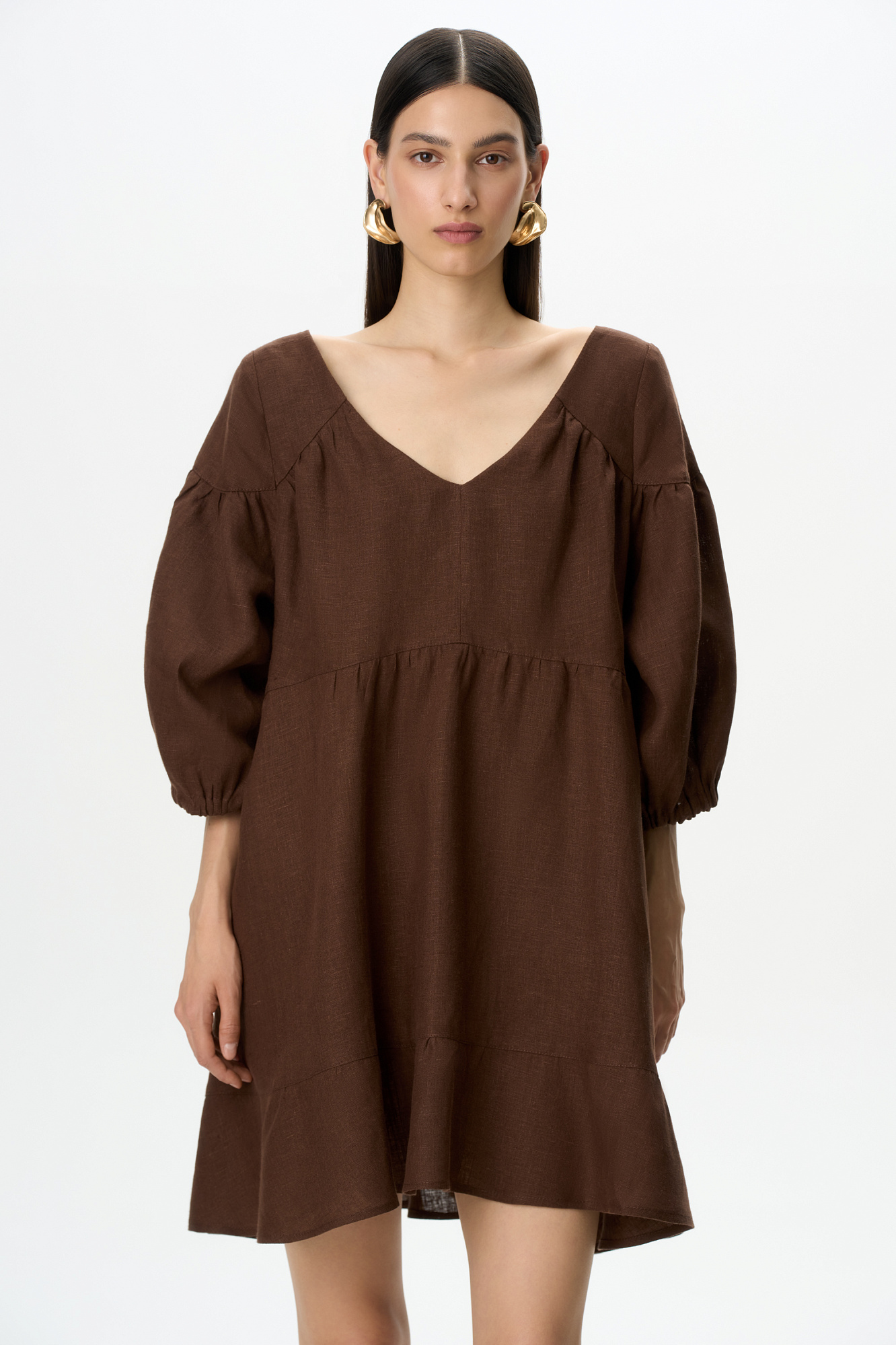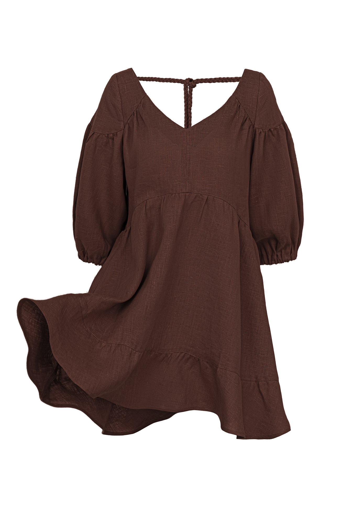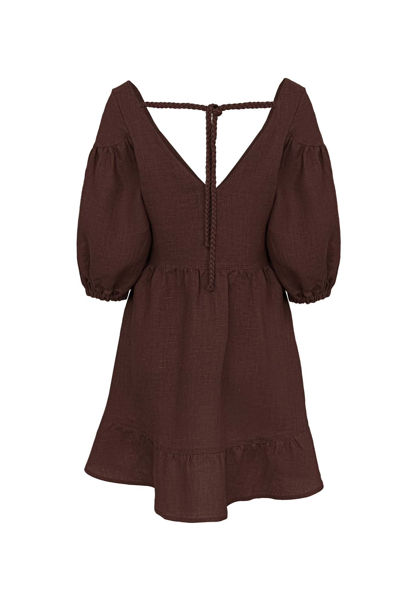 Короткое платье из 100% льна с расклешением от талии и широким асимметричным воланом внизу. Модель свободного кроя с коротким рукавом на резинке и V-образным вырезом с завязками на спине.