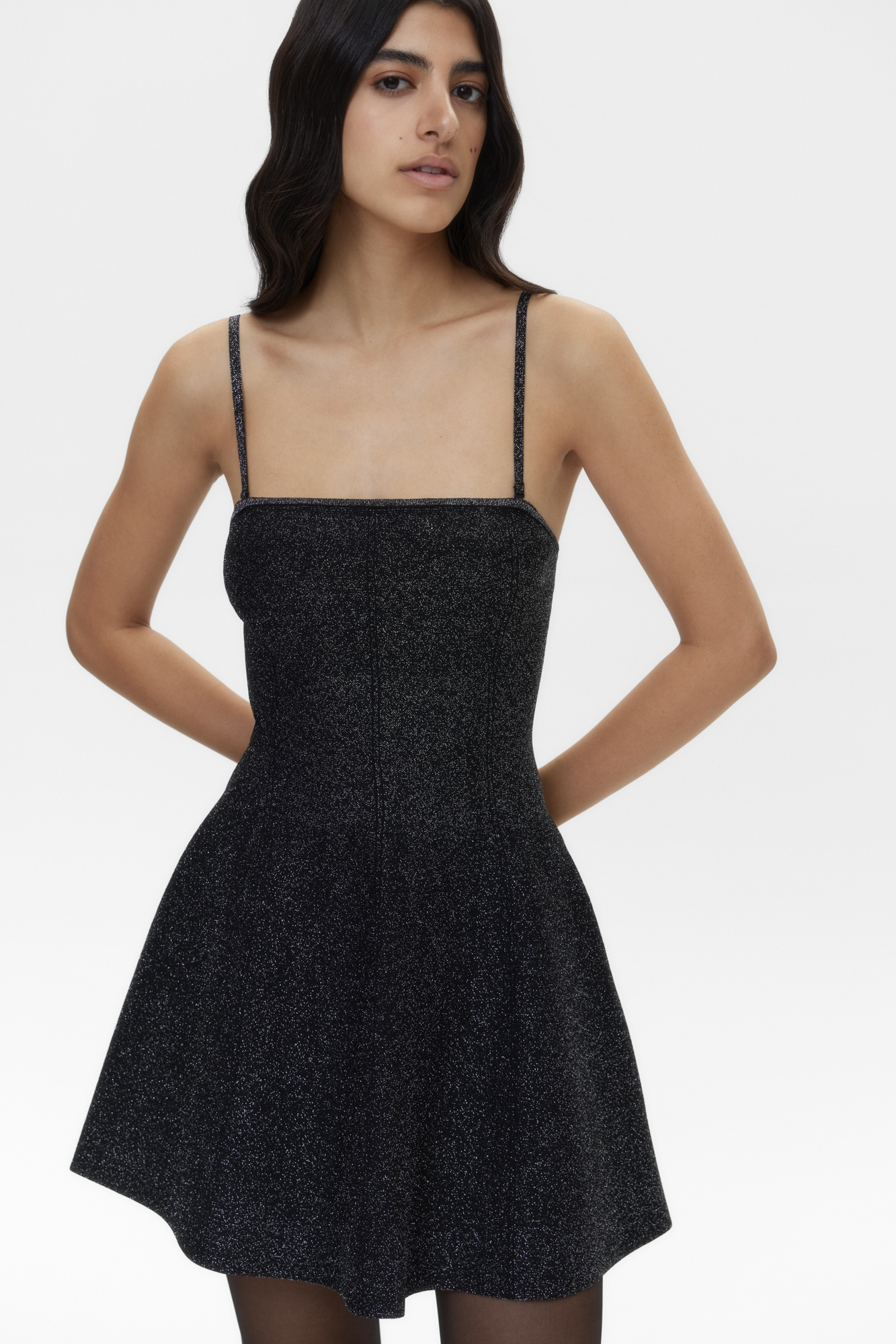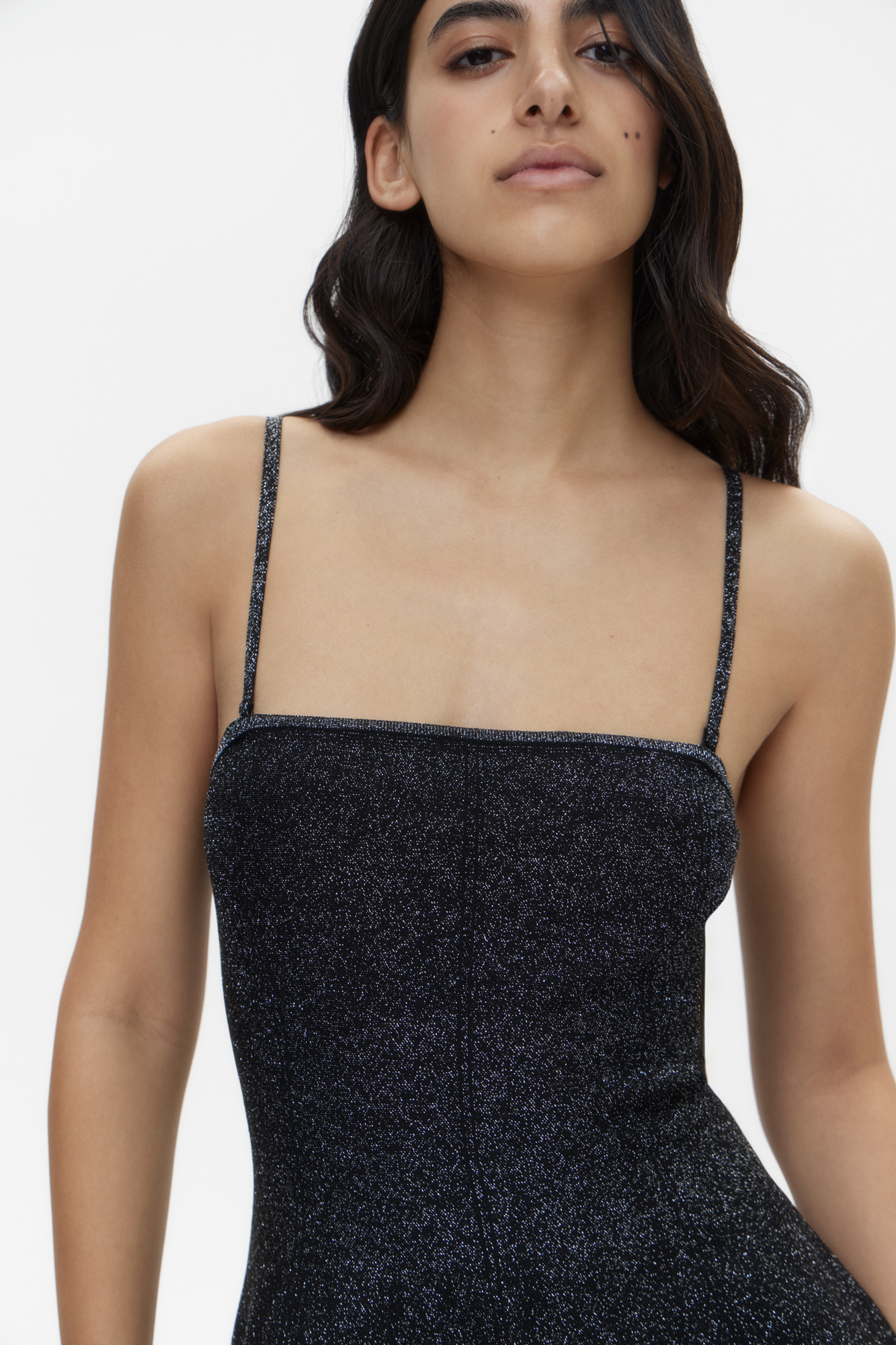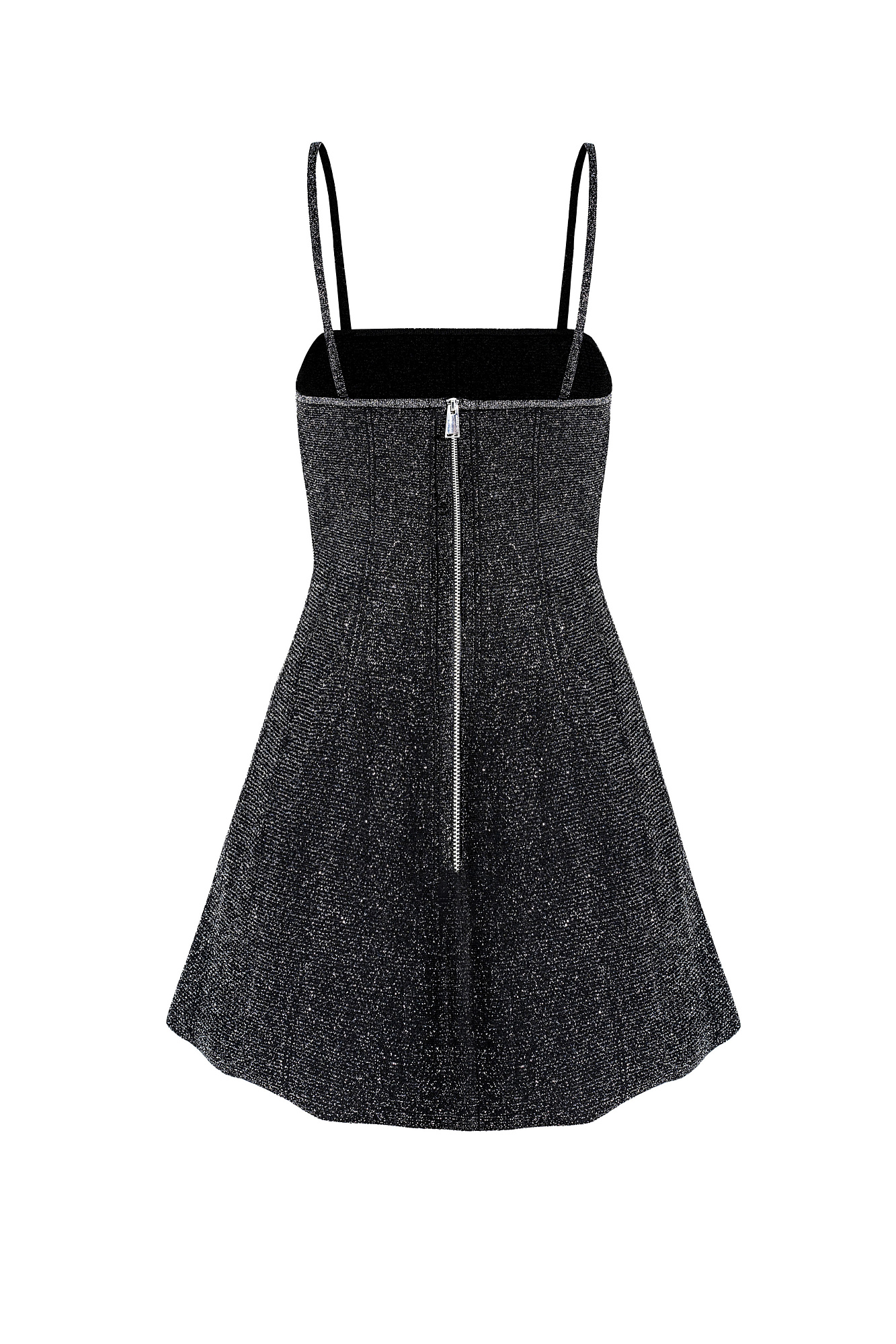 Трикотажное платье длины мини с люрексом. Модель приталенного силуэта на бретелях. Бретели снимаются. Застежка на молнию.