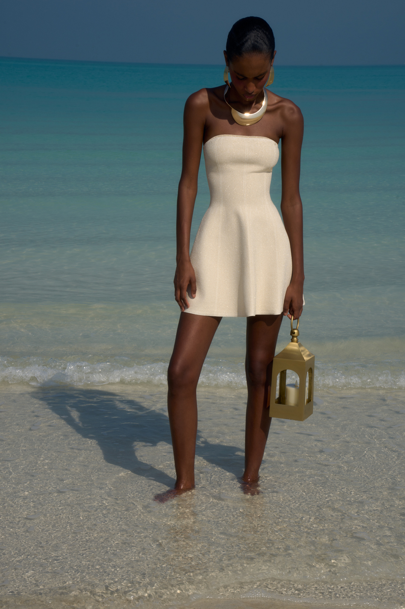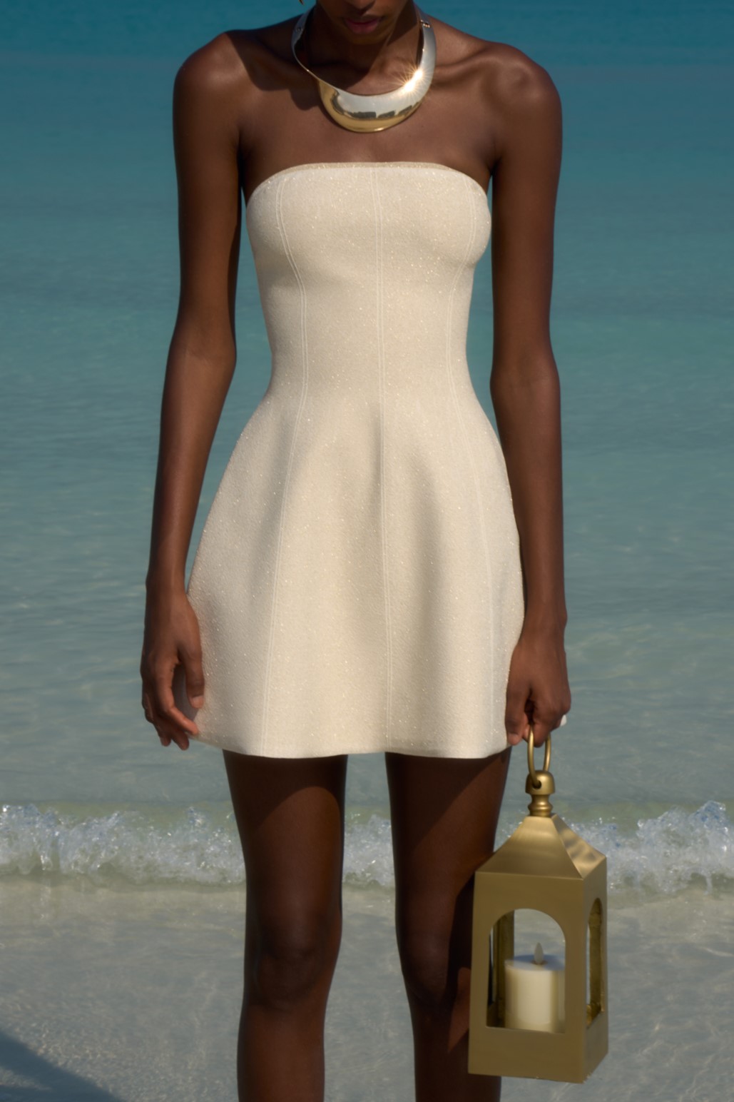 Трикотажное платье длины мини с люрексом. Модель приталенного силуэта на бретелях. Бретели снимаются. Застежка на молнию.