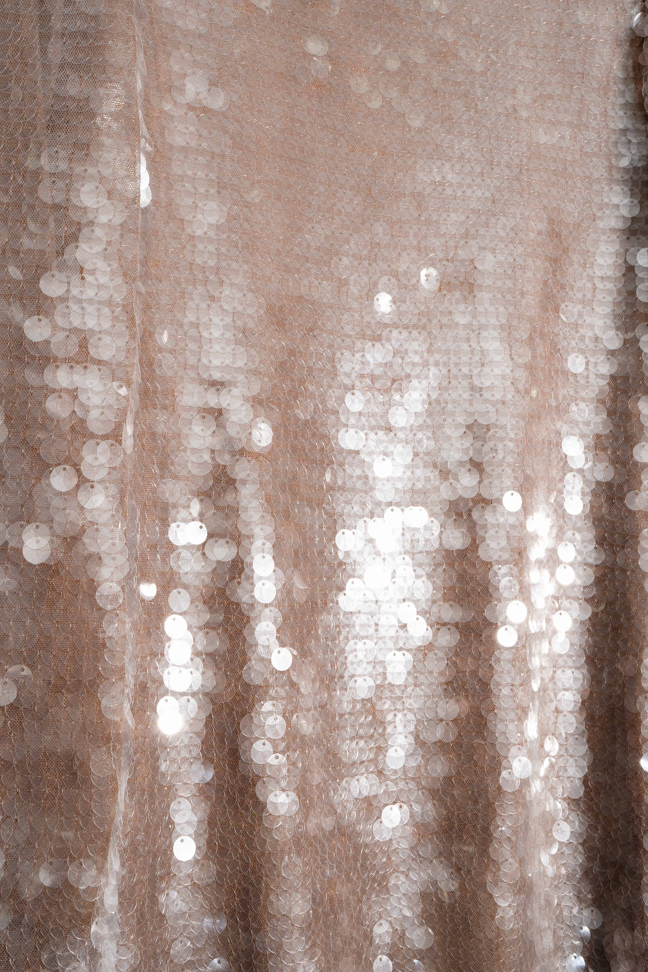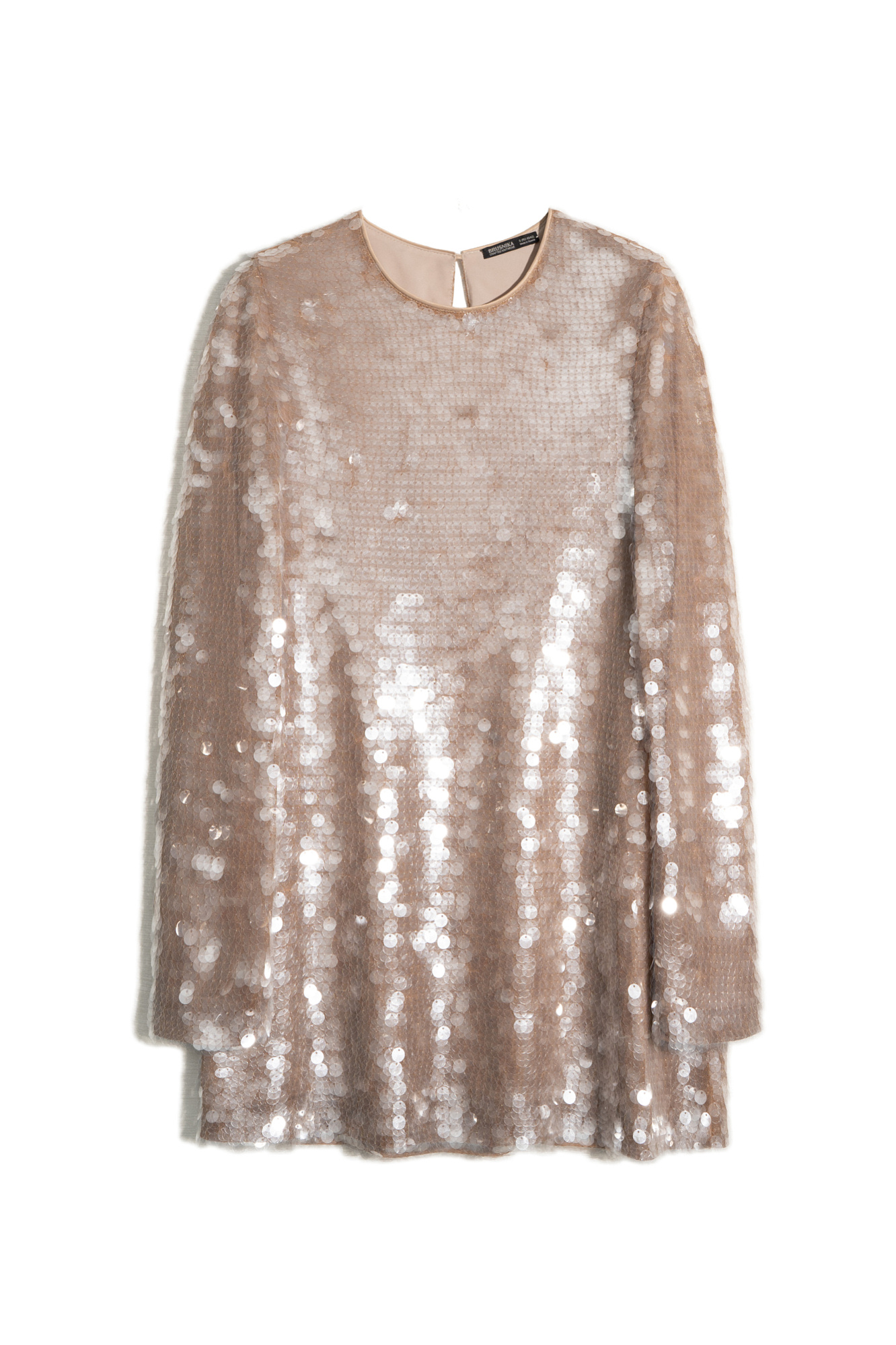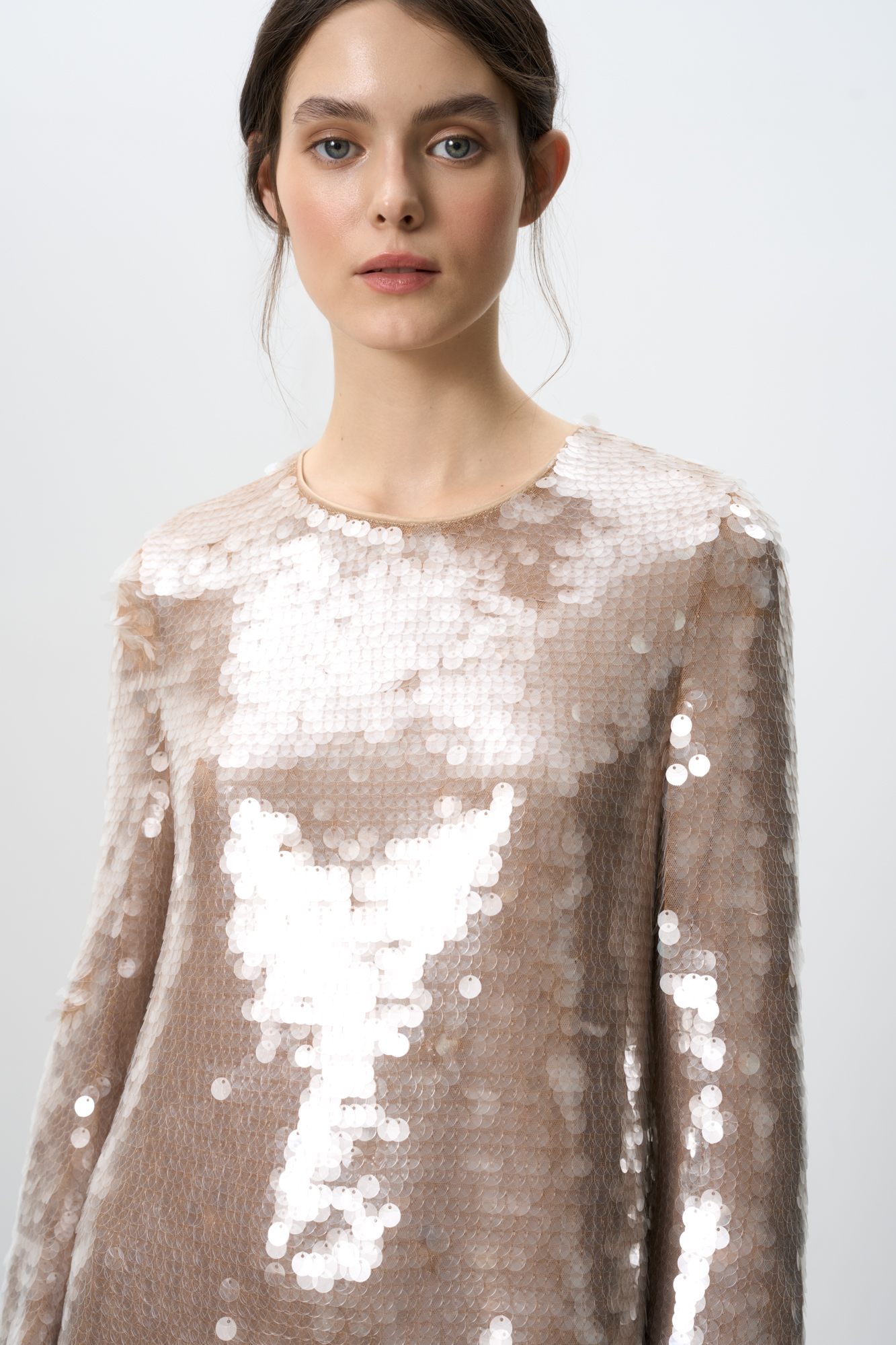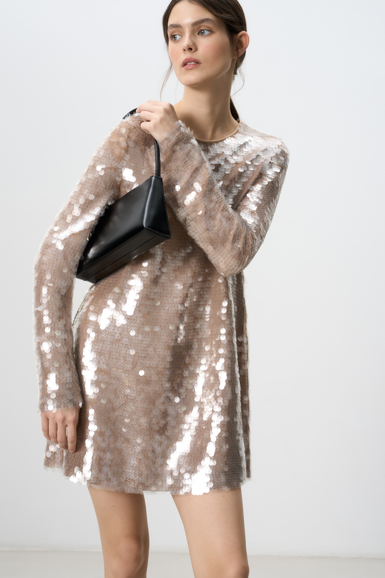 Платье длины мини, декорированное пайетками. Модель свободного силуэта с длинным рукавом и круглым вырезом горловины. Изделие на подкладке. Застежка на пуговицу.