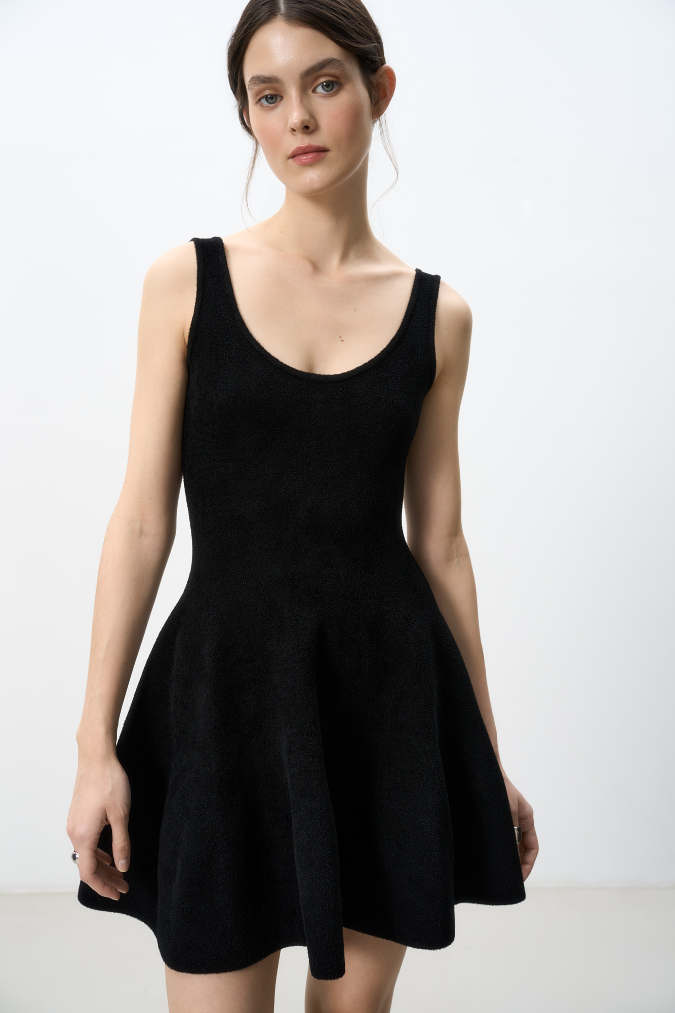 Трикотажное платье длины мини в стиле baby doll. Изделие связано из плотной эластичной вискозы, что позволяет платью сидеть по фигуре и поддержать форму юбки. Застежка сзади на молнию.