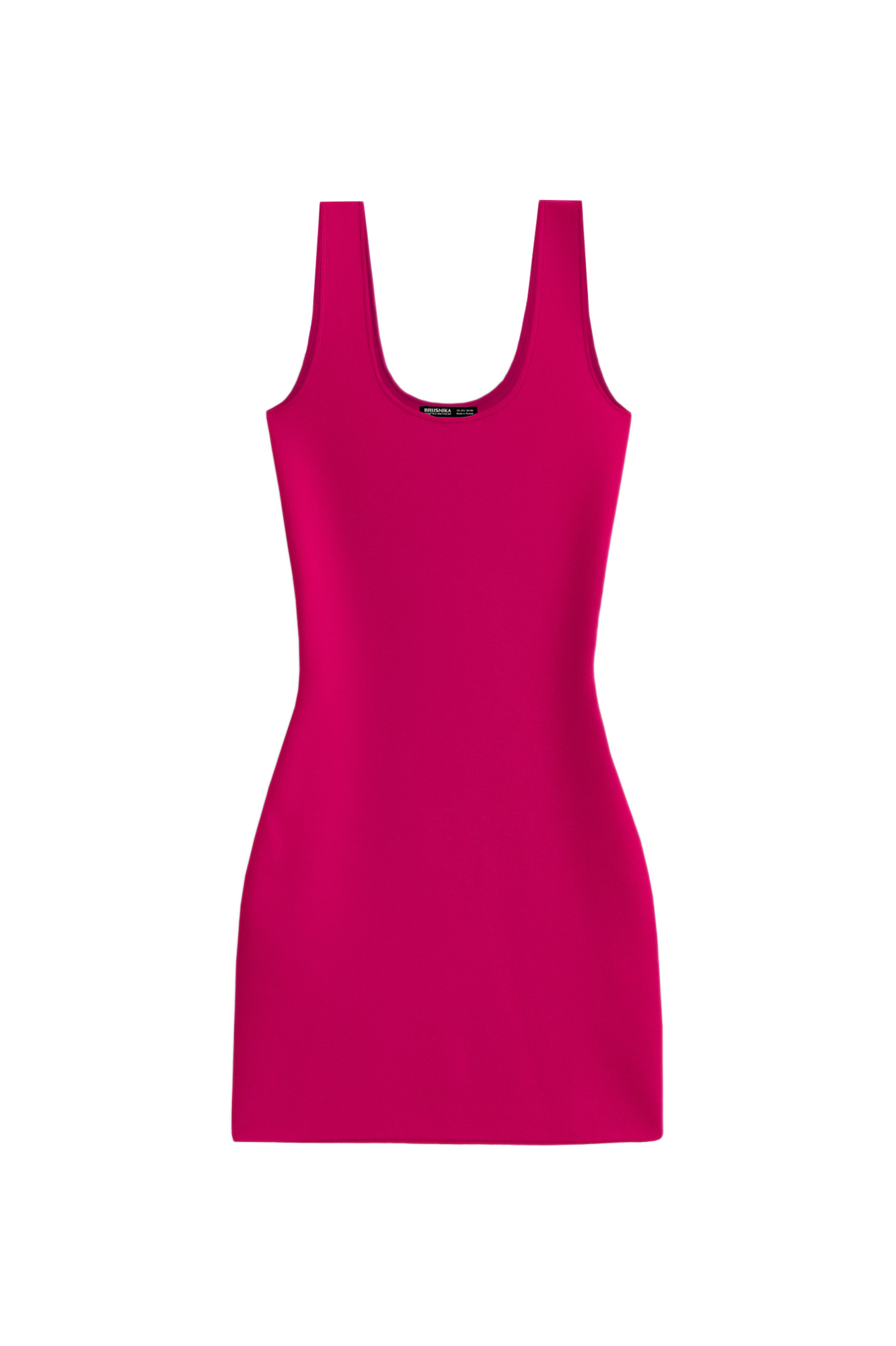 Трикотажное платье длины мини из вискозы. Модель облегающего силуэта с U-образным вырезом горловины и широкими бретелями.