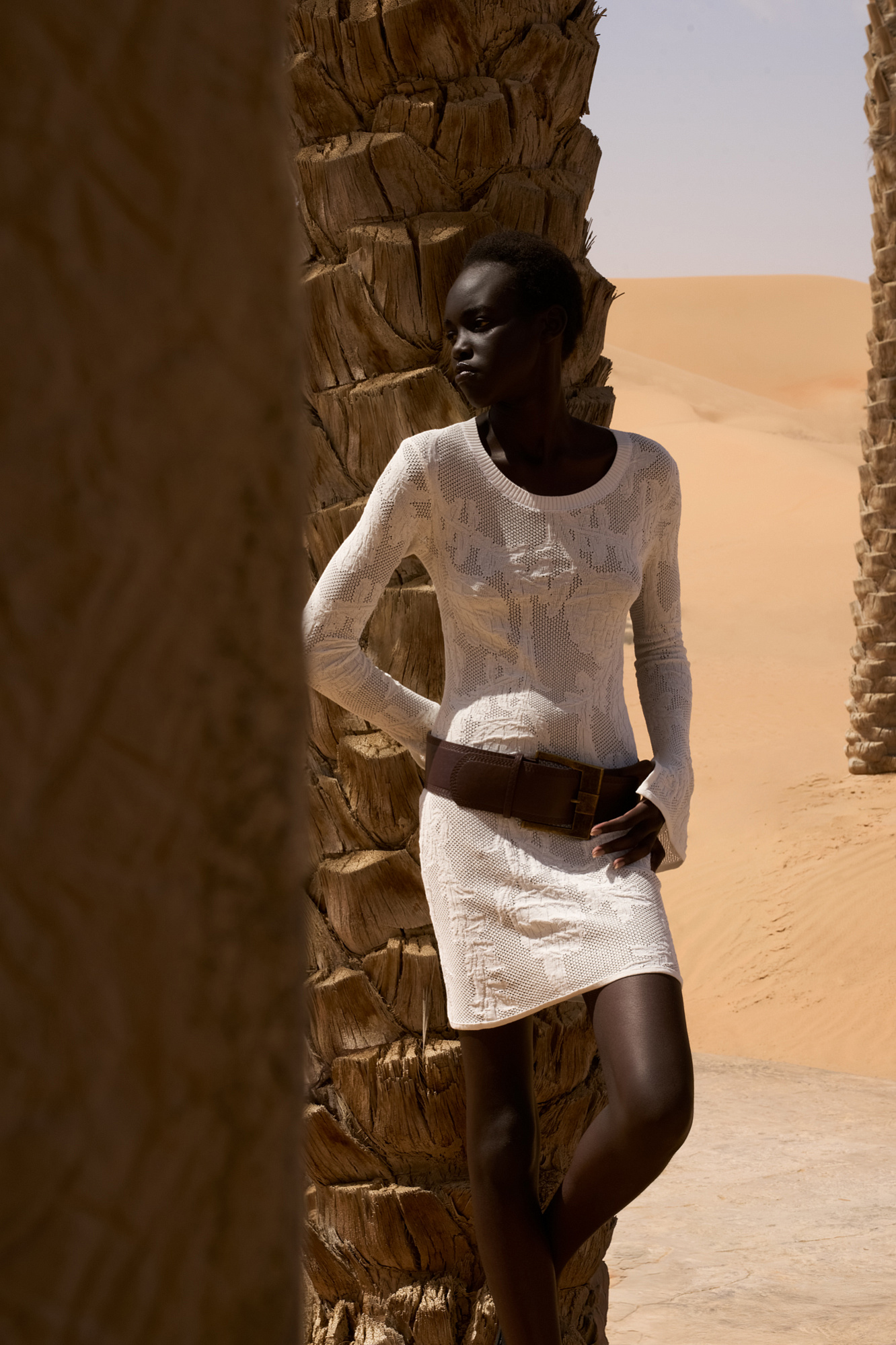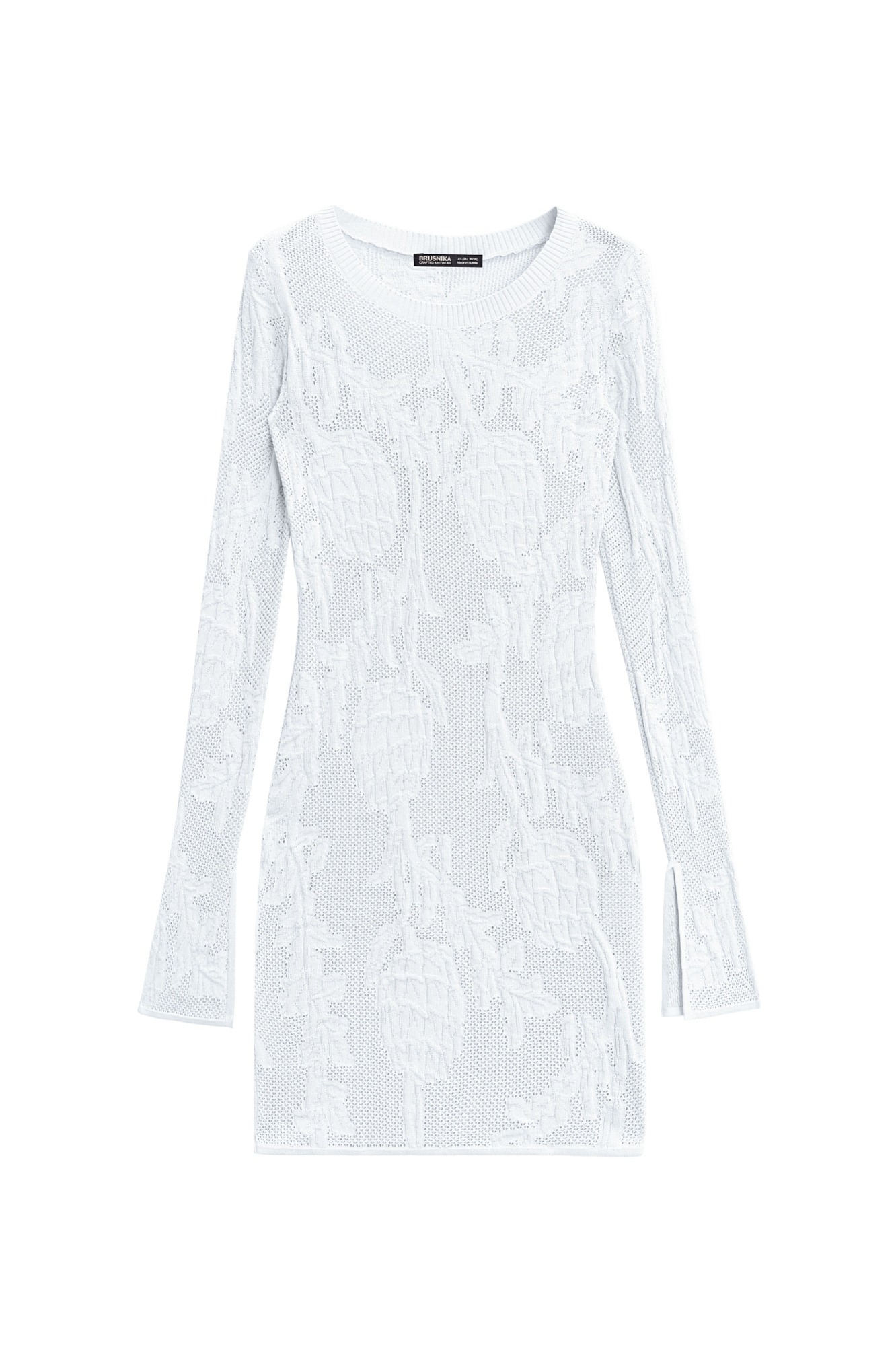 Трикотажное платье длины мини из органического хлопка. Модель приталенного силуэта, с длинными расклешенными рукавами разрезами на манжетах и круглым вырезом горловины. Изделие декорировано объемным растительным орнаментом.