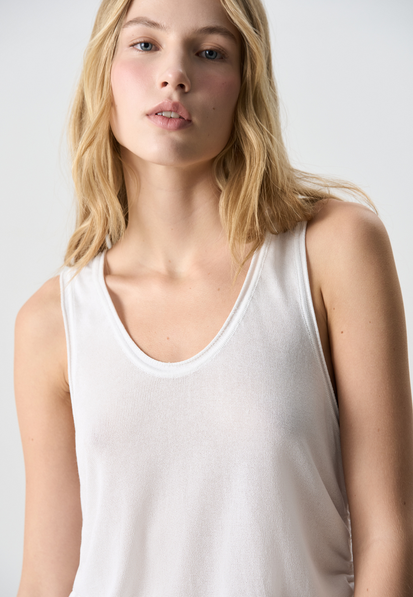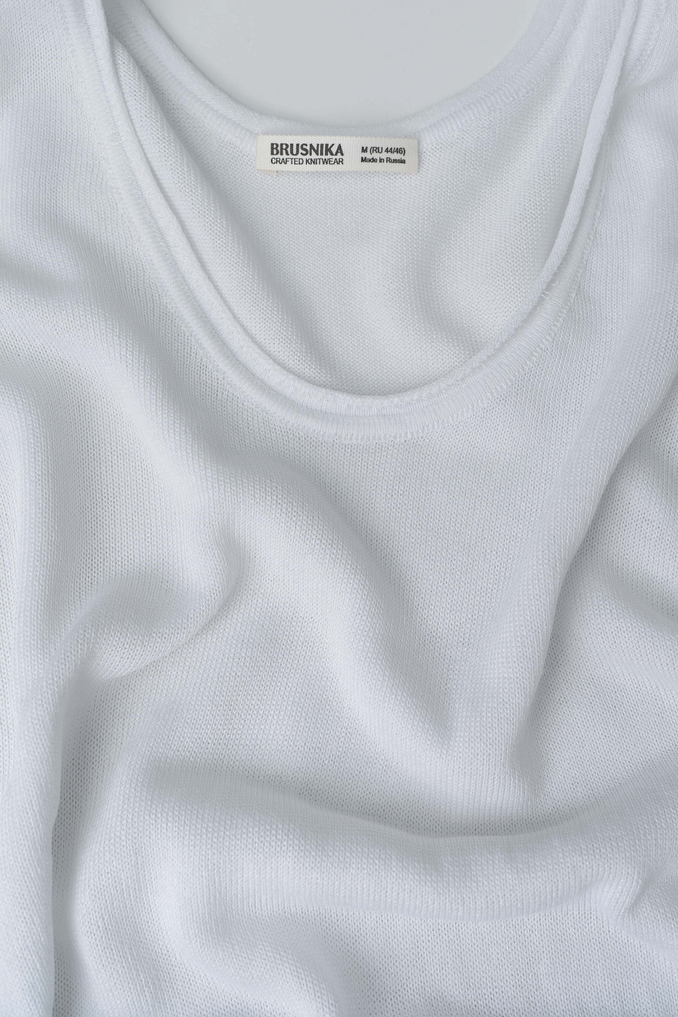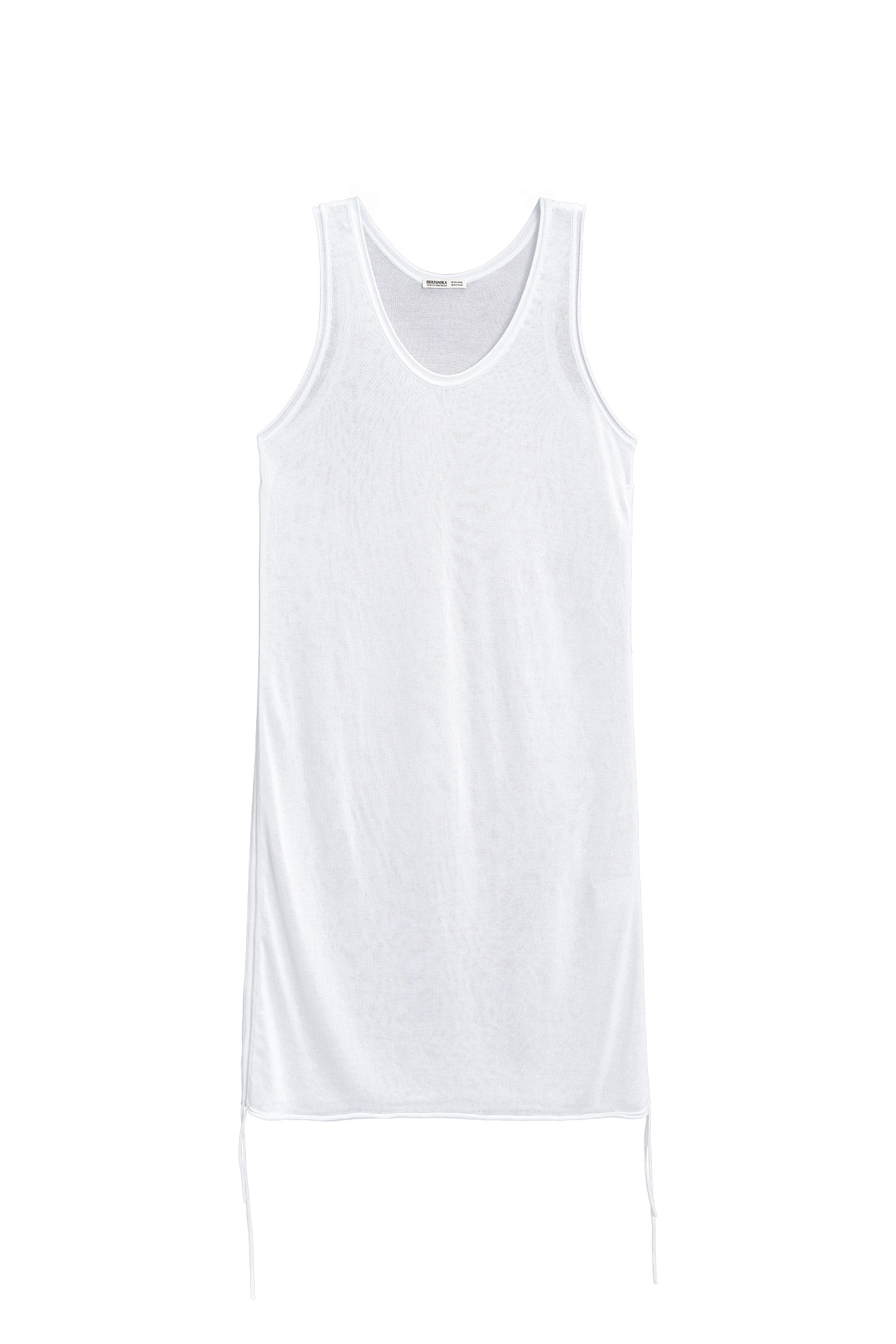 Трикотажное платье из вискозы. Модель свободного силуэта, без рукавов, на широких бретельках, с U-вырезом горловины и глубокой проймой. Кулиски по бокам изделия позволяют регулировать длину и создавать драпировку.