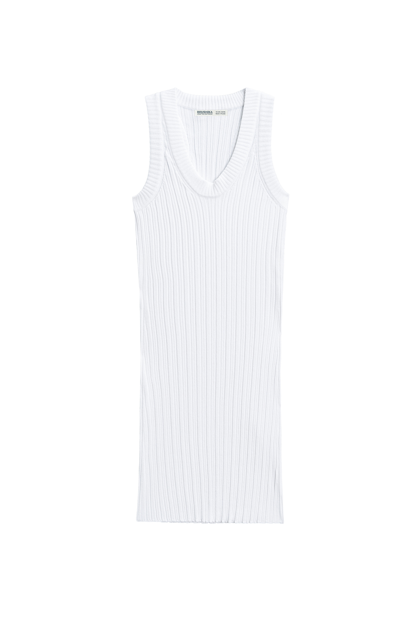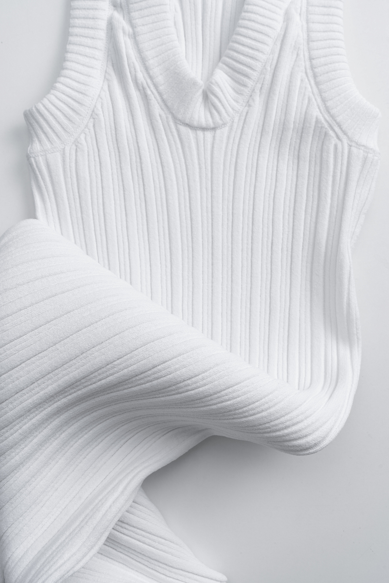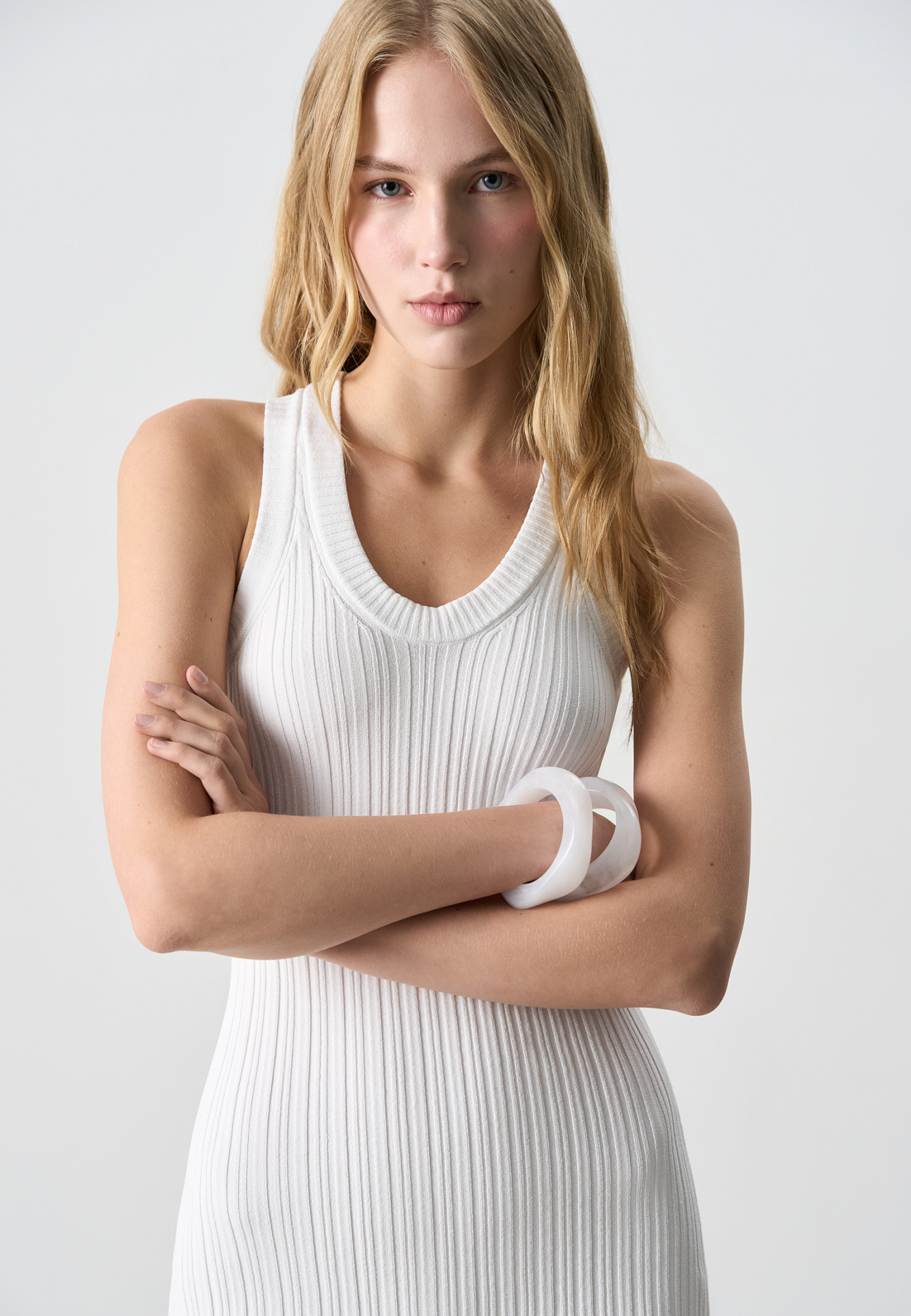 Платье длины мини из фактурного трикотажа на основе вискозы. Модель приталенного силуэта, без рукавов, на широких бретельках, с U-образным вырезом горловины. Изделие выполнено в широкий рубчик.