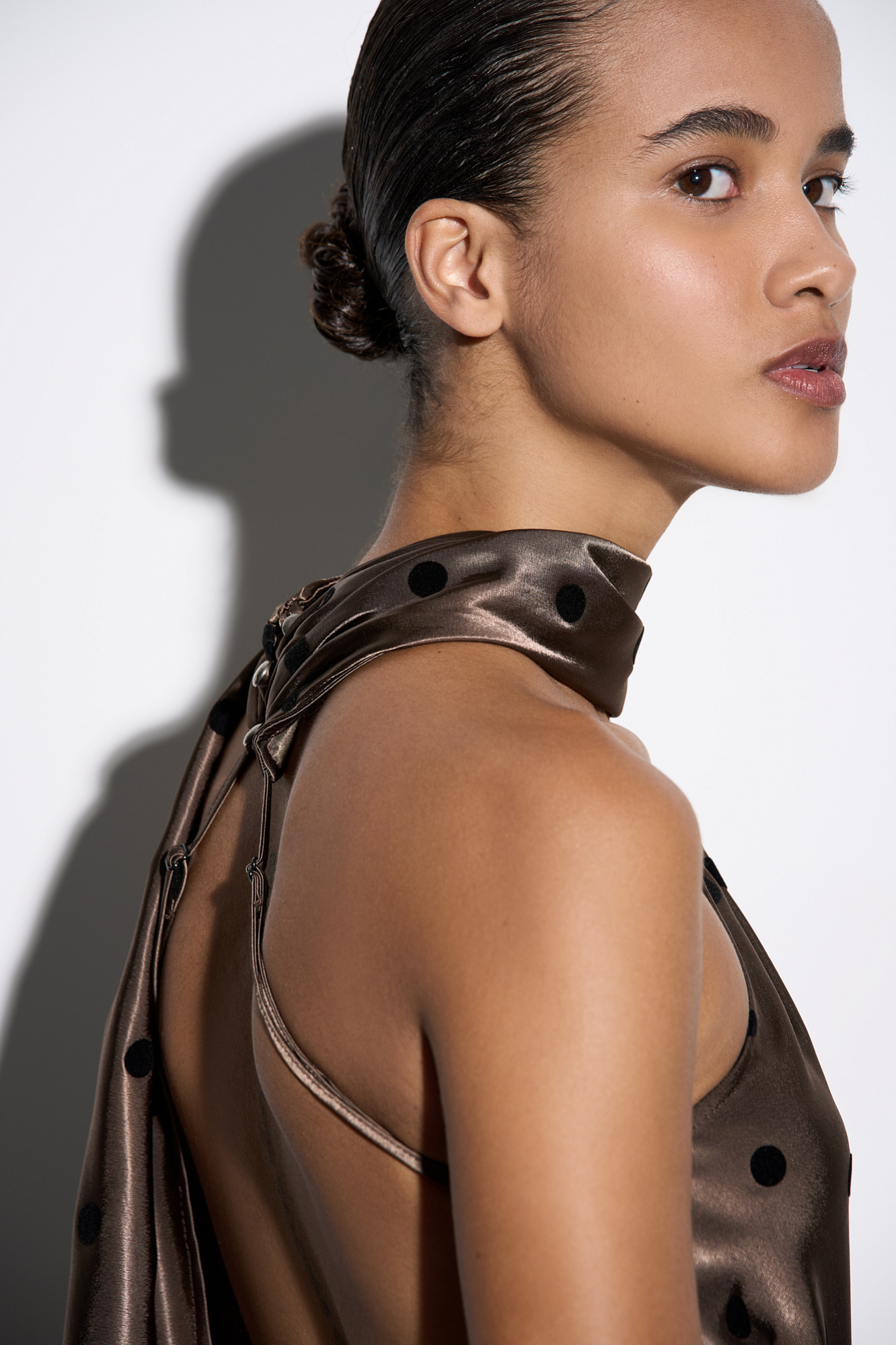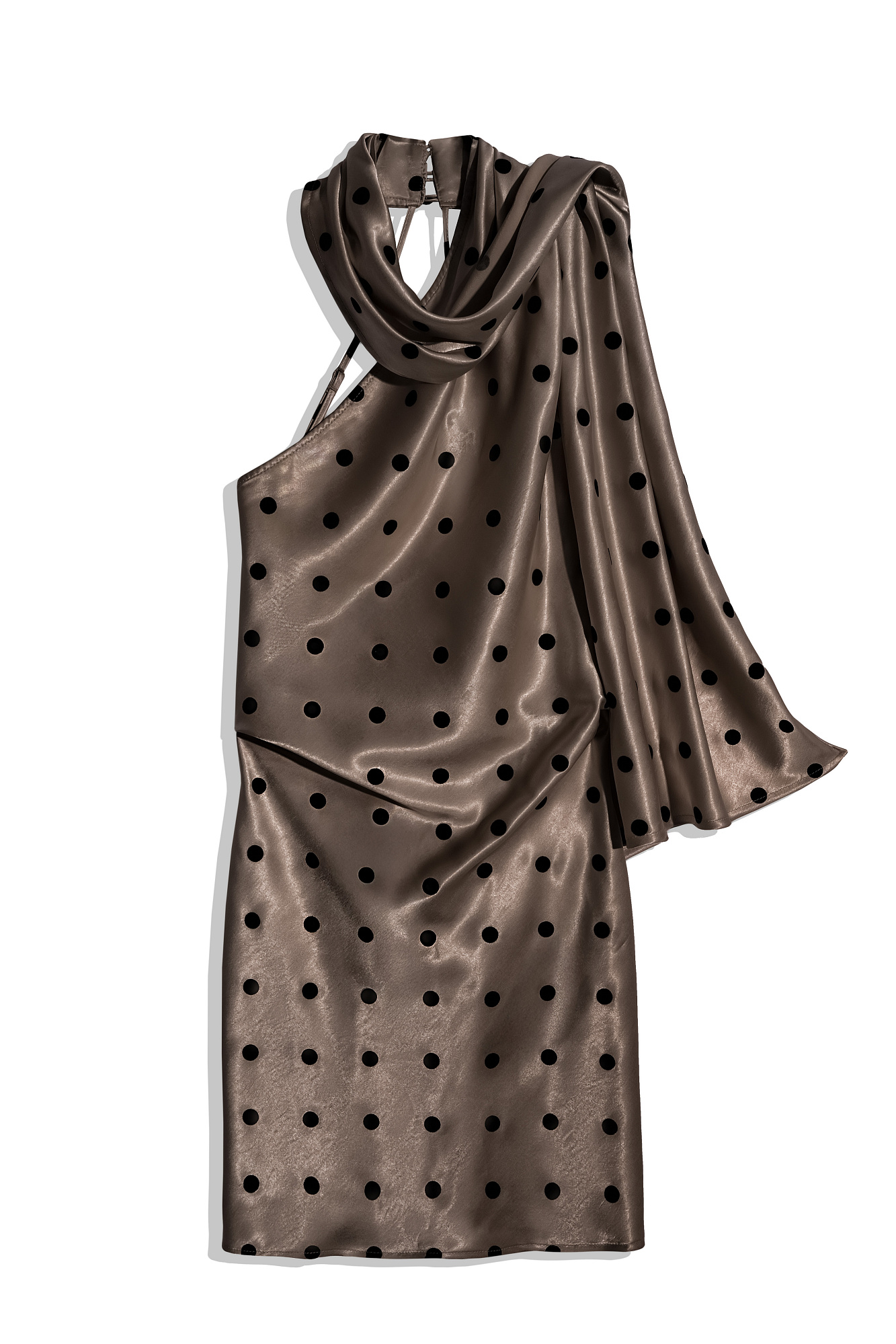 Атласное платье длины мини в горох. Модель по фигуре с вырезом халтер, застежкой на шее на пуговицы, открытой спинкой и тонкими регулируемыми бретельками. Изделие декорировано длинным шарфом.