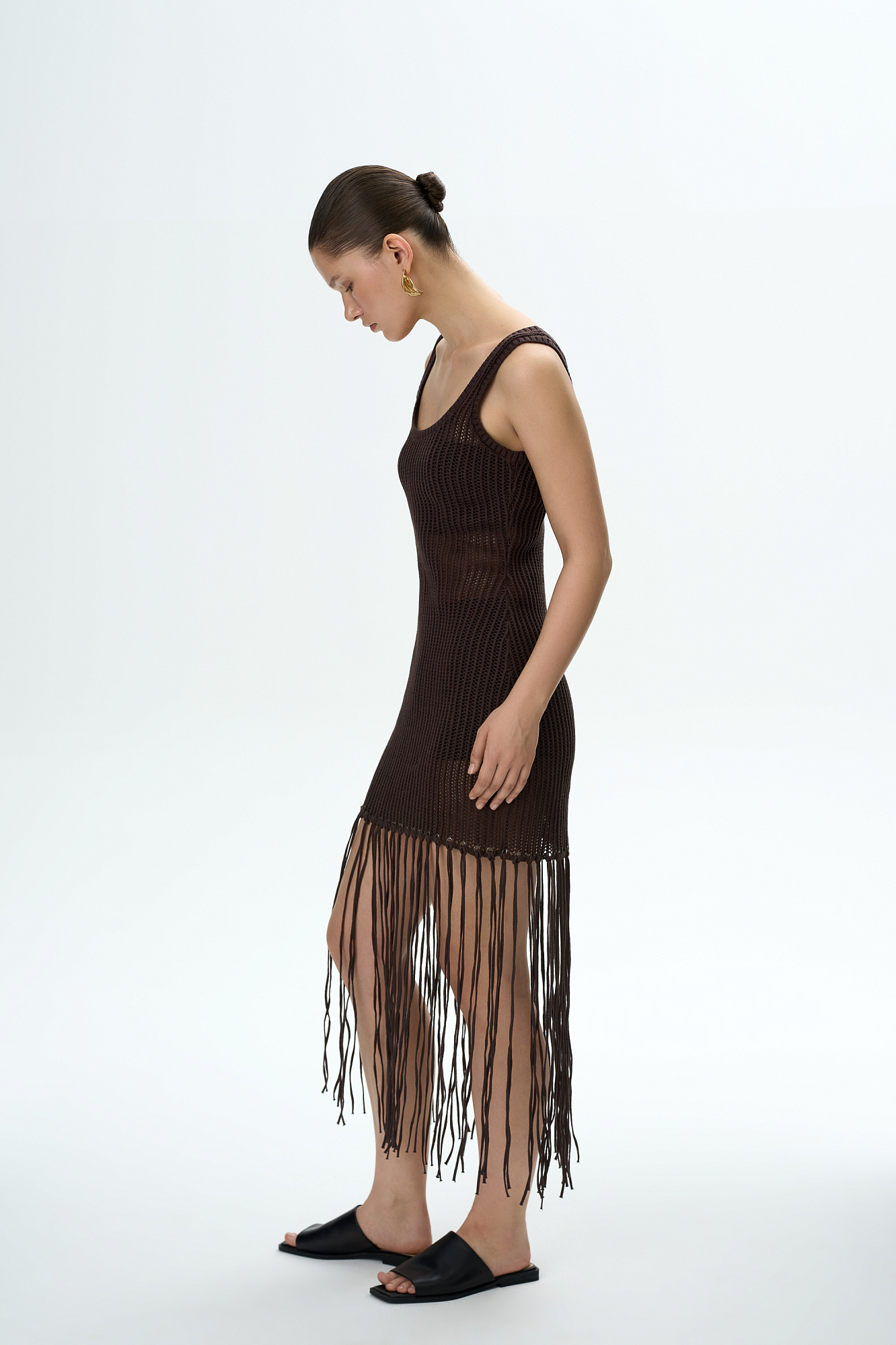 Трикотажный ажурный сарафан из 100% хлопка. Модель свободного кроя, без рукавов, на широких бретельках и U-образным вырезом. Изделие декорировано длинной бахромой.