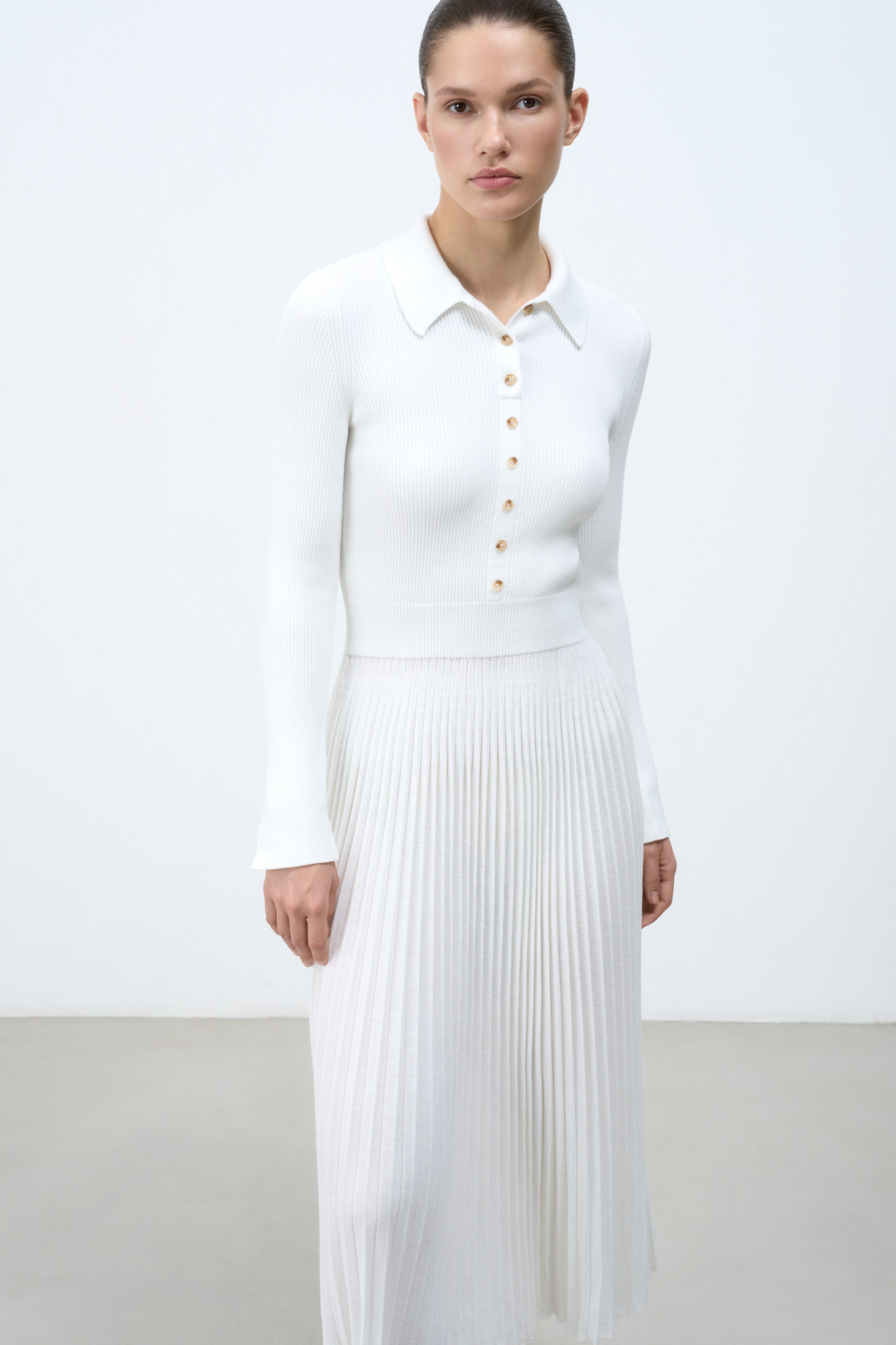 Трикотажное платье из вискозы с добавлением шерсти мериноса. Модель длины миди с плиссированной юбкой. Отложной воротник поло и планка с пуговицами на груди. Длинные рукава с разрезами.