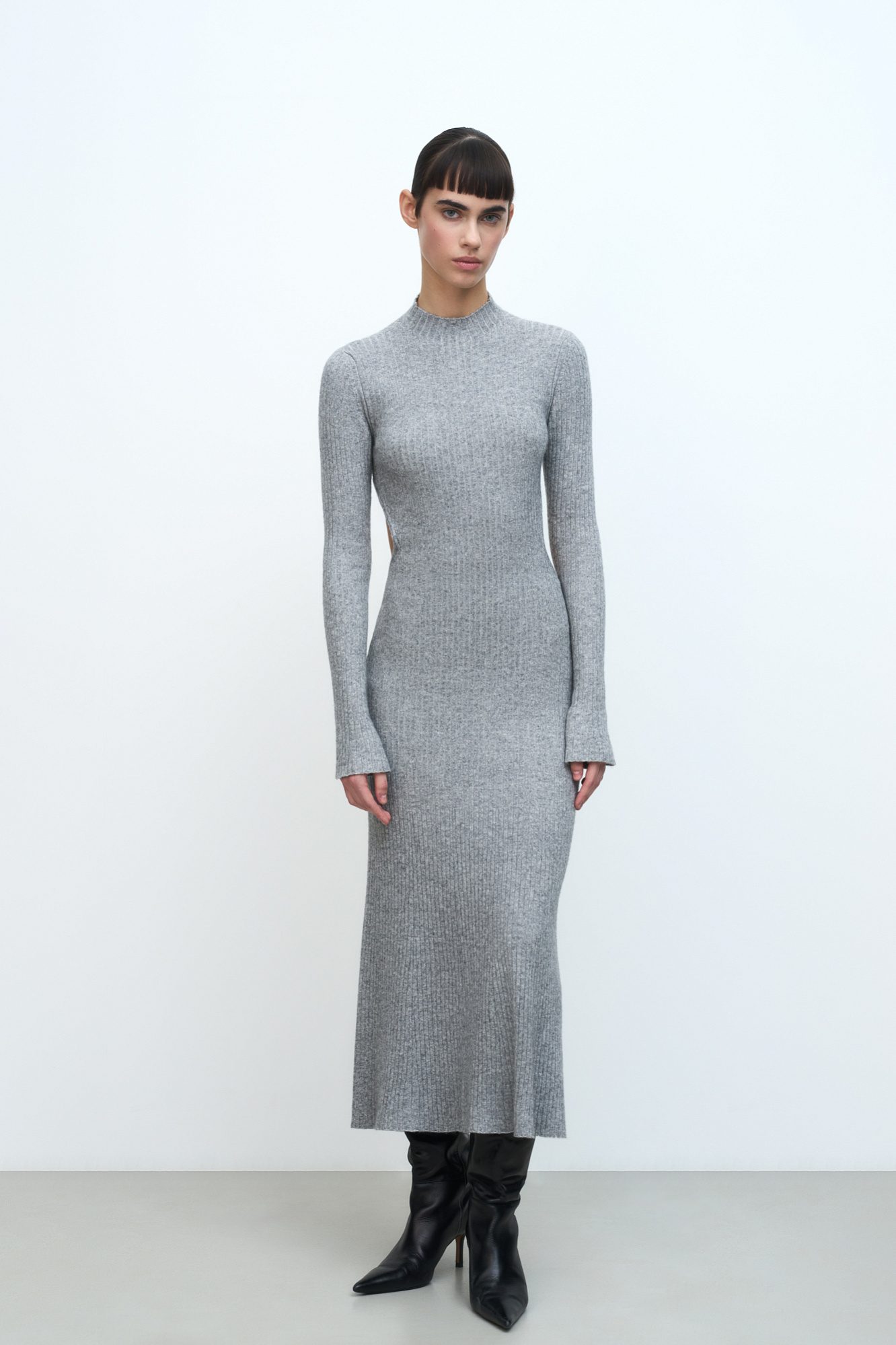 Трикотажное платье из кашемира и шерсти. Модель приталенного силуэта с длинными рукавами, расклешенными рукавами и невысоким воротником. Изделие декорировано глубоким вырезом на спине.