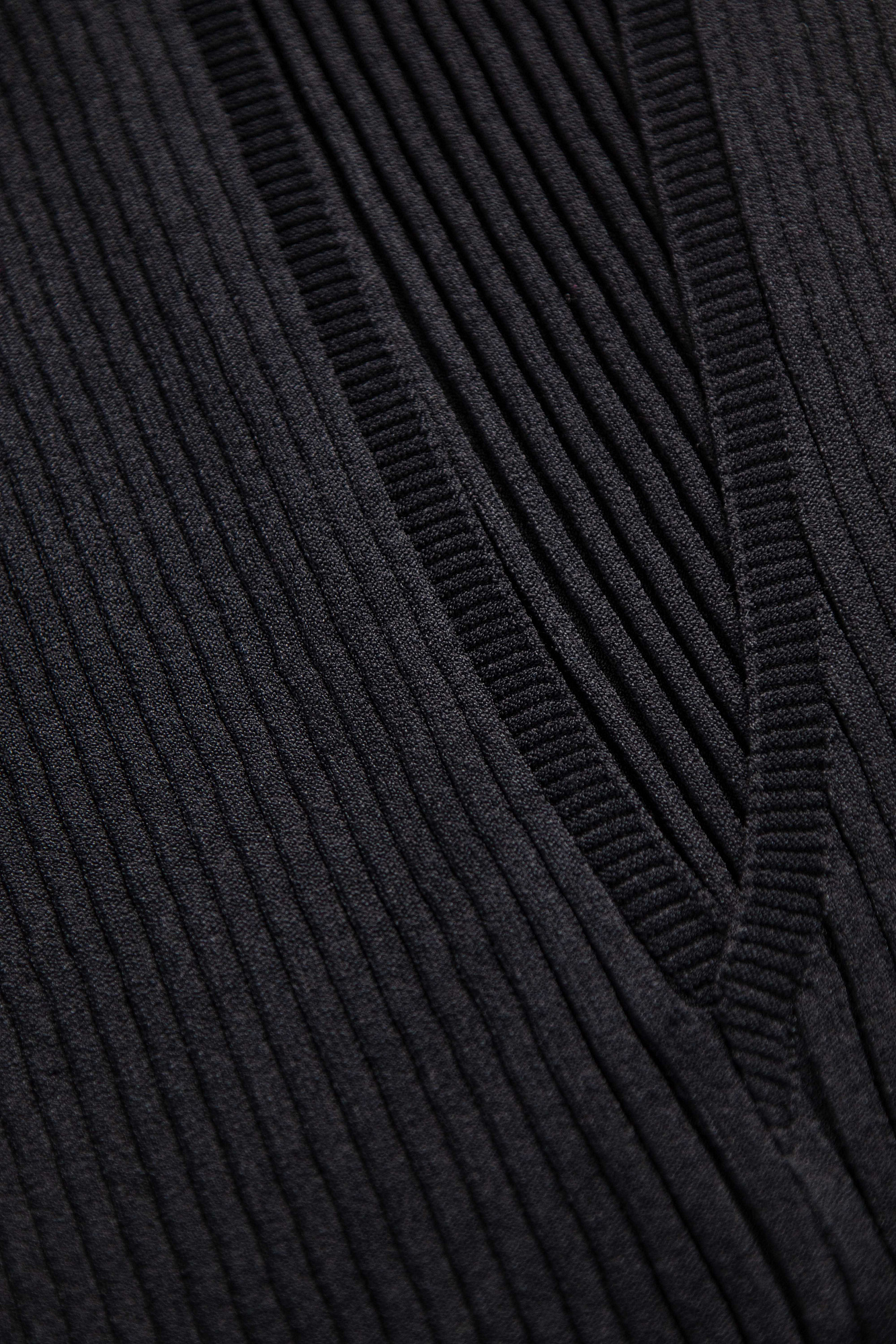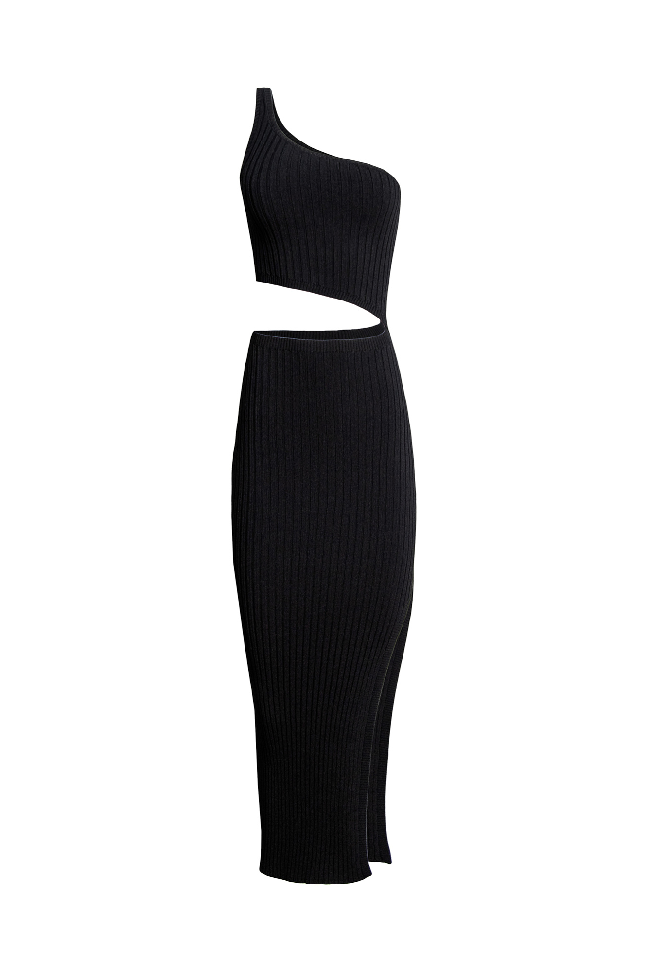 Силуэтное платье миди из мягкой вискозы в широкий рубчик. Широкая бретель на одно плечо и акцентные вырезы.