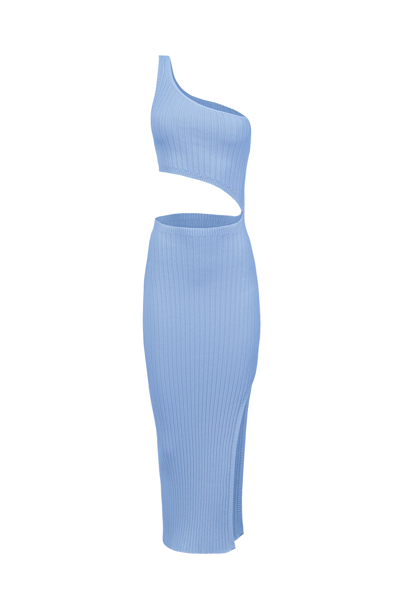 Силуэтное платье миди из мягкой вискозы в широкий рубчик. Широкая бретель на одно плечо и акцентные вырезы.
