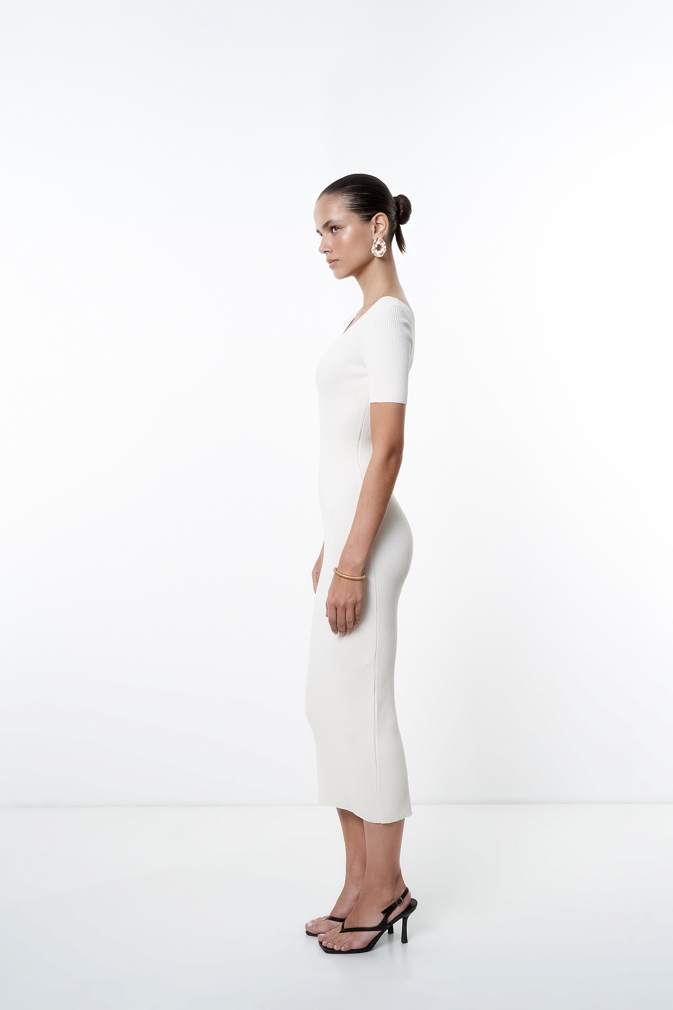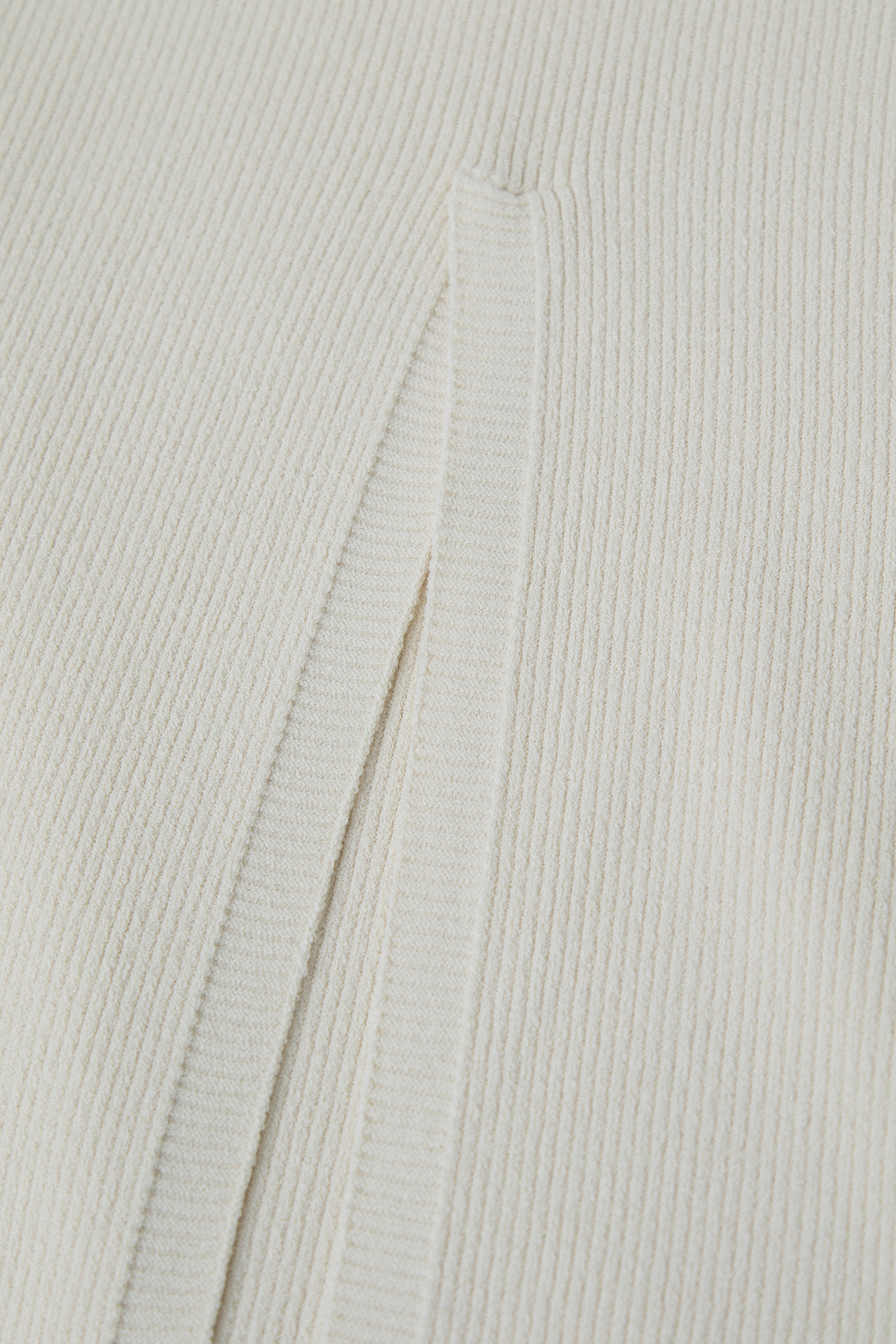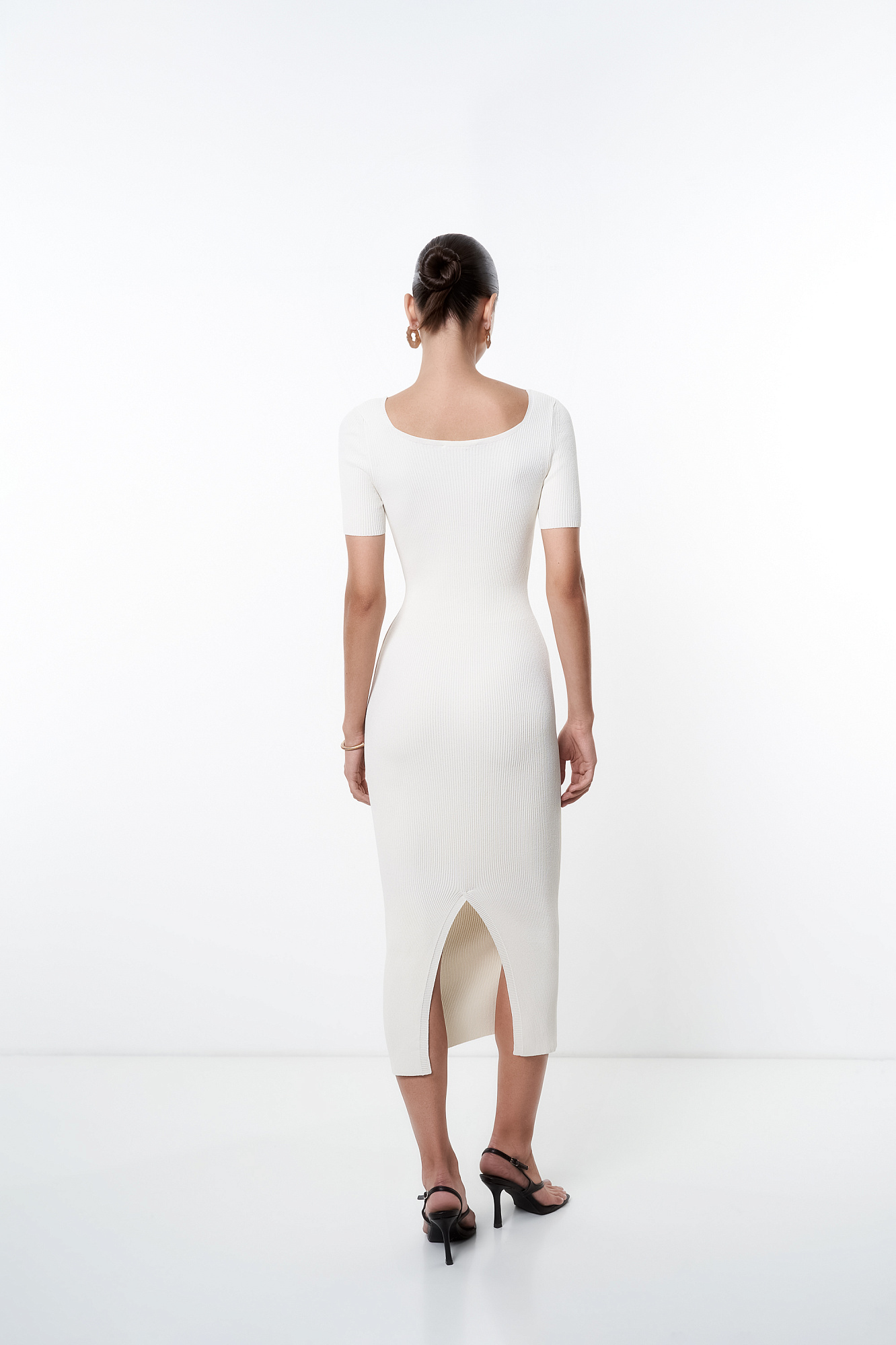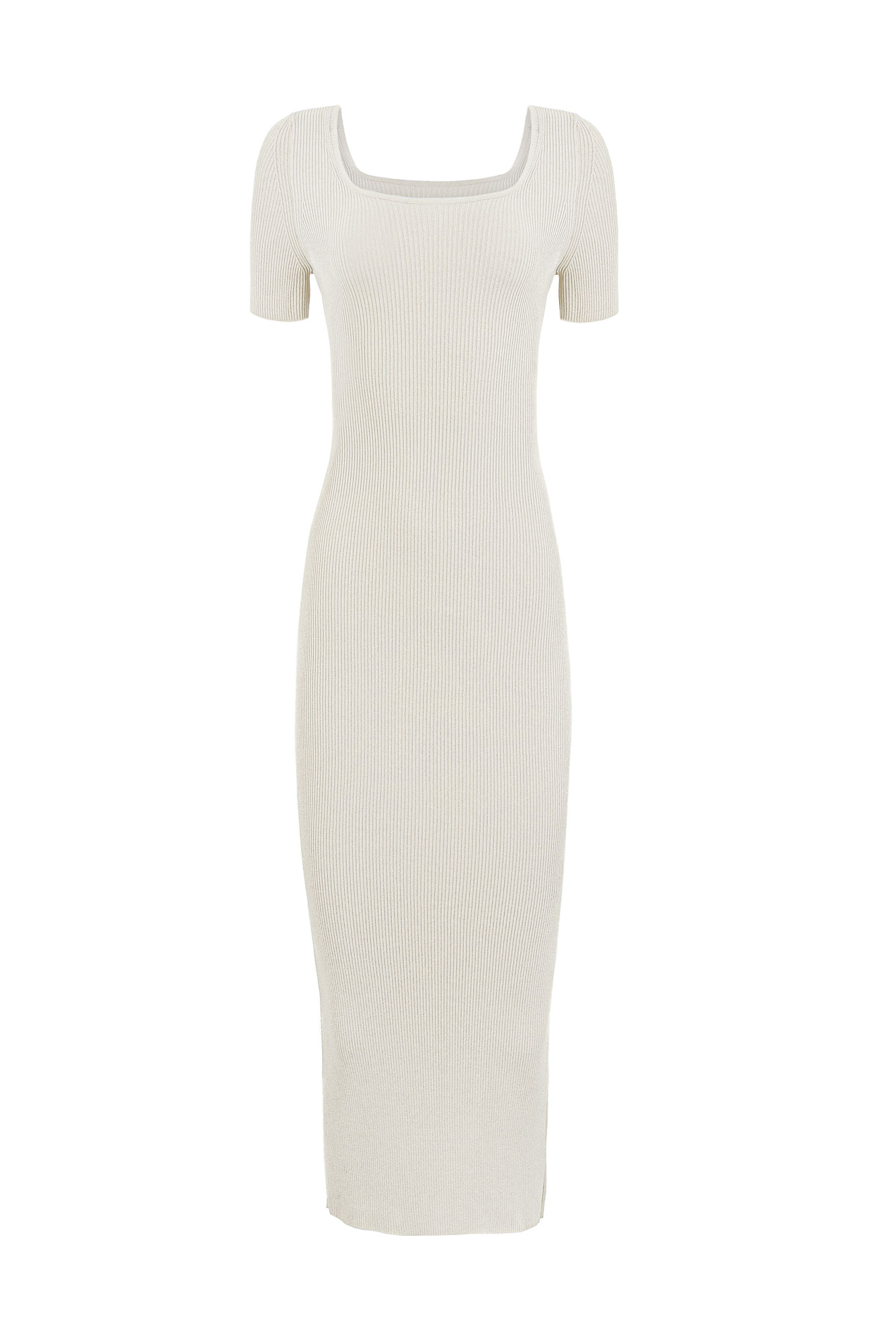 Трикотажное платье из вискозы в рубчик. Модель облегающего силуэта, с короткими рукавами, широким округлым вырезом горловины и разрезом сзади.