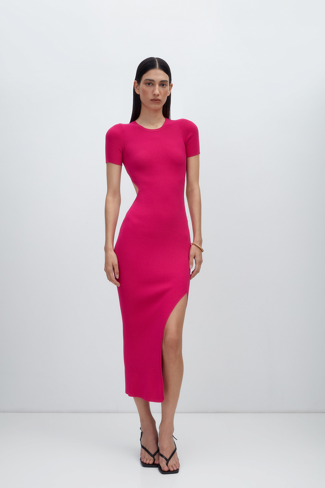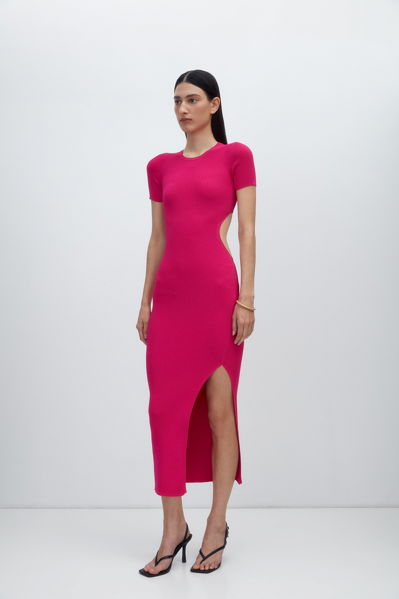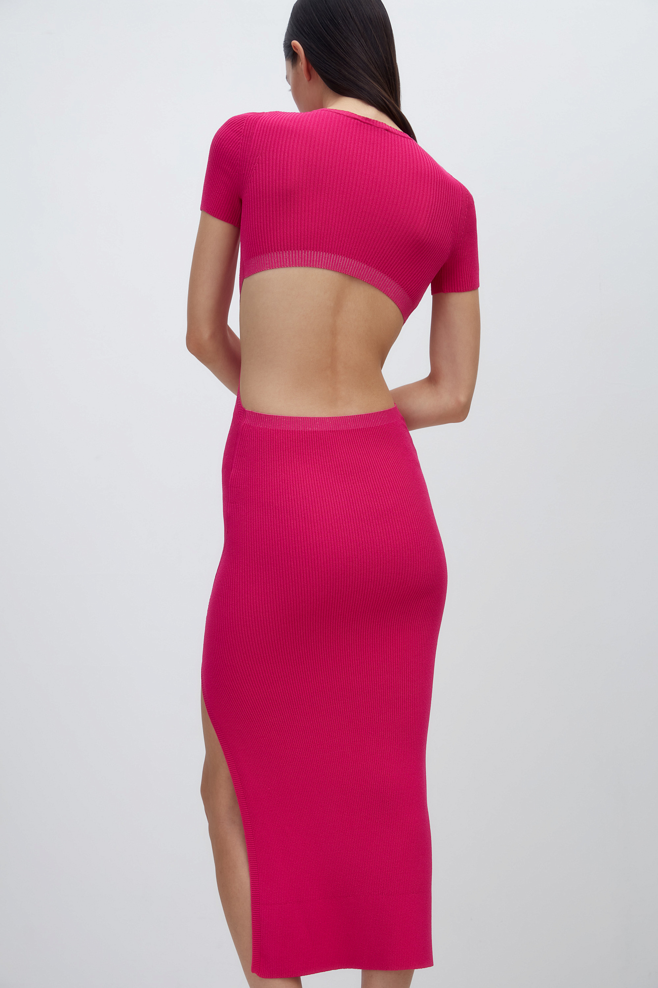 Облегающее трикотажное платье длины миди из вискозы. Модель приталенного силуэта, с короткими рукавами, круглым вырезом горловины, вырезом на спине и высоким разрезом сбоку.