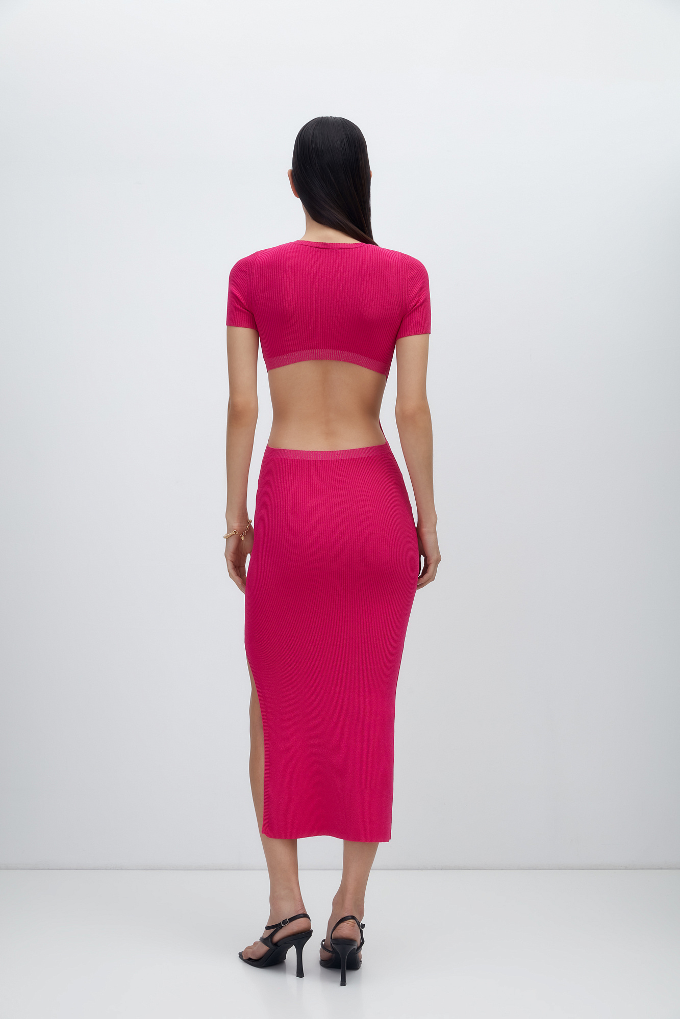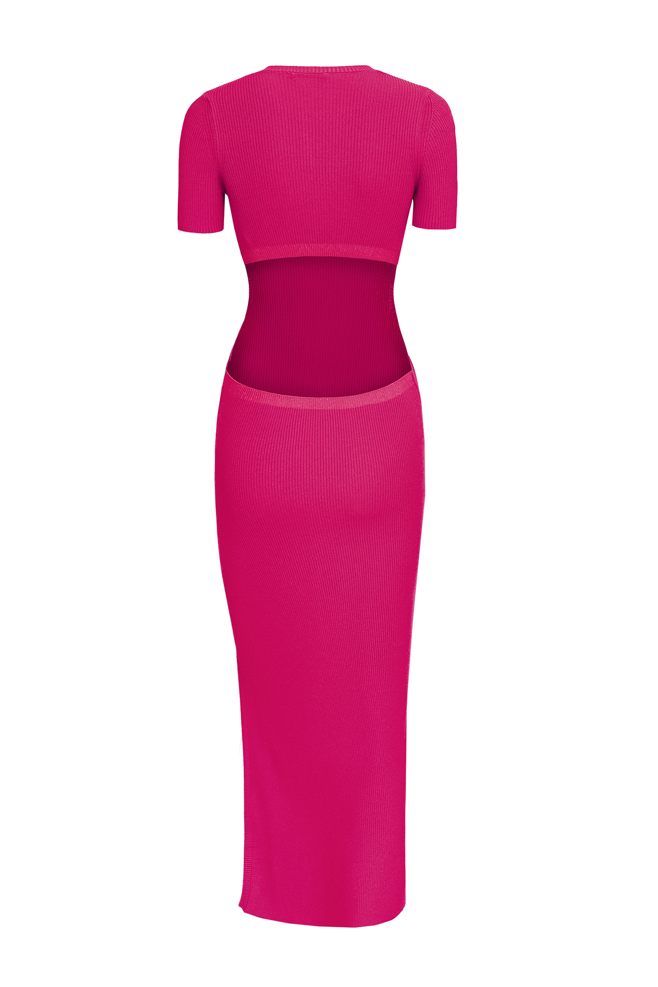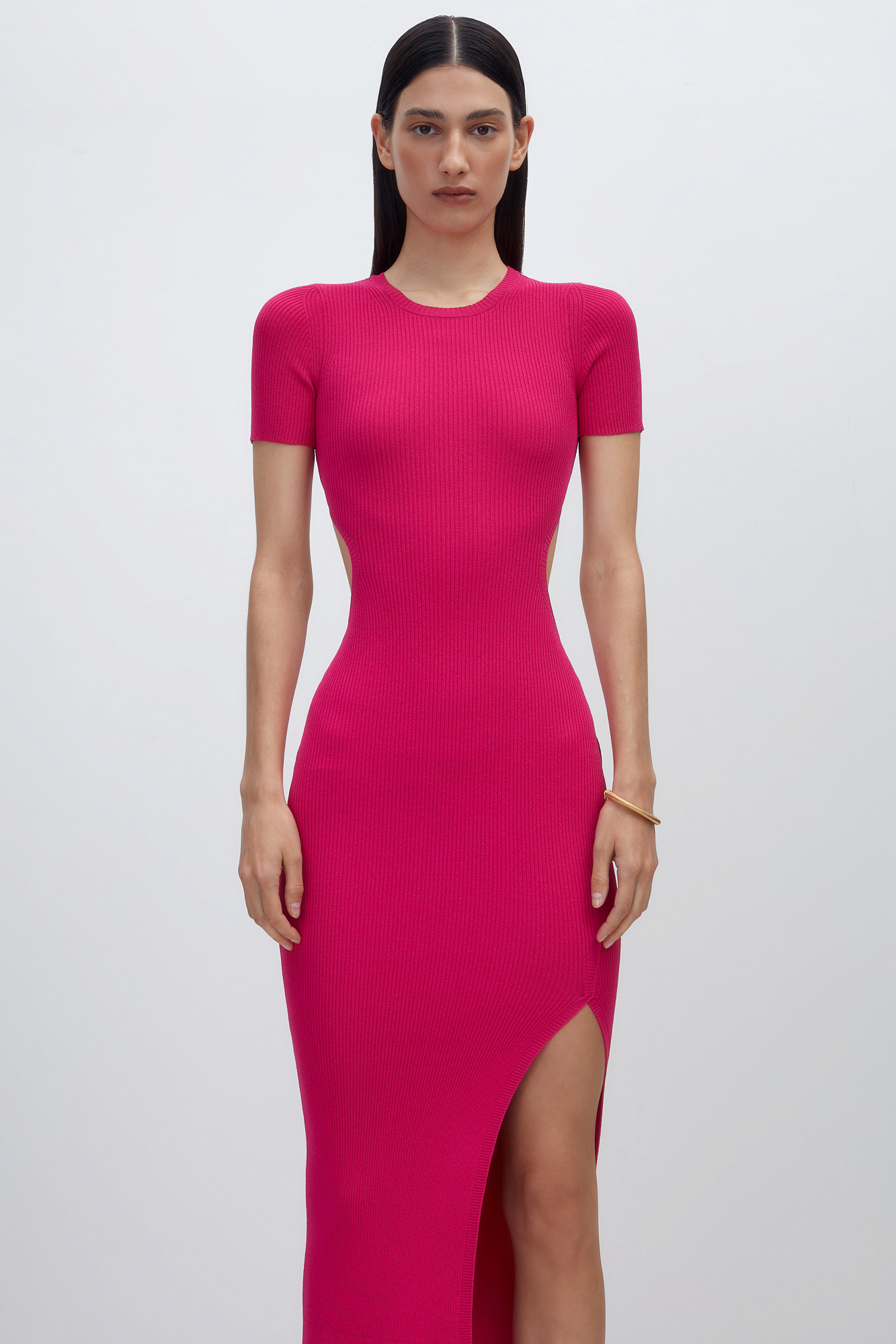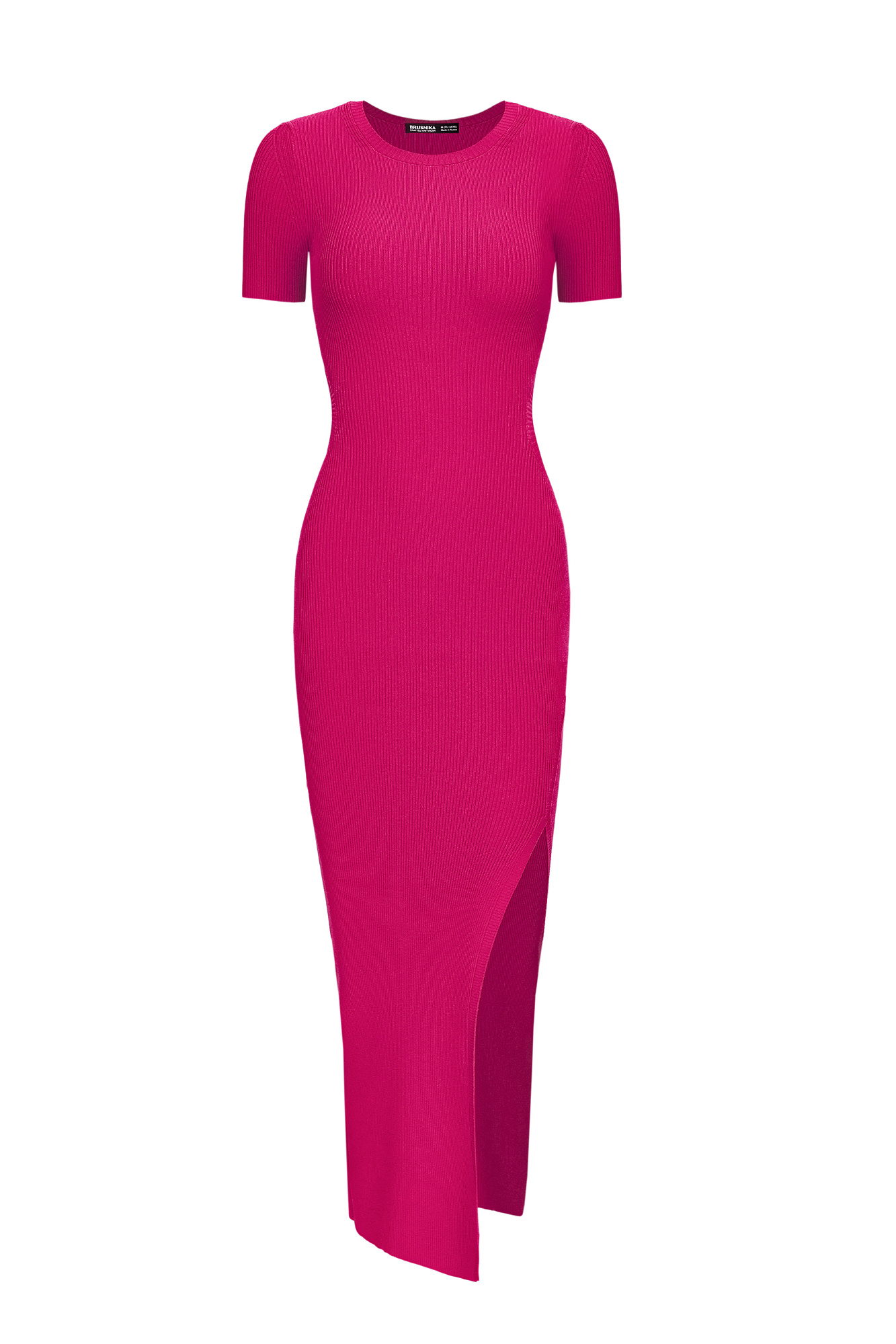 Облегающее трикотажное платье длины миди из вискозы. Модель приталенного силуэта, с короткими рукавами, круглым вырезом горловины, вырезом на спине и высоким разрезом сбоку.
