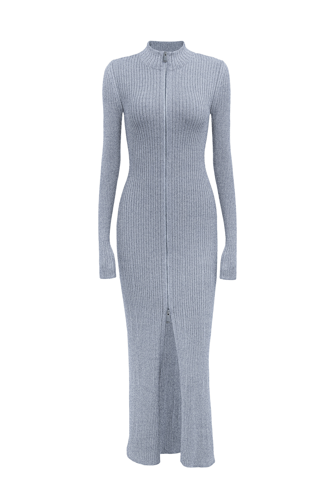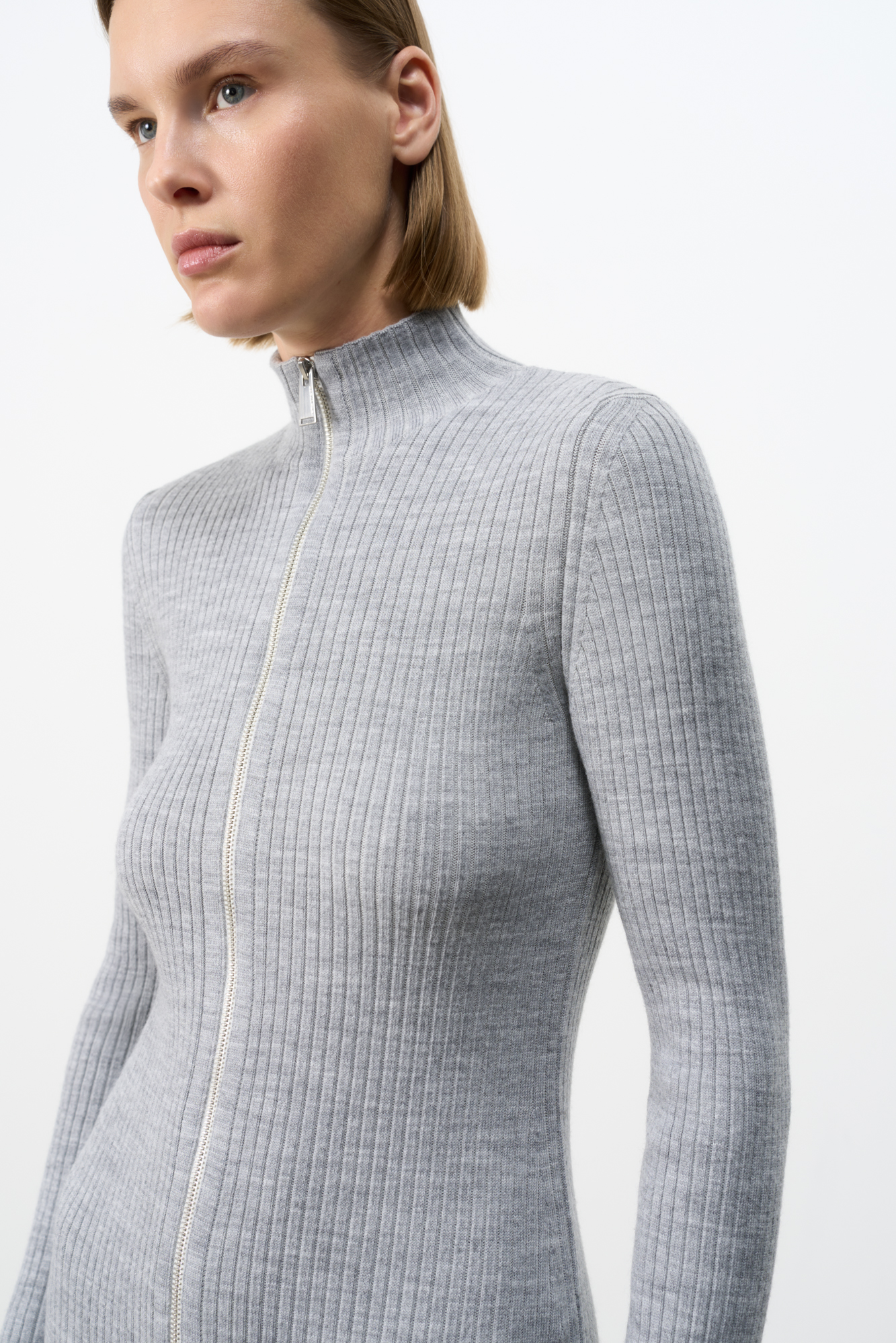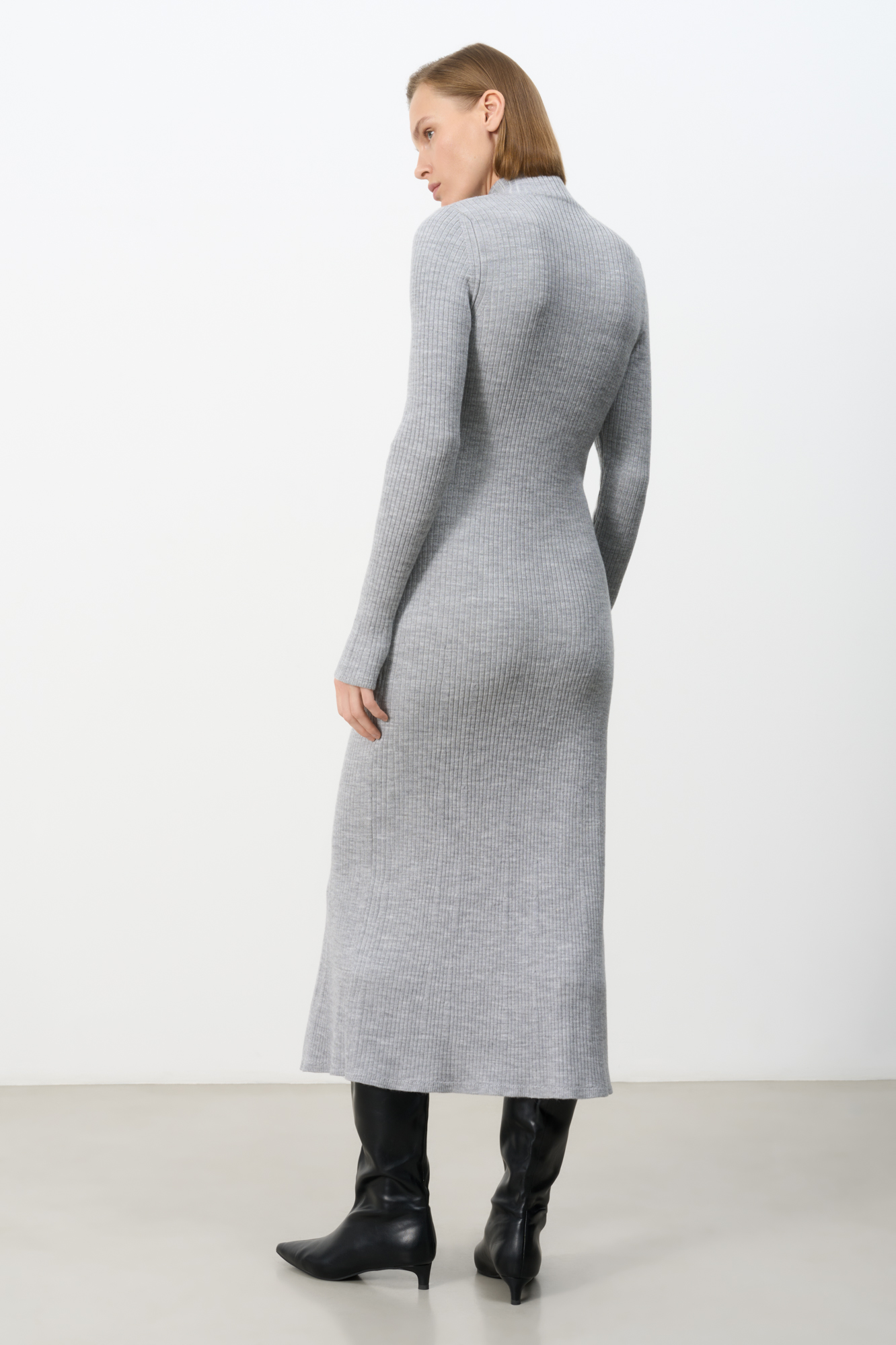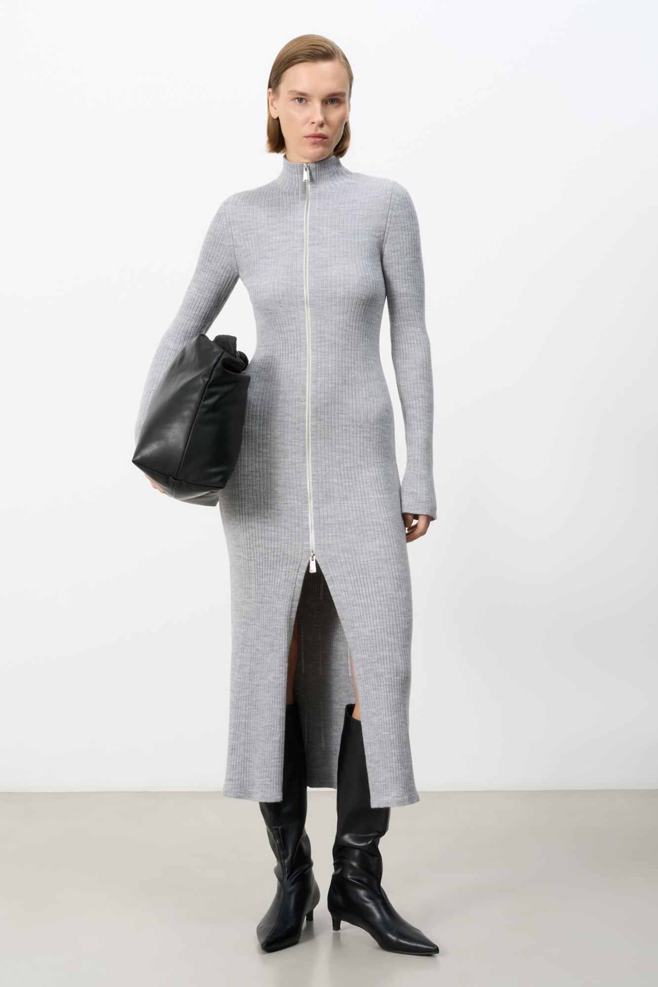 Трикотажное платье из смесовой шерсти. Модель приталенного силуэта длины миди с высоким фронтальным разрезом и застежкой на молнию.