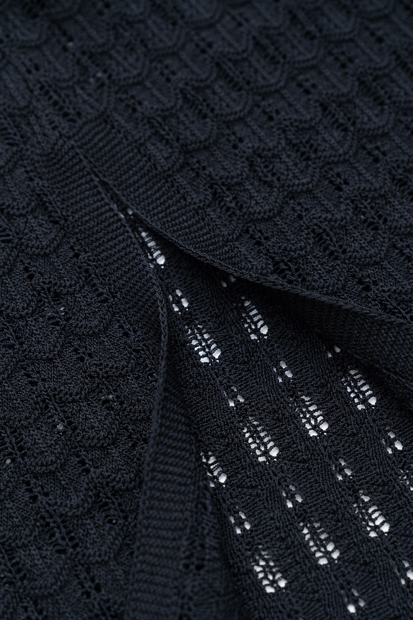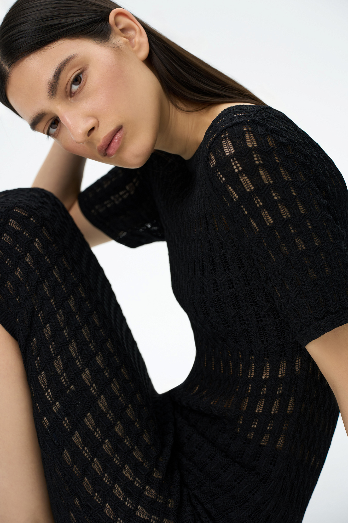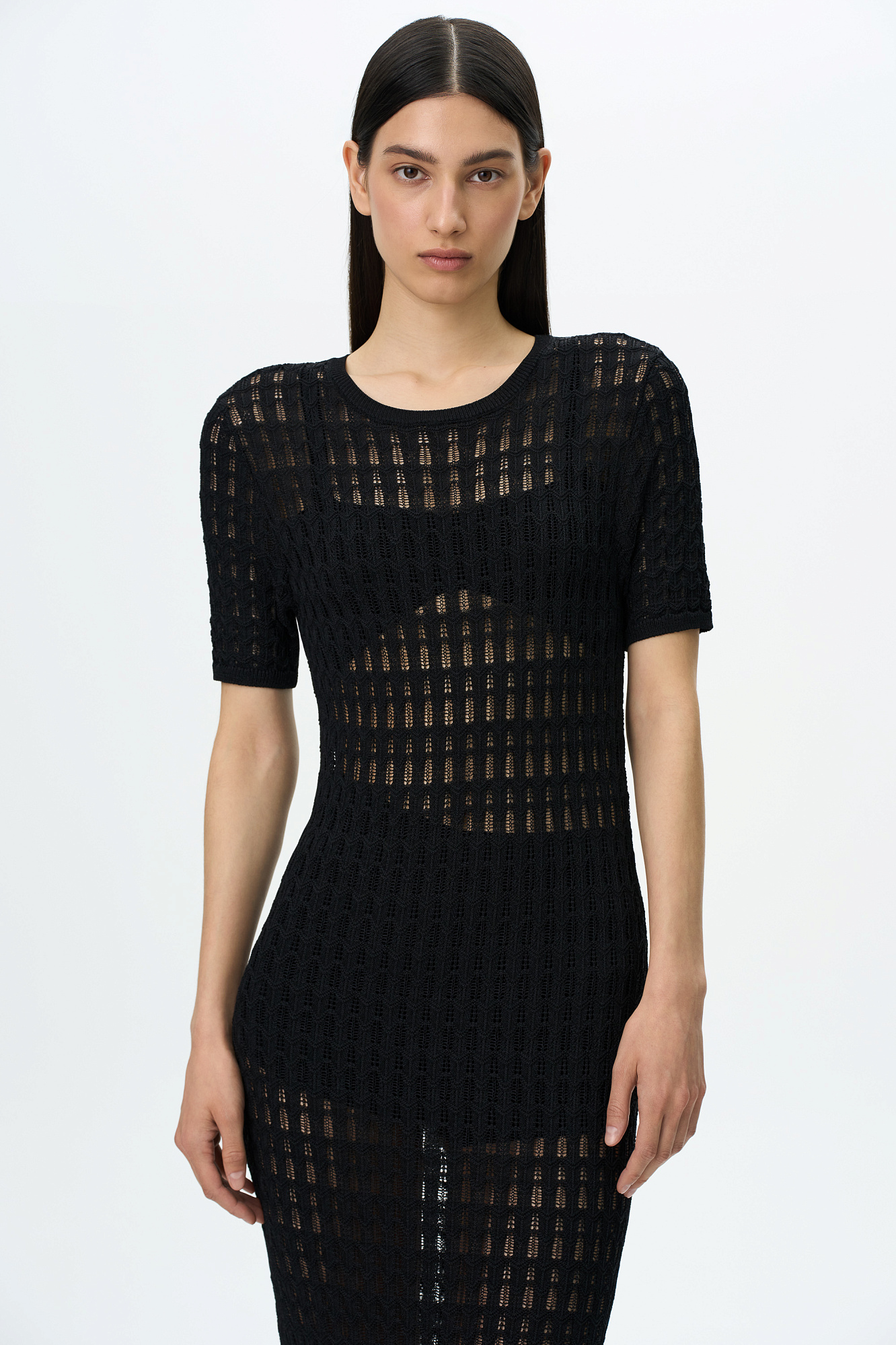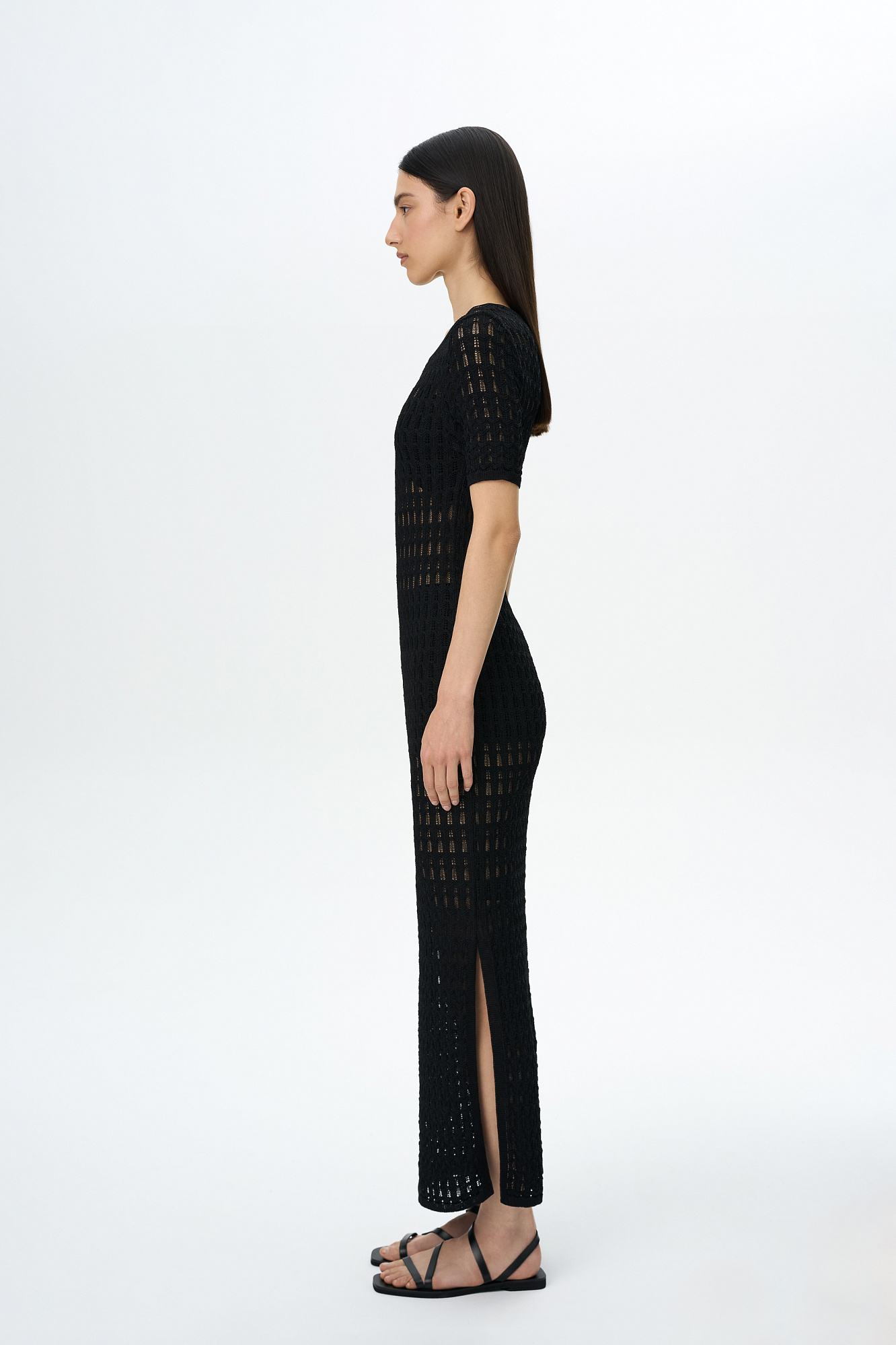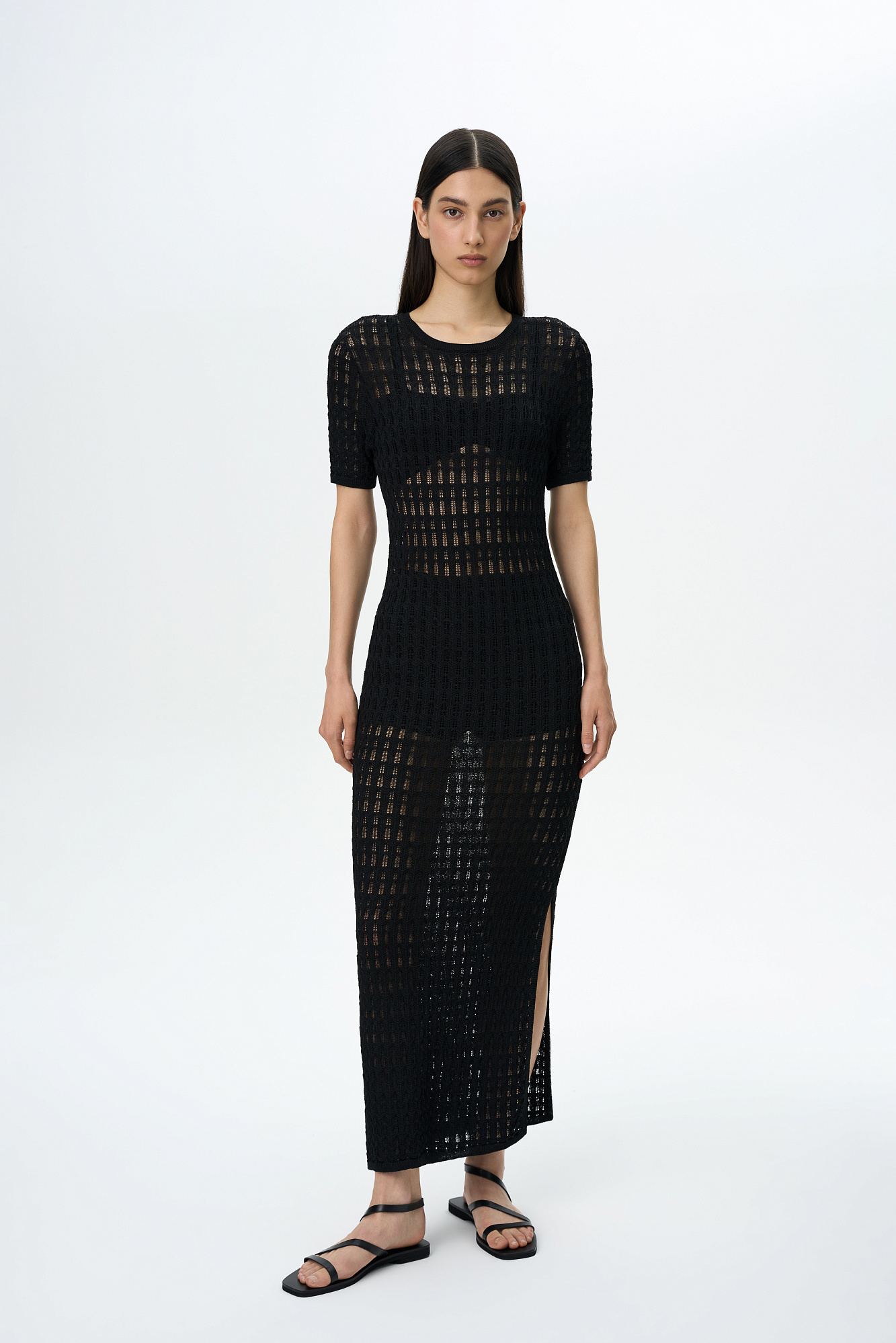 Трикотажное платье с коротким рукавом. Модель приталенного силуэта длины макси, выполнена полностью ажурным переплетением.
