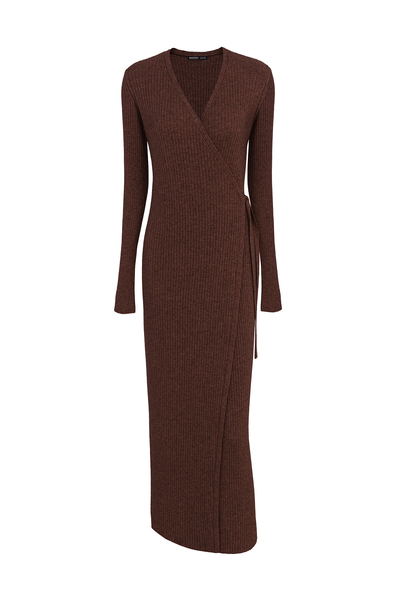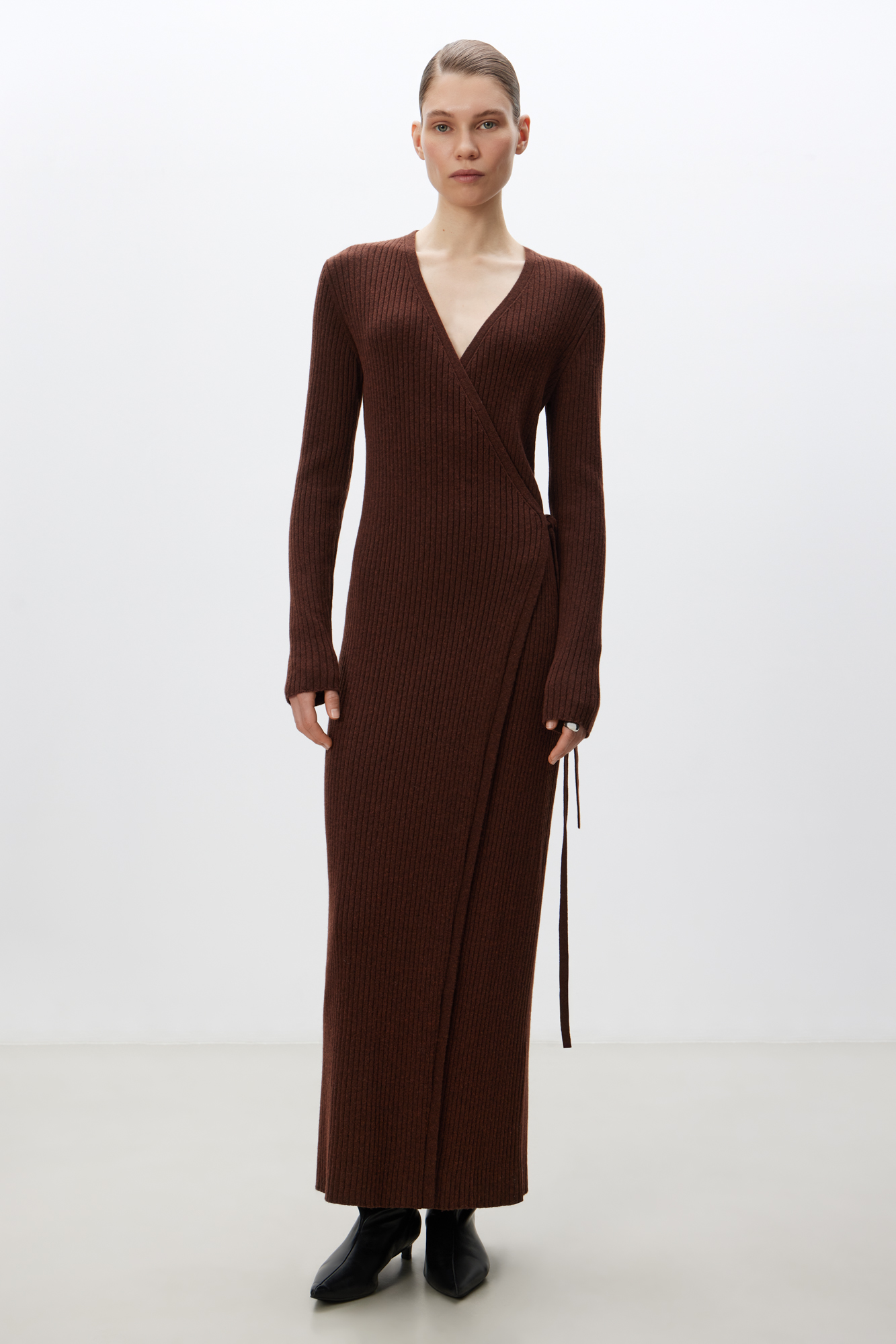 Платье на запах длины макси из шерсти и кашемира. Модель с длинными расклешенными рукавами, V-образным вырезом и поясом. Изделие выполнено в широкий рубчик.