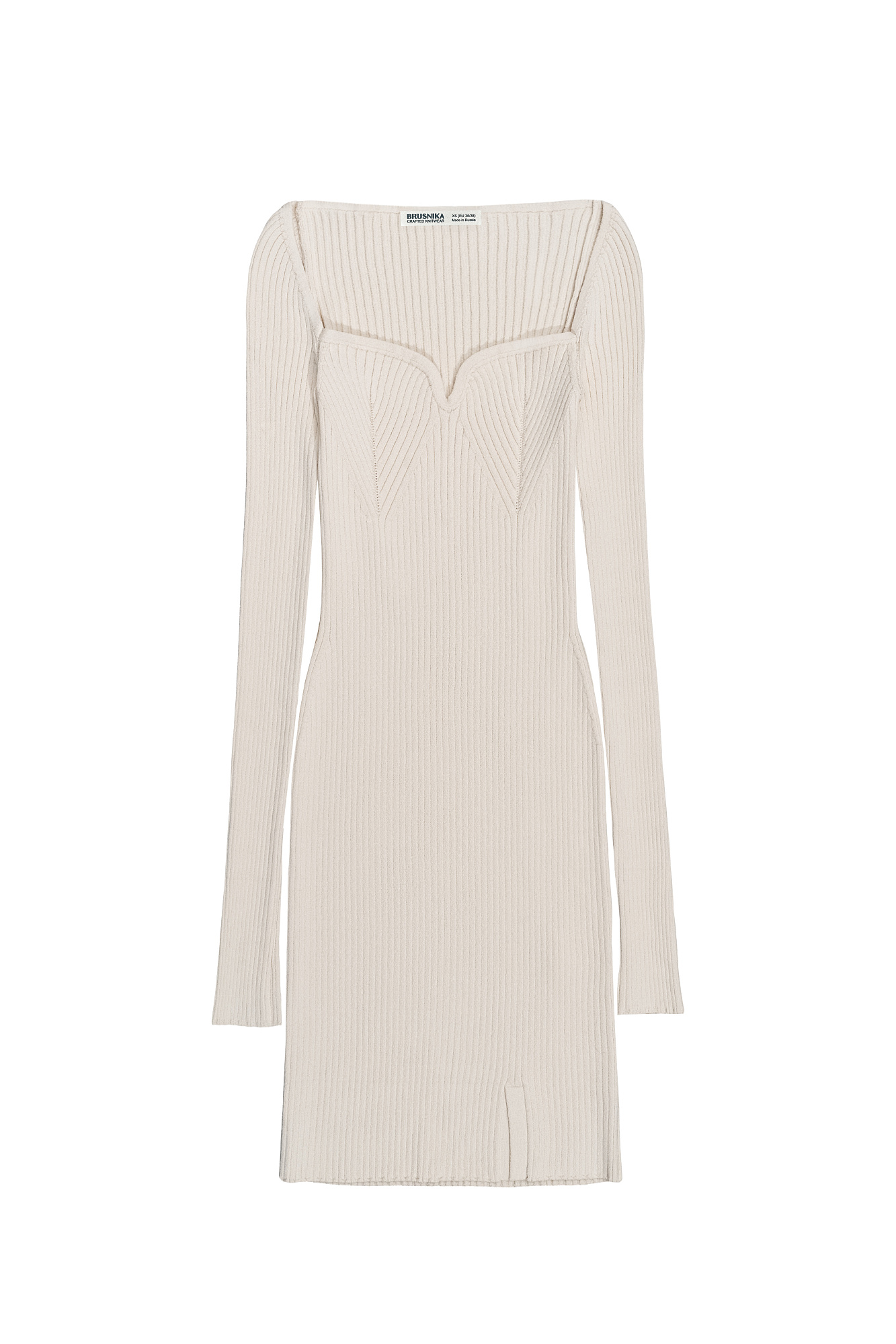 Трикотажное платье из вискозы длины мини. Модель приталенного силуэта с длинным рукавом и фигурным декольте.
