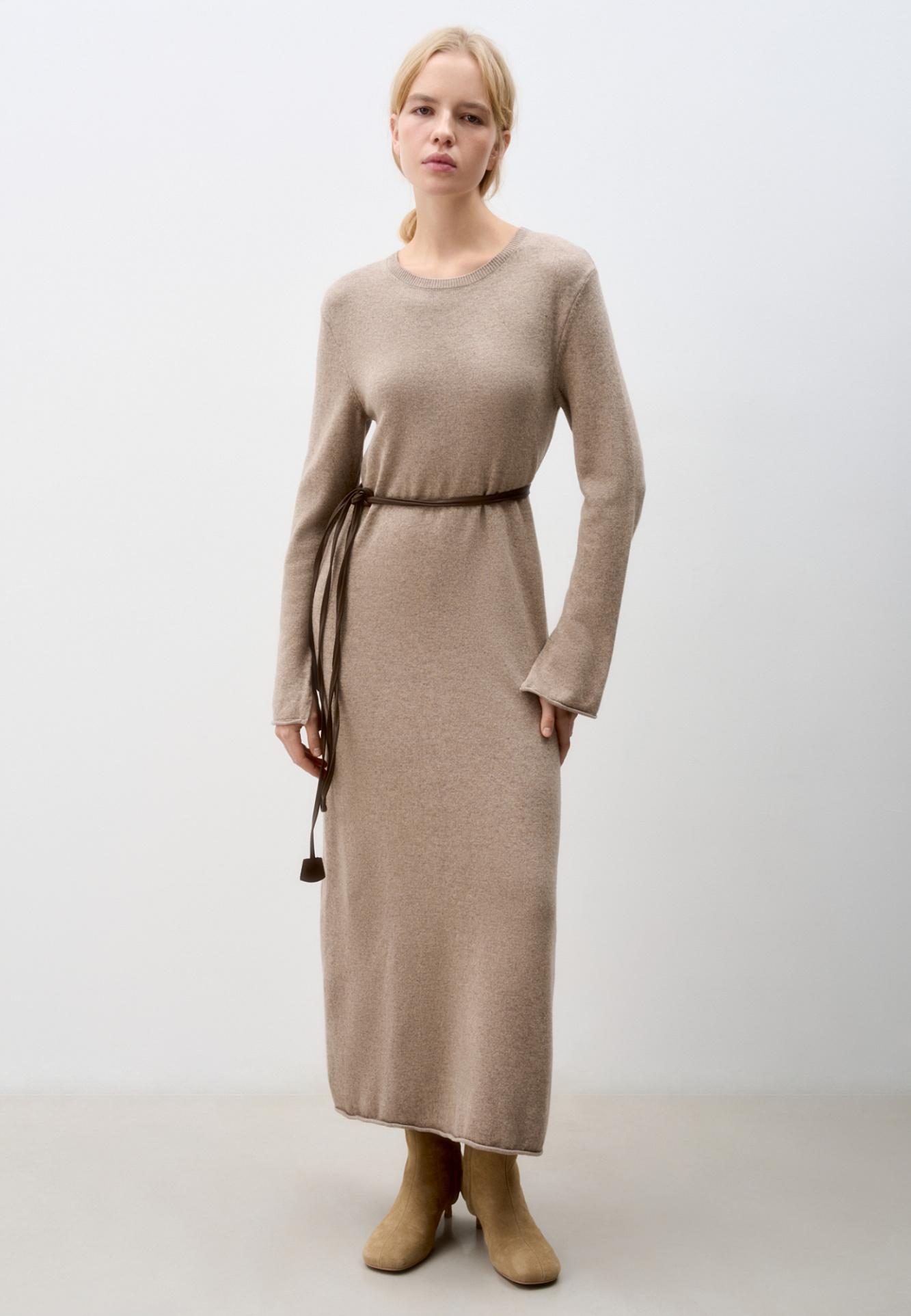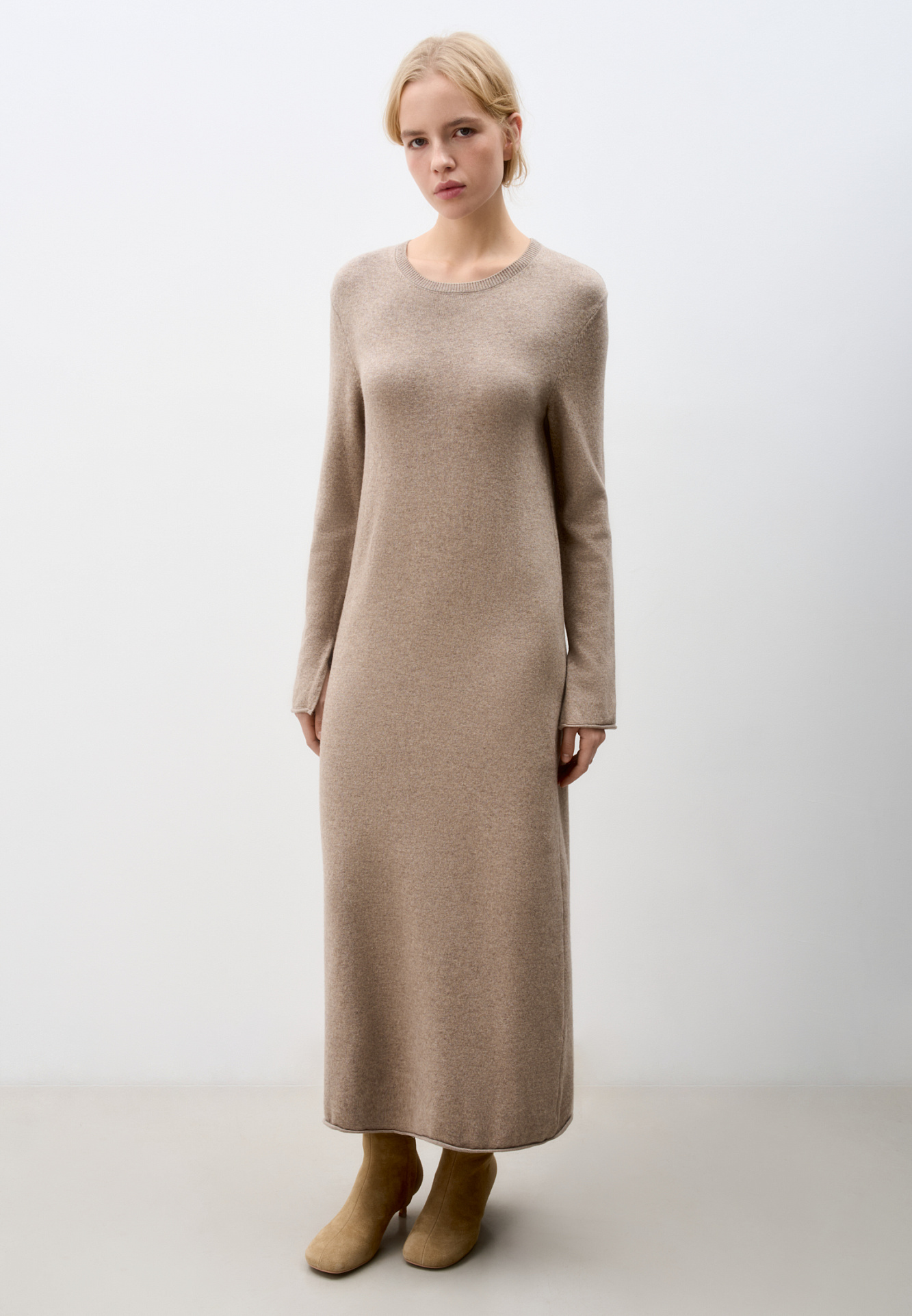 Трикотажное платье длины макси из шерсти с добавлением кашемира. Модель свободного силуэта с длинными рукавами, круглым вырезом горловины и валиком по низу изделия.