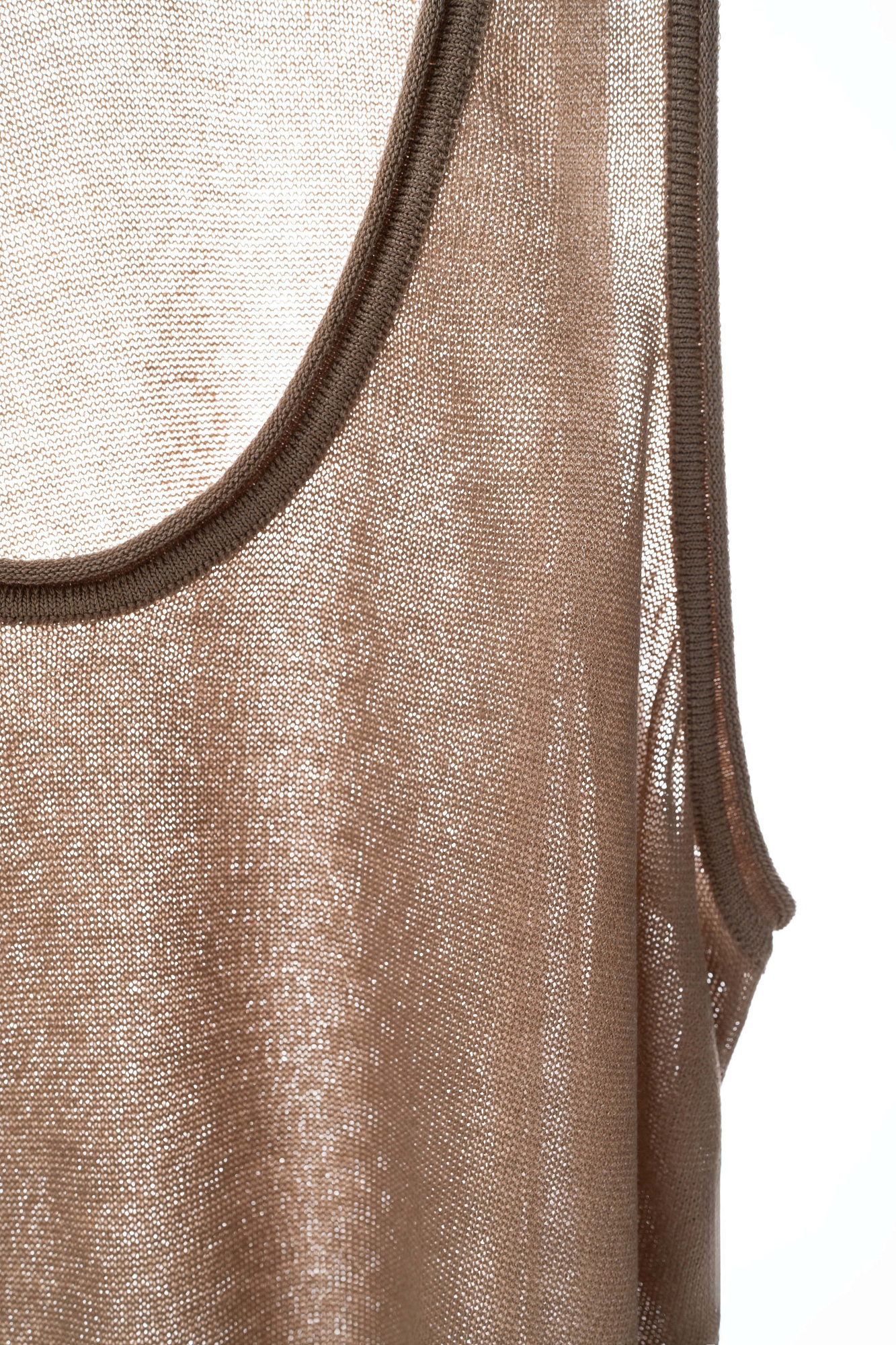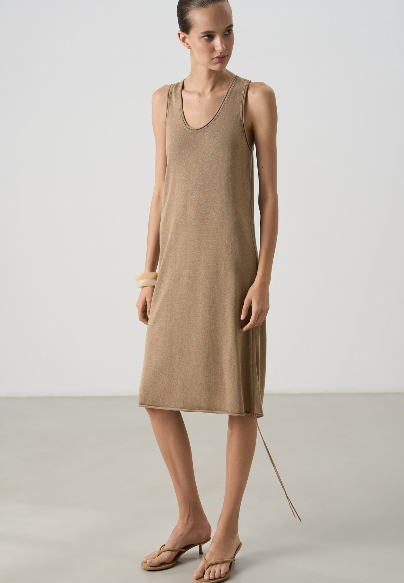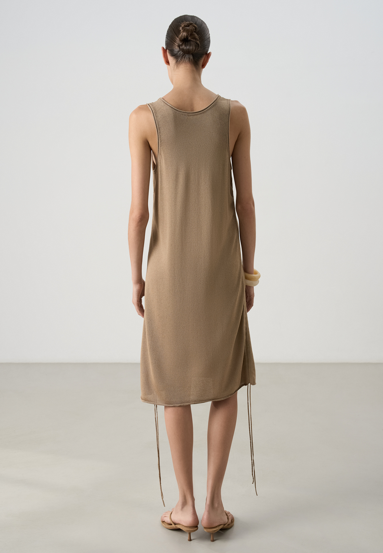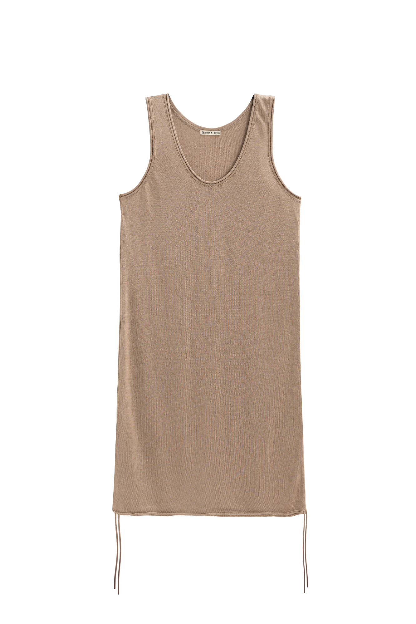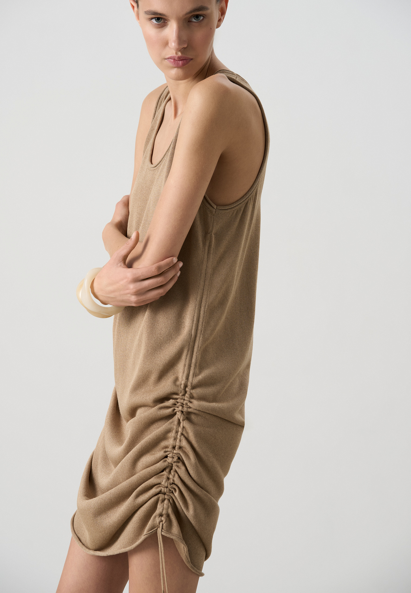 Трикотажное платье из вискозы. Модель свободного силуэта, без рукавов, на широких бретельках, с U-вырезом горловины и глубокой проймой. Кулиски по бокам изделия позволяют регулировать длину и создавать драпировку.