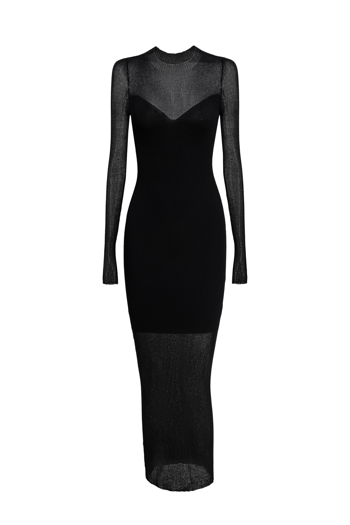 Платье макси облегающего кроя из трикотажа на основе хлопка и вискозы. Круглый вырез. Длинные рукава. Имитация прозрачного нижнего слоя.