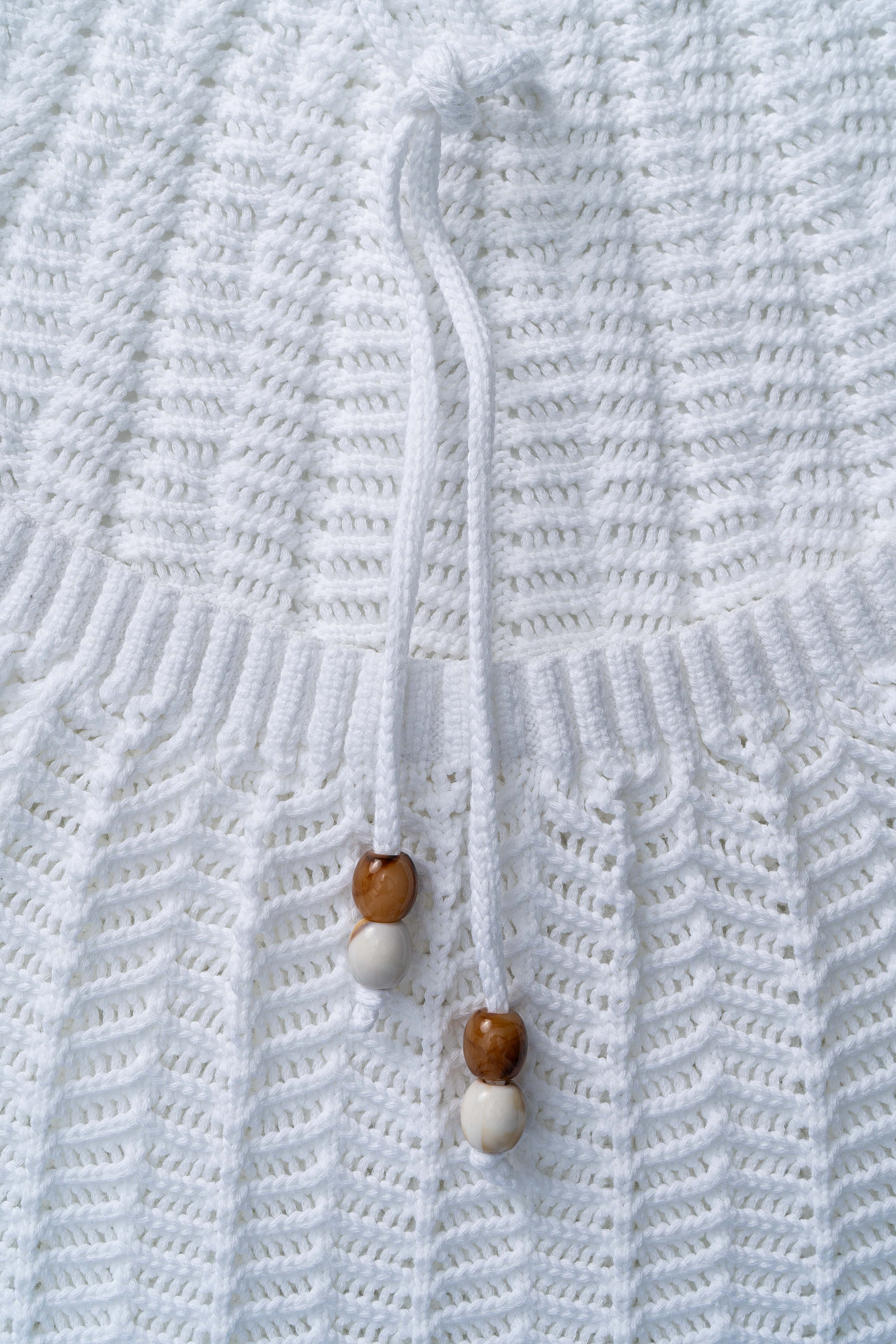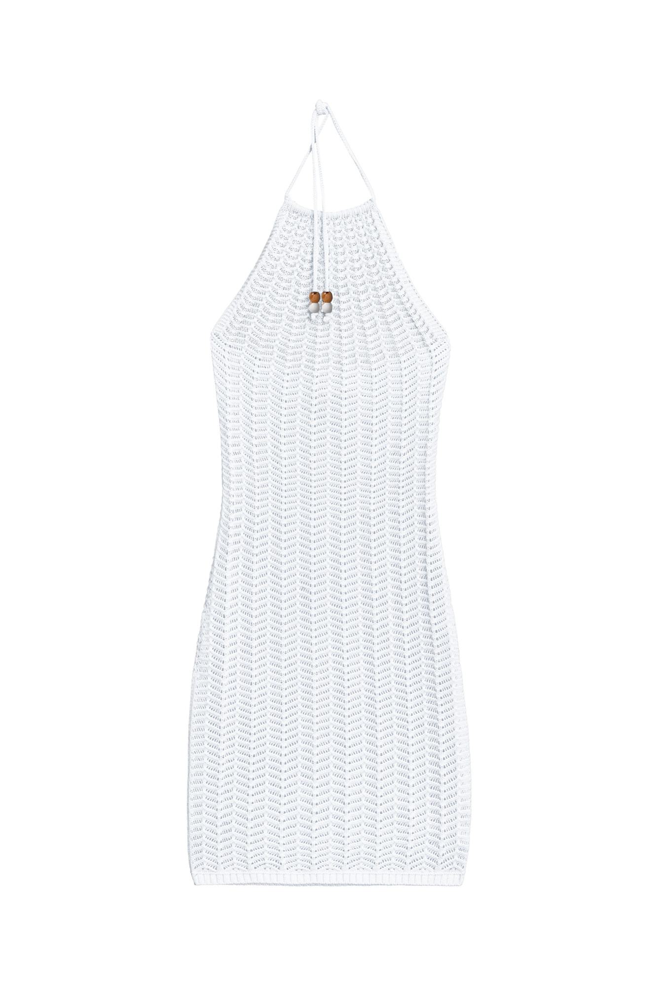 Трикотажное ажурное платье из хлопка. Модель приталенного силуэта, без рукавов, с открытой спиной и вырезом халтер на тонких завязках с бусинами.