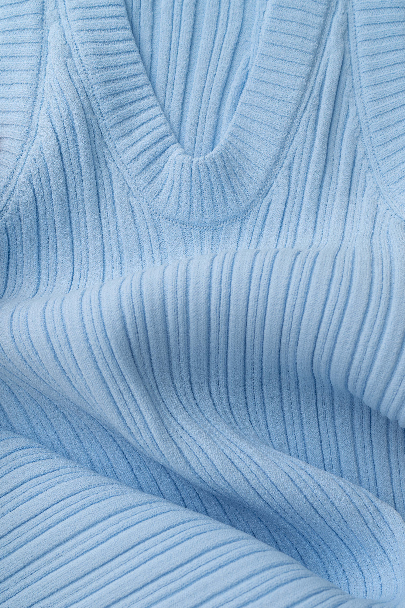 Платье длины мини из фактурного трикотажа на основе вискозы. Модель приталенного силуэта, без рукавов, на широких бретельках, с U-образным вырезом горловины. Изделие выполнено в широкий рубчик.