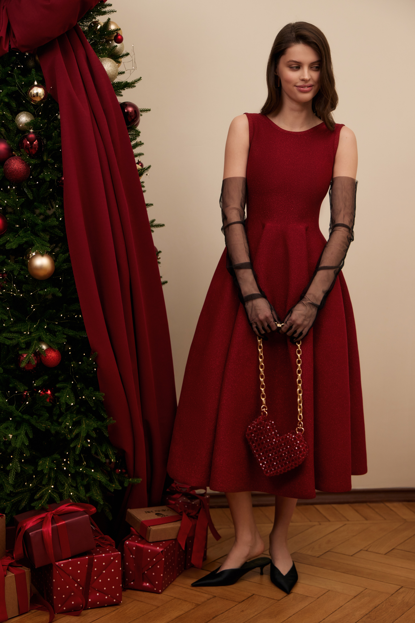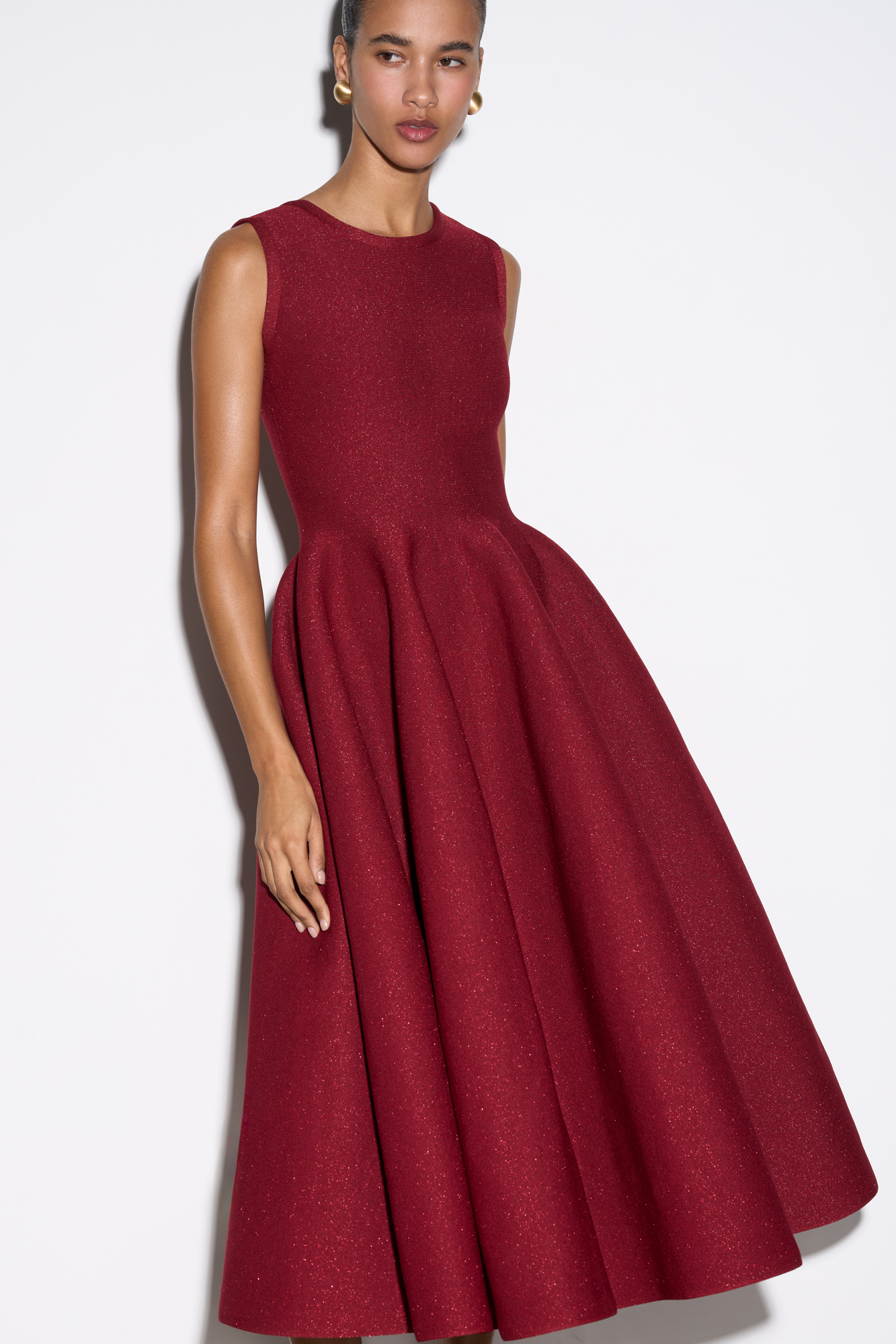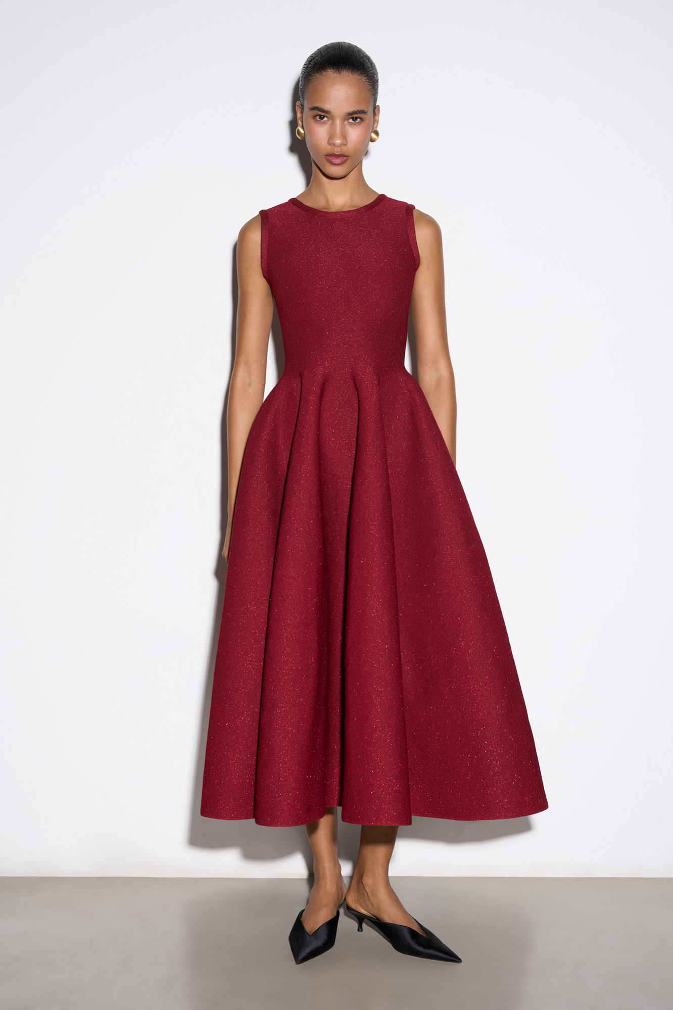 Трикотажное платье длины миди с люрексом. Модель по фигуре с юбкой, расклешенной от талии, без рукавов, на широких бретельках.