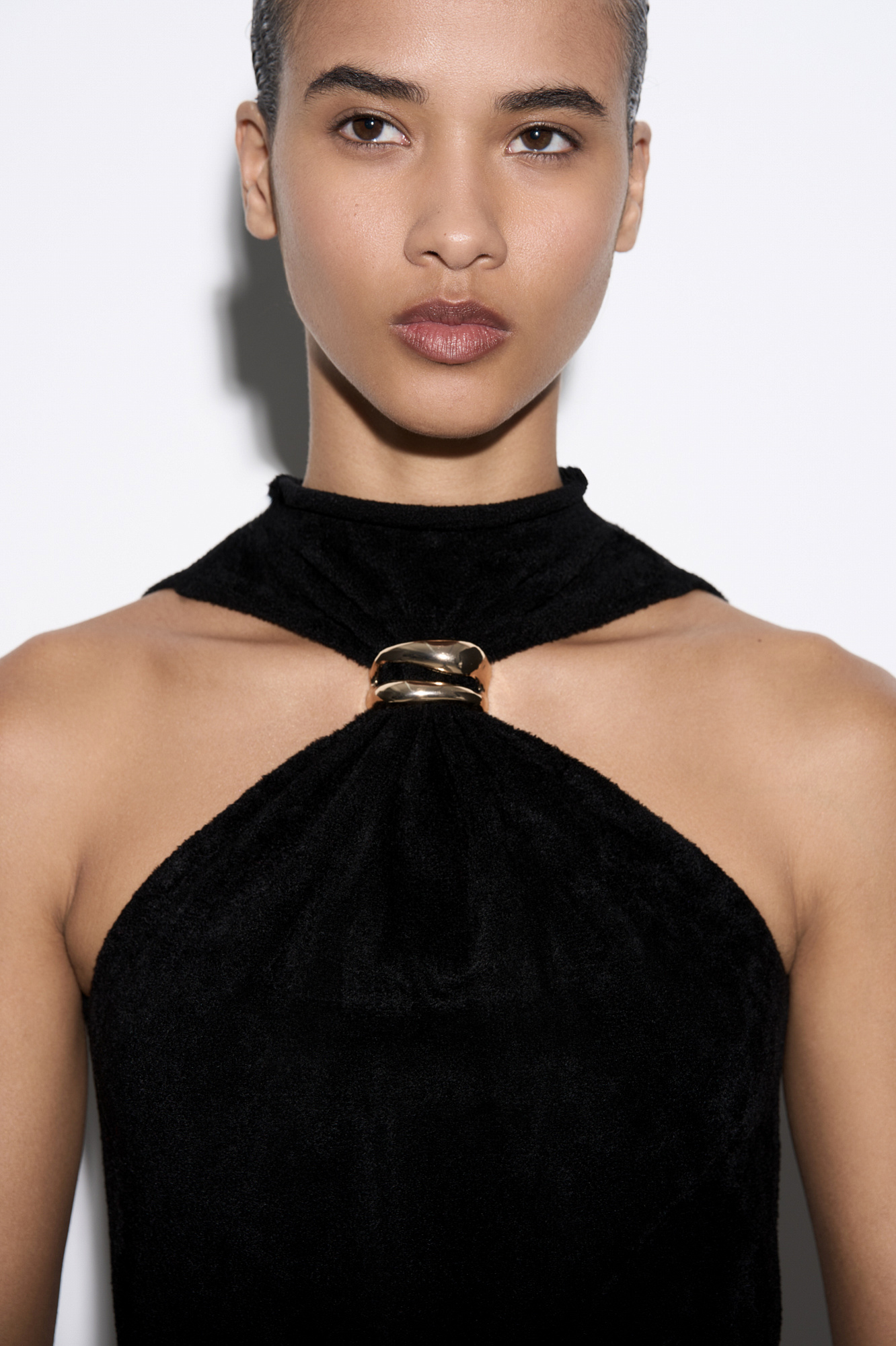 Вечернее платье длины мини из вискозы. Модель приталенного силуэта без рукавов, с американской проймой, перемычкой на шее и драпировкой на бедрах.