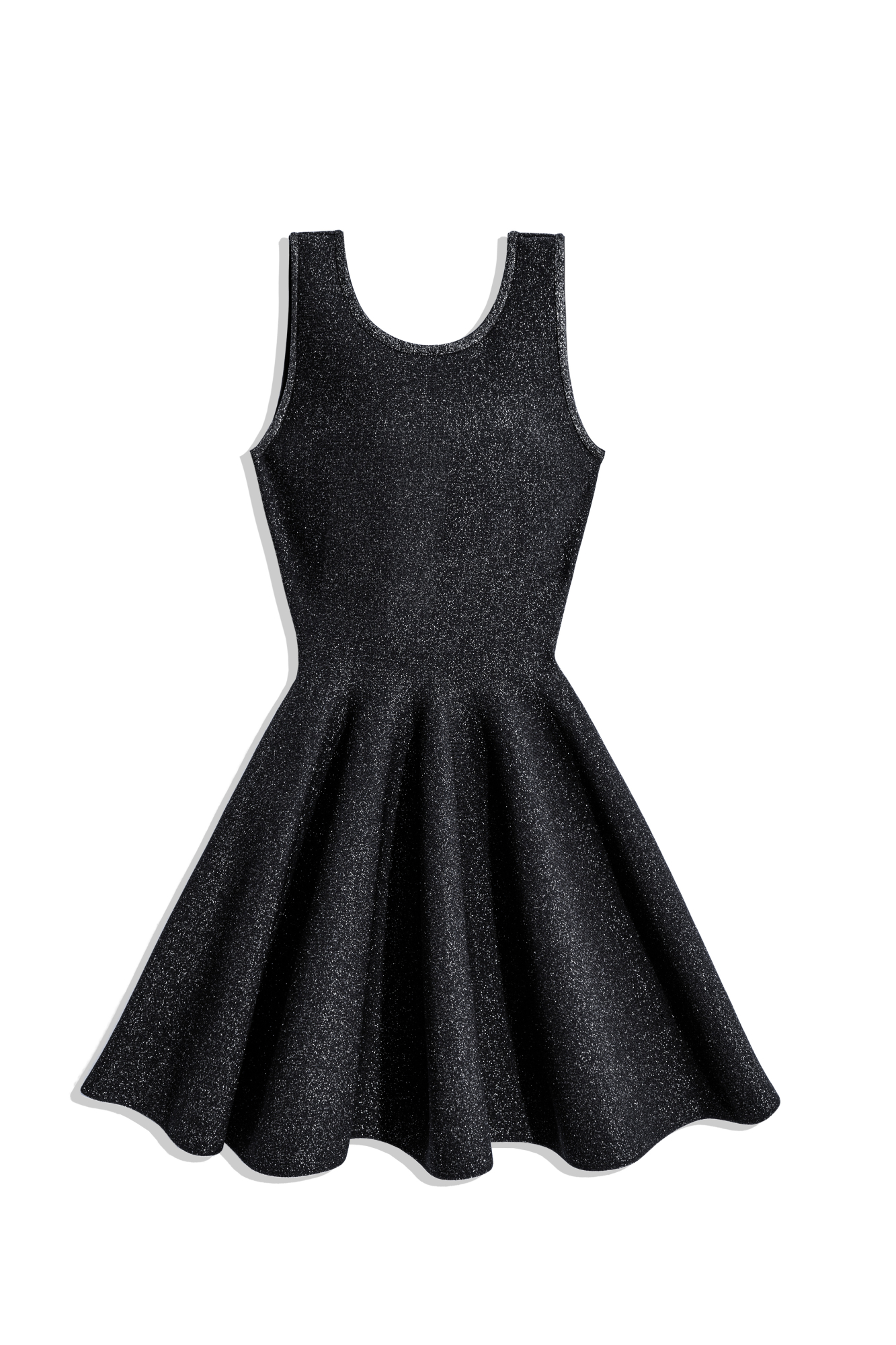 Трикотажное платье длины мини с люрексом. Модель по фигуре с юбкой, расклешенной от талии, без рукавов, на широких бретельках.