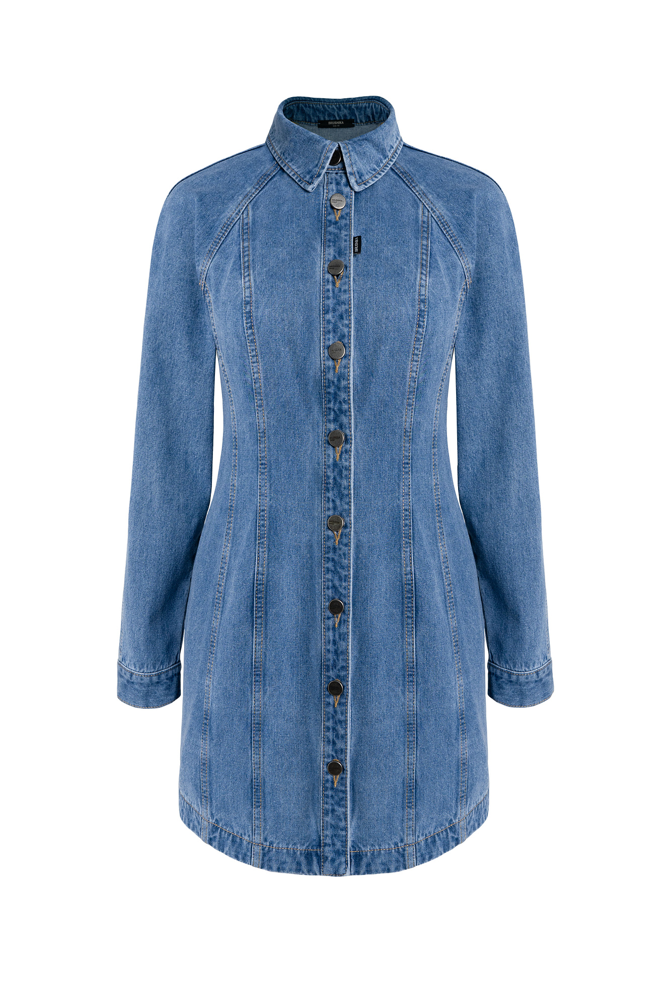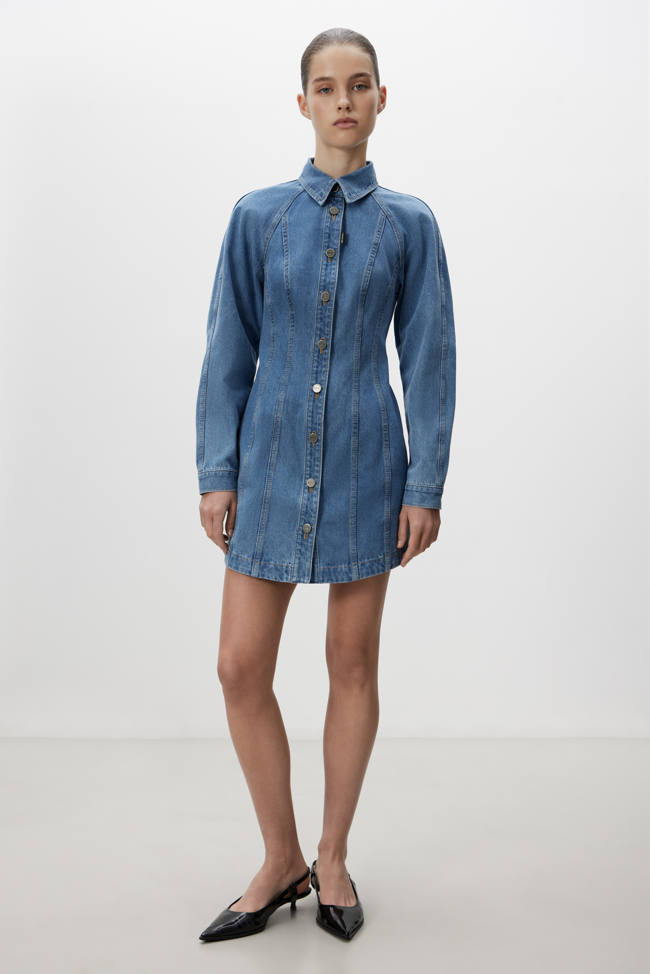 Джинсовое платье из 100% хлопка длины мини. Модель приталенного силуэта, с длинным рукавом реглан и отложным воротником. Застежка на пуговицы.