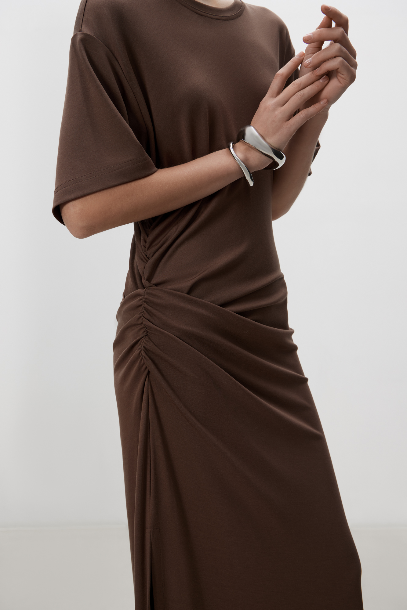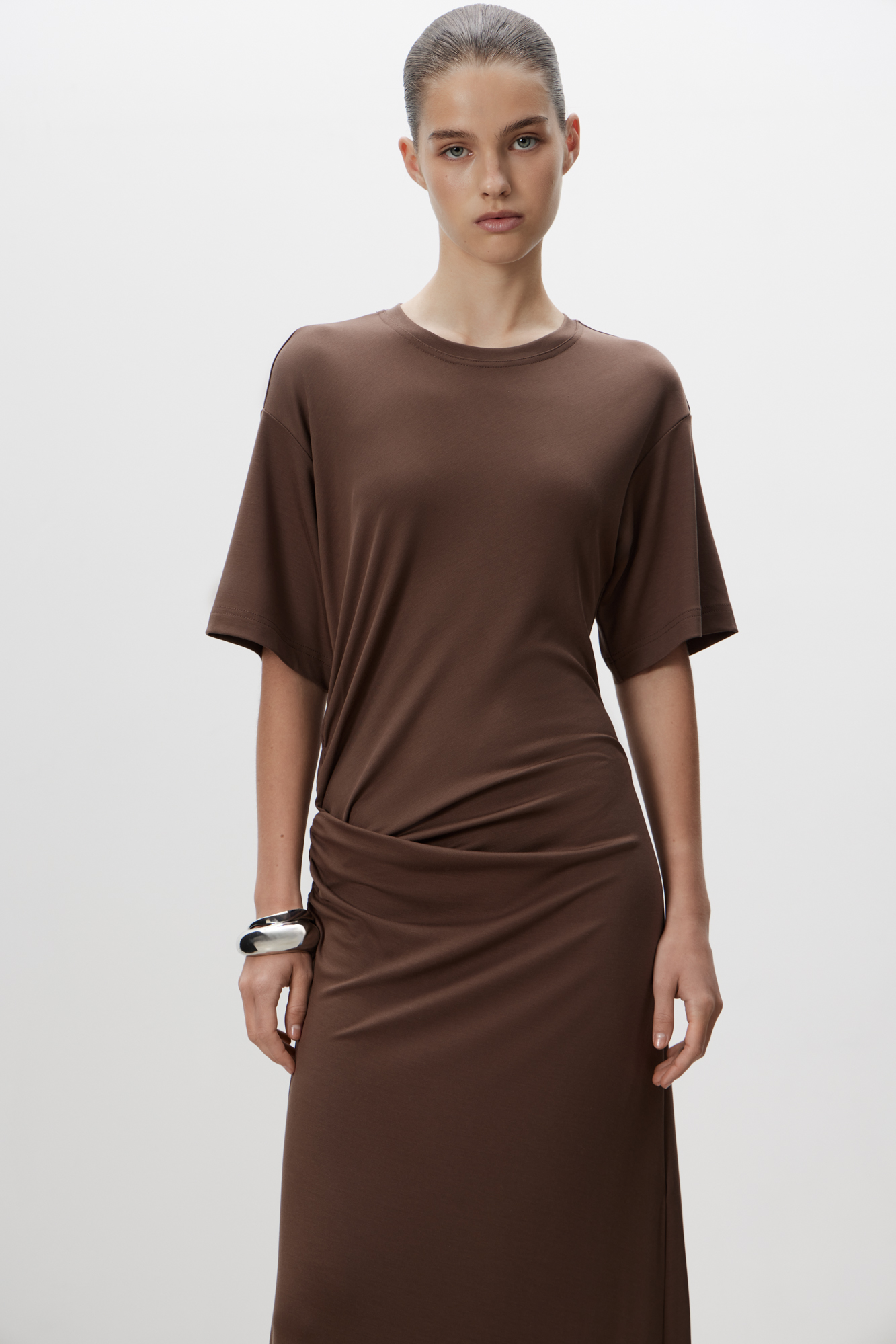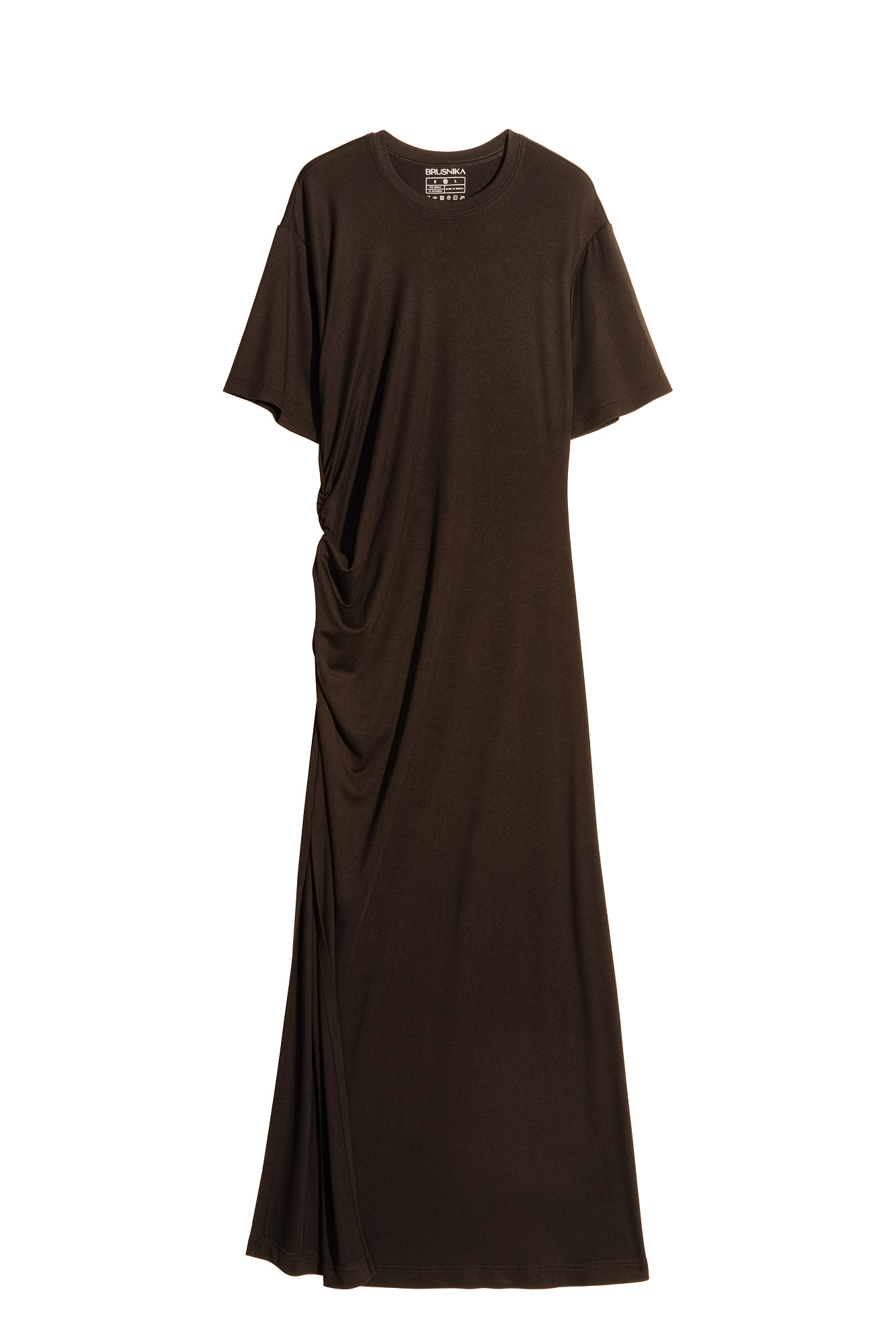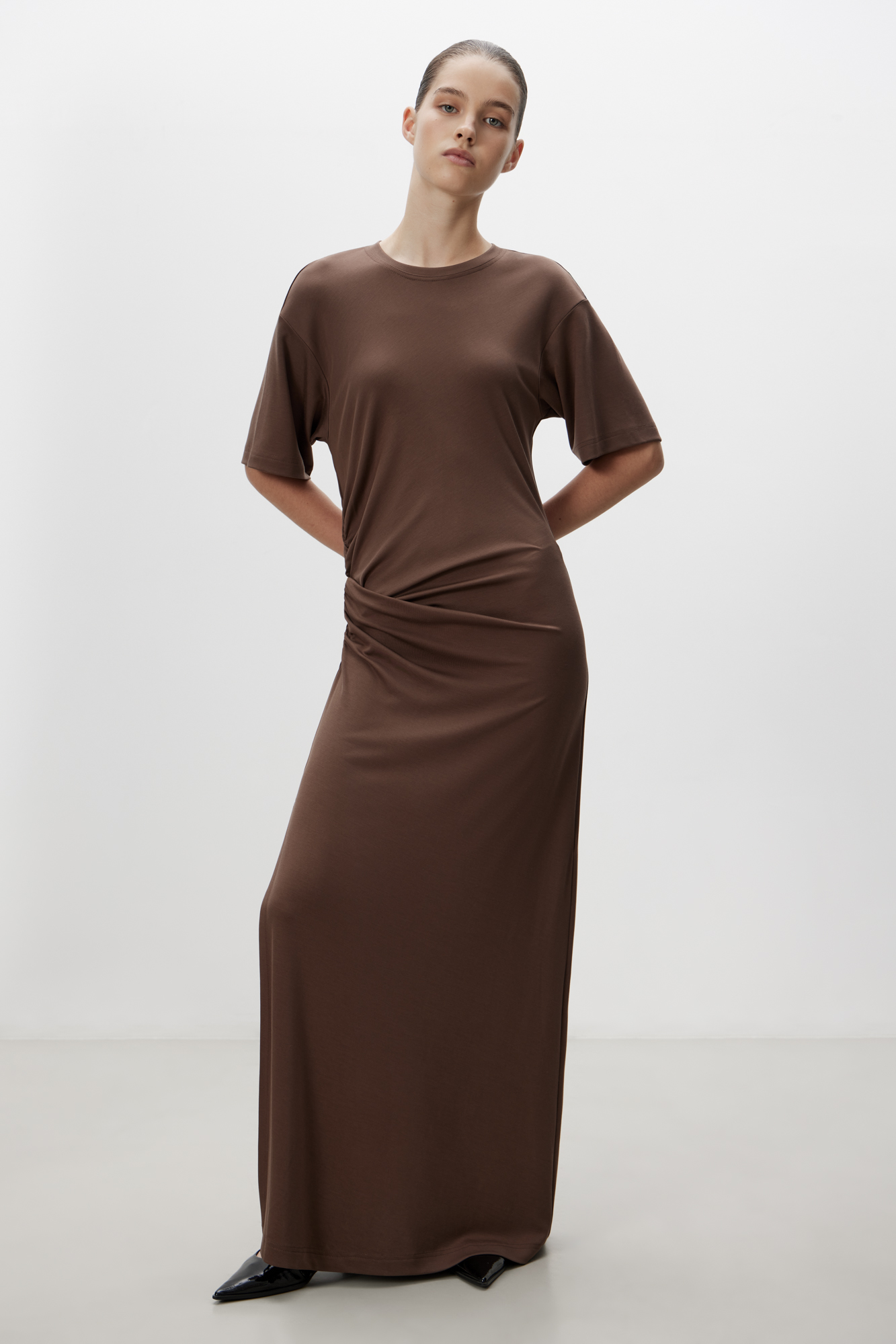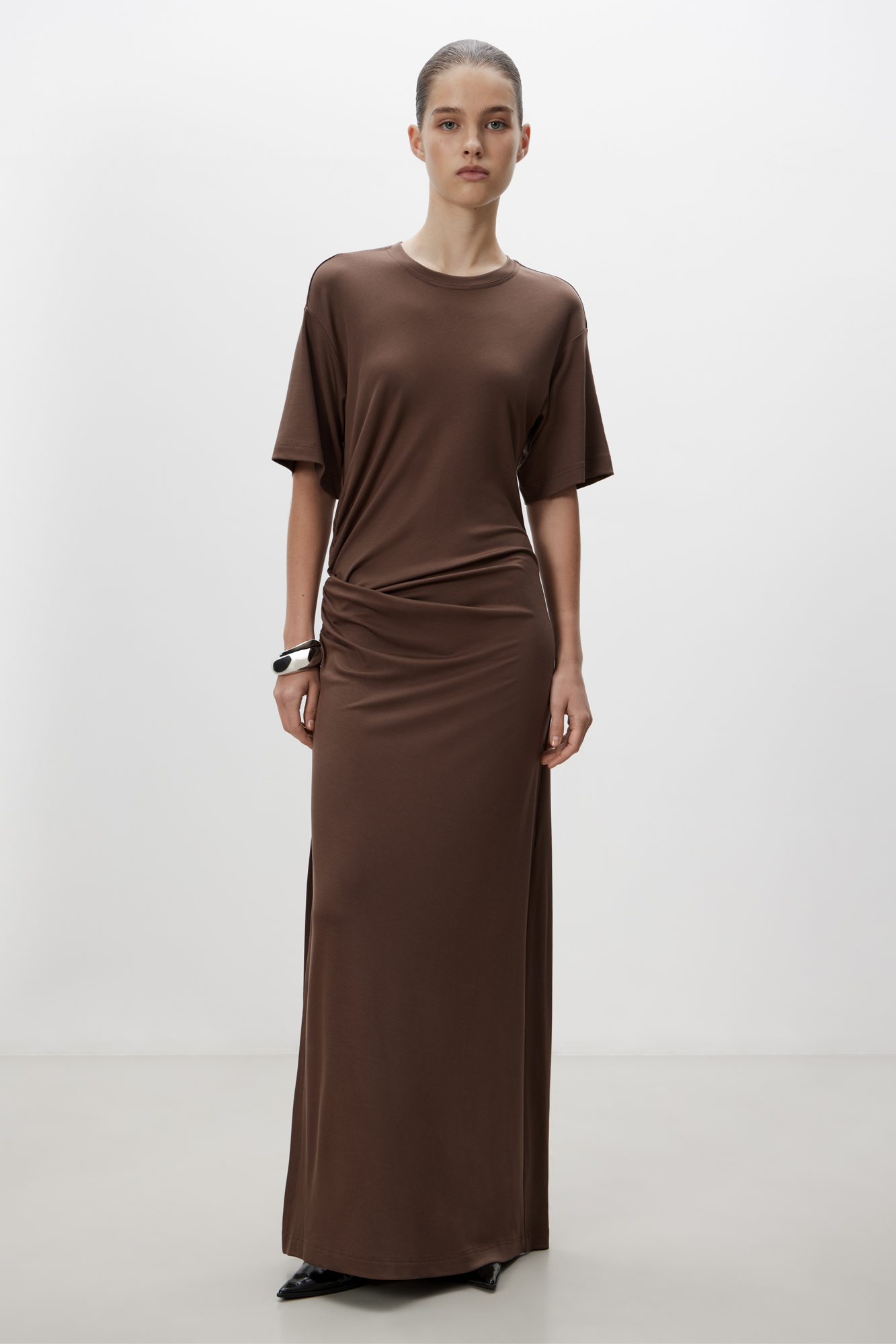 Длинное платье с драпировкой сбоку. Модель свободного силуэта со спущенной линией плеча.