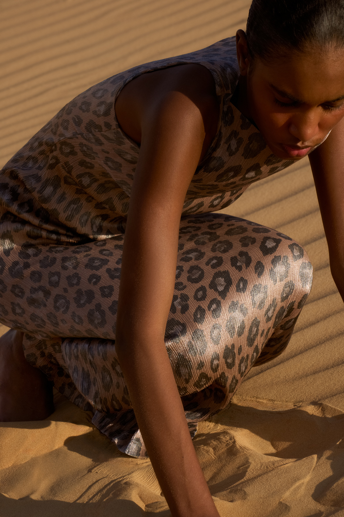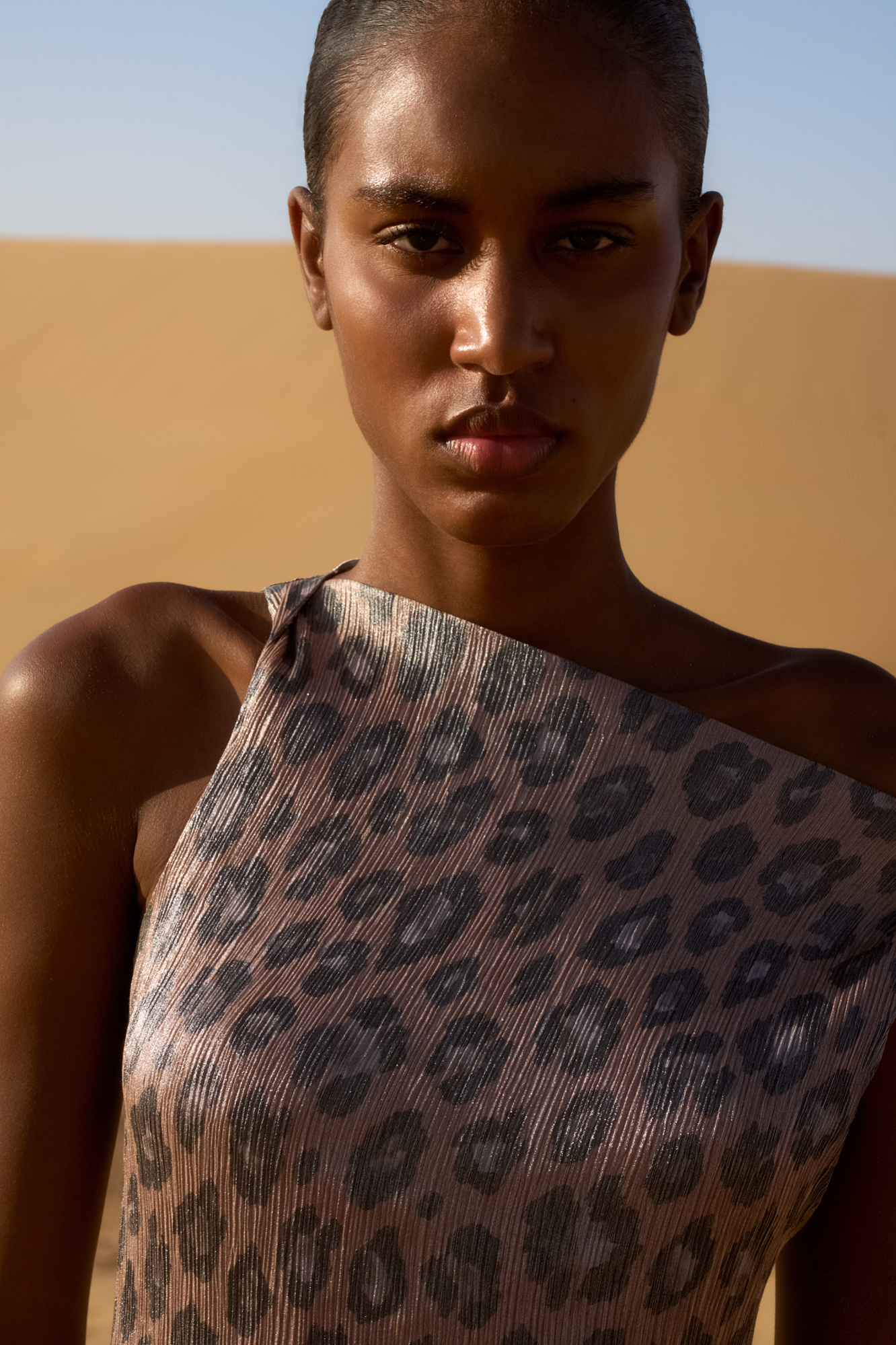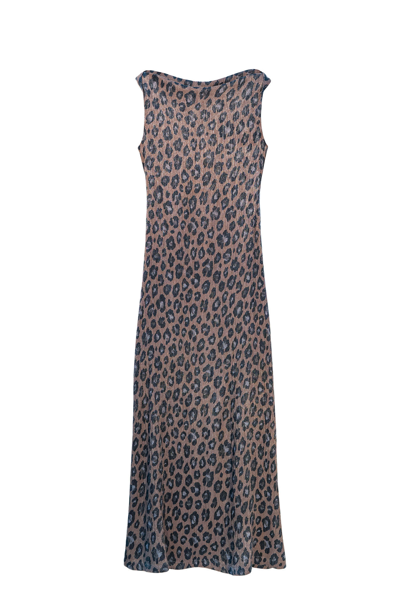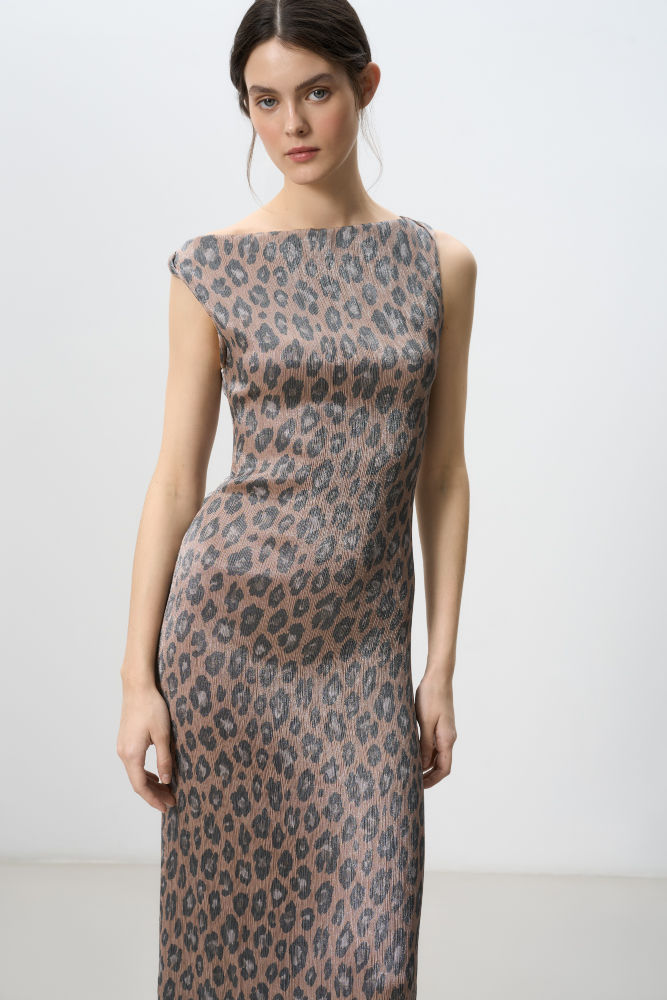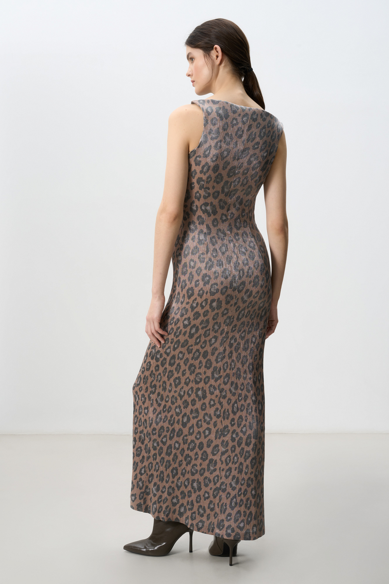 Платье длины макси из текстурной вискозы. Модель приталенного силуэта без рукавов с перекрутом на плечах. Застежка на молнию.