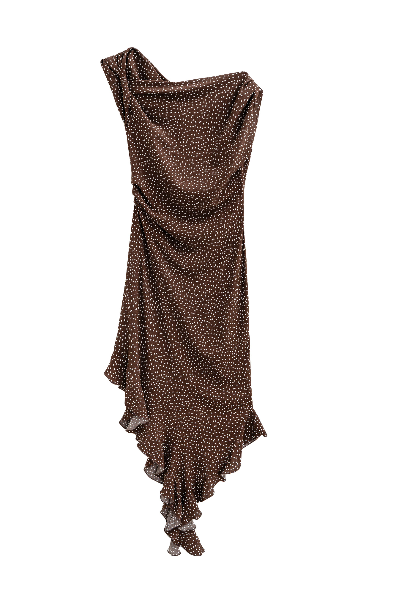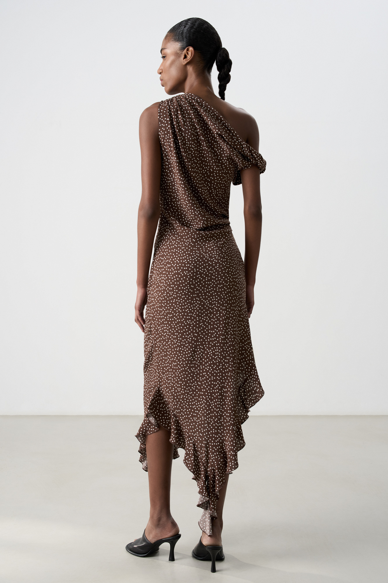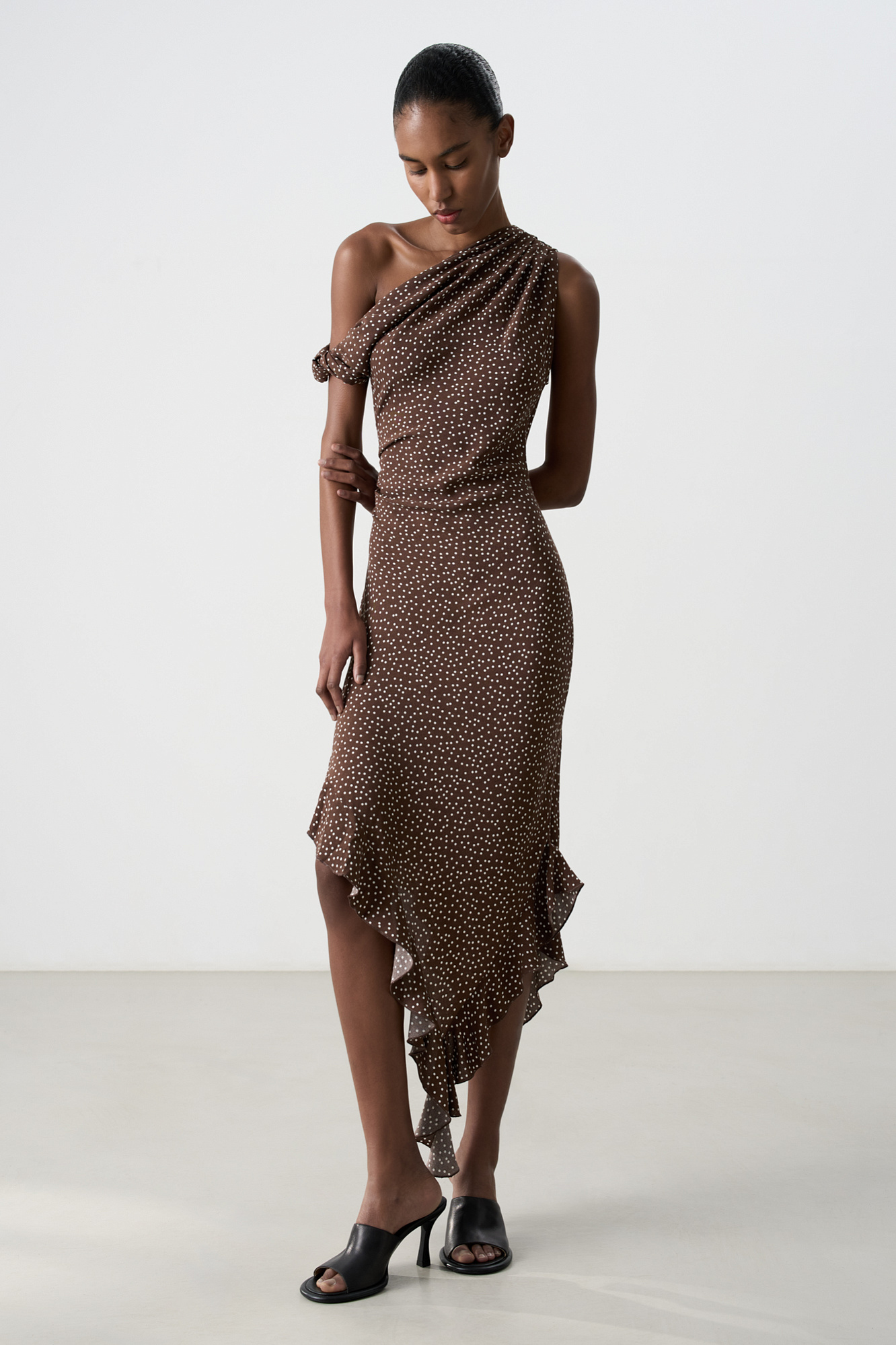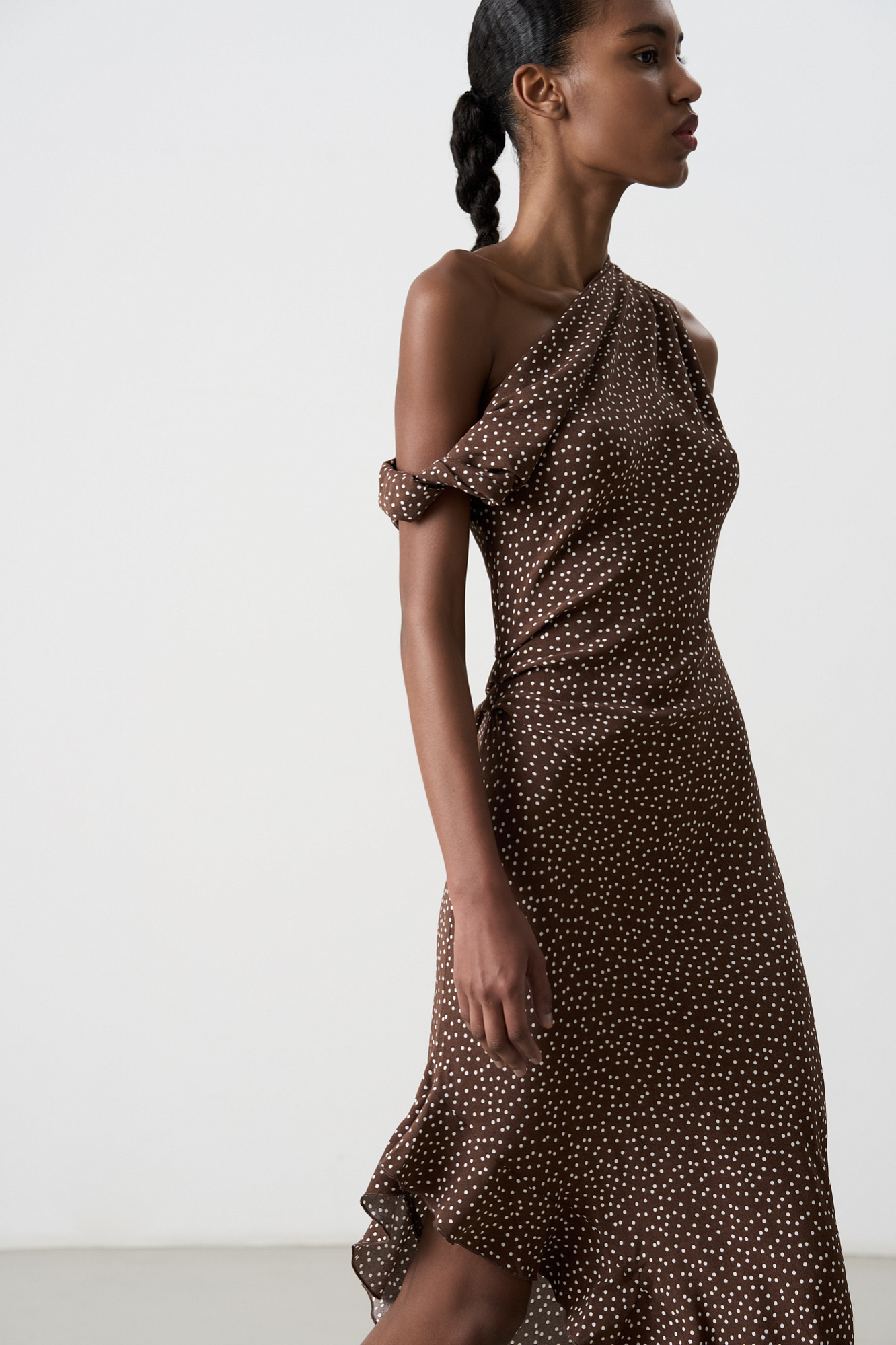 Платье с принтом из 100% креповой вискозы длины миди. Модель прямого силуэта, без рукавов, на широких бретельках с перекрутом, асимметричной юбкой, оборками и драпировкой на талии.