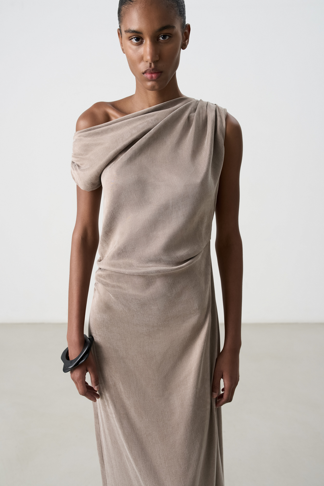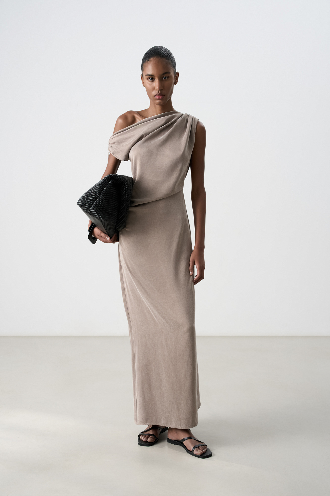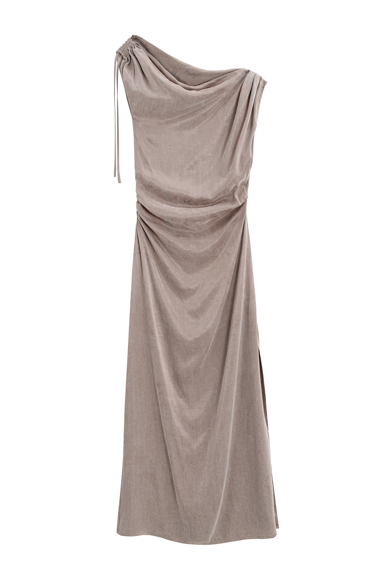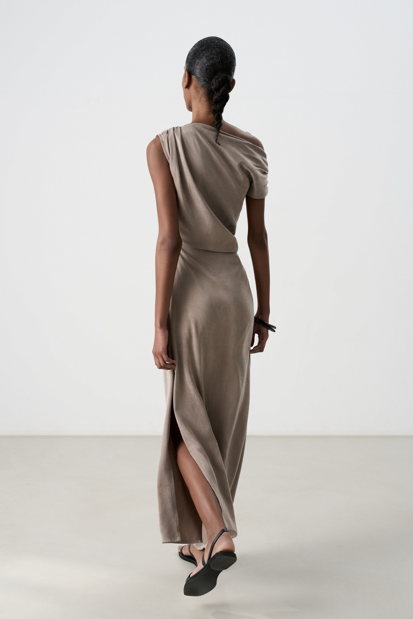 Платье из купры длины макси. Модель приталенного силуэта, без рукавов, с асимметричным вырезом горловины, драпировкой на плече и талиии. Высокий разрез сбоку.