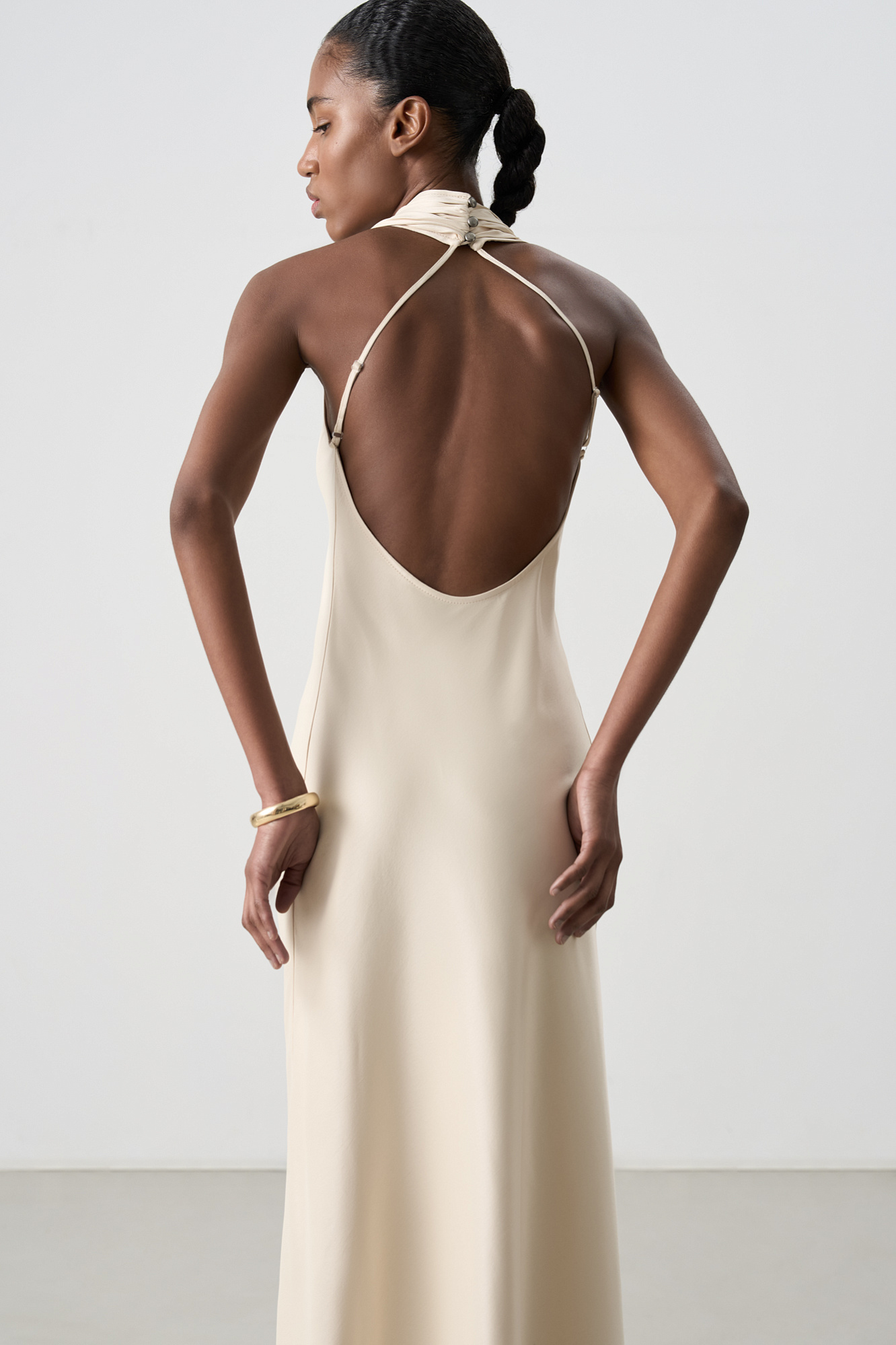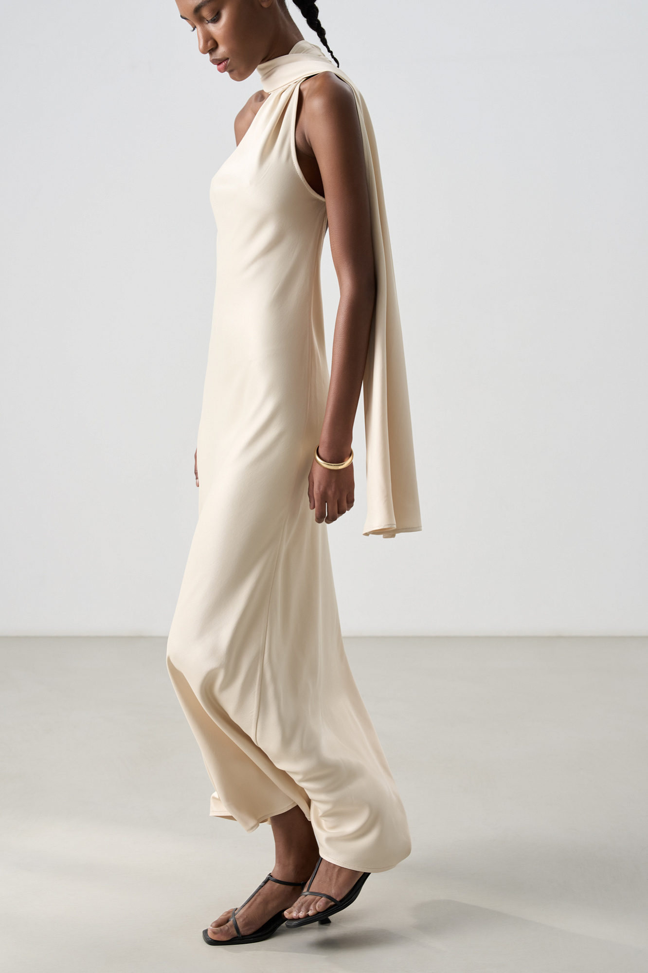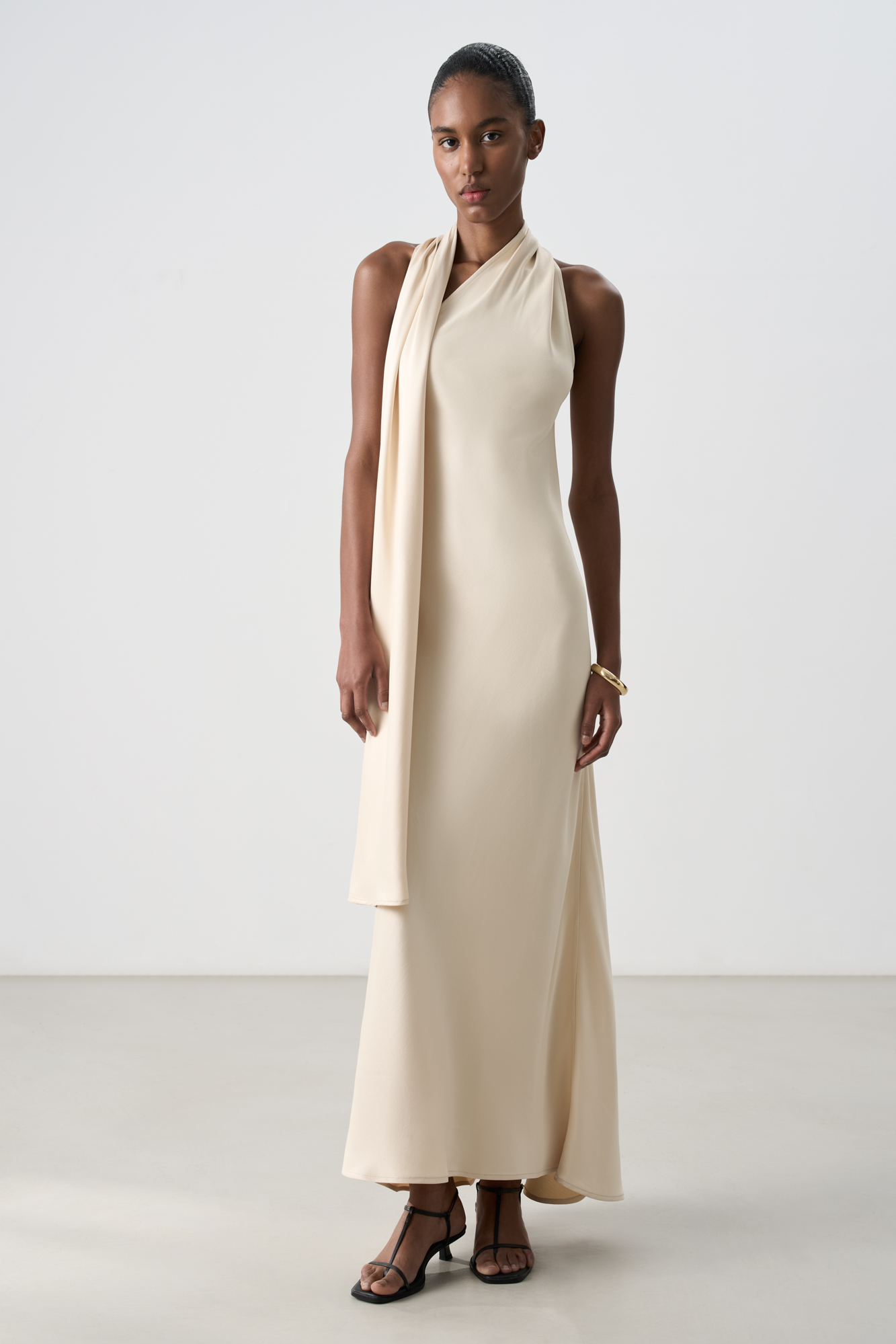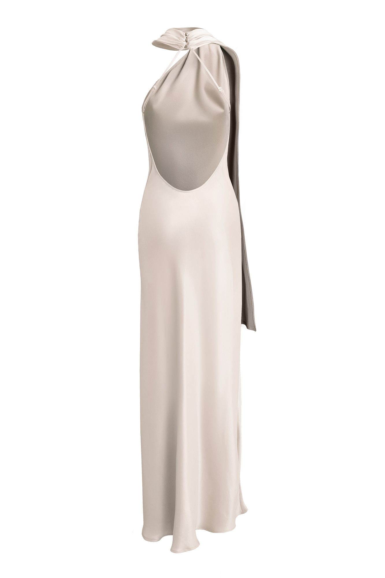 Платье из атласной вискозы длины макси с шарфом. Модель приталенного силуэта, без рукавов, с вырезом халтер, переходящий в воротник-стойку с застежкой на пуговицы сзади.