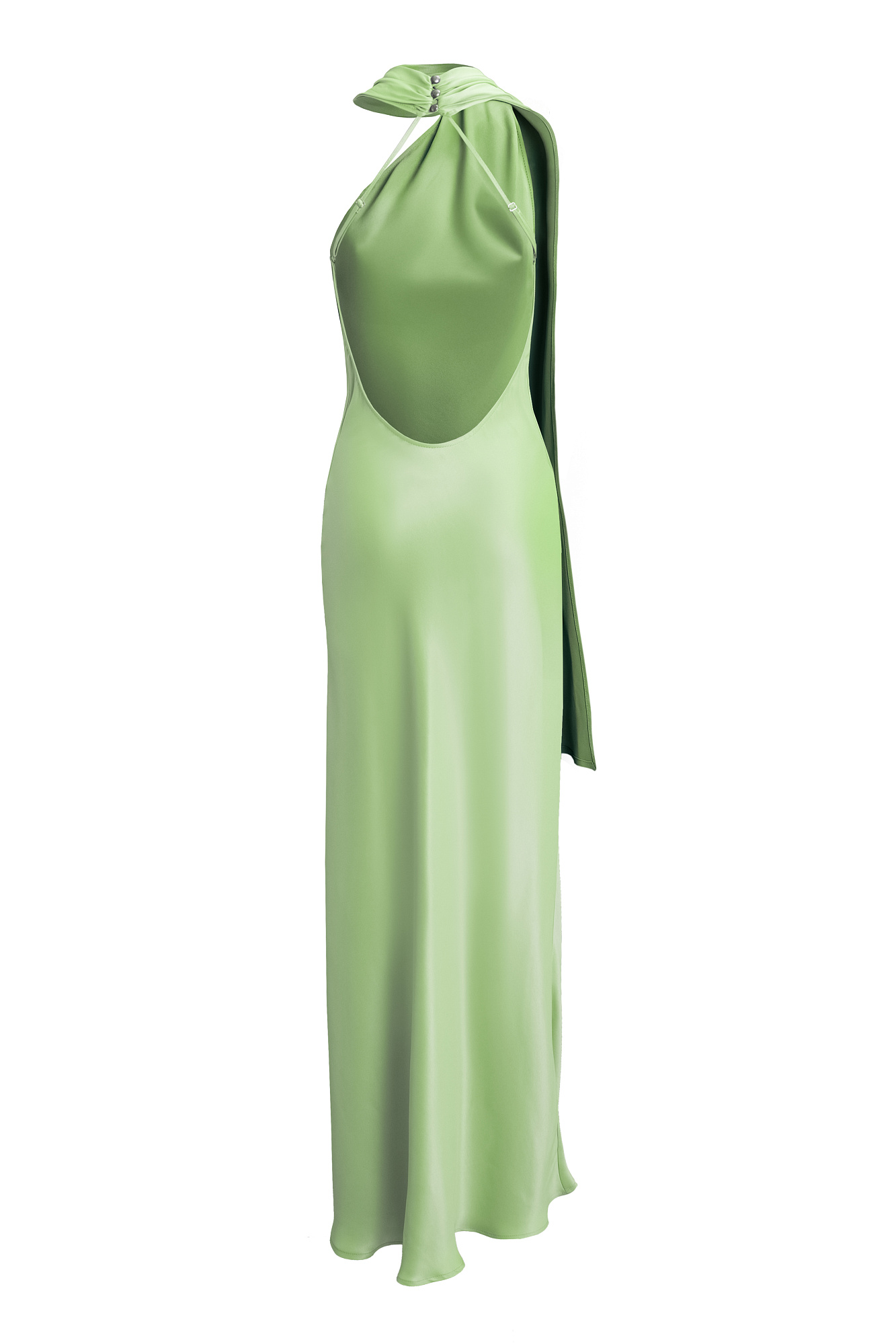 Платье из атласной вискозы длины макси с шарфом. Модель приталенного силуэта, без рукавов, с вырезом халтер, переходящий в воротник-стойку с застежкой на пуговицы сзади.
