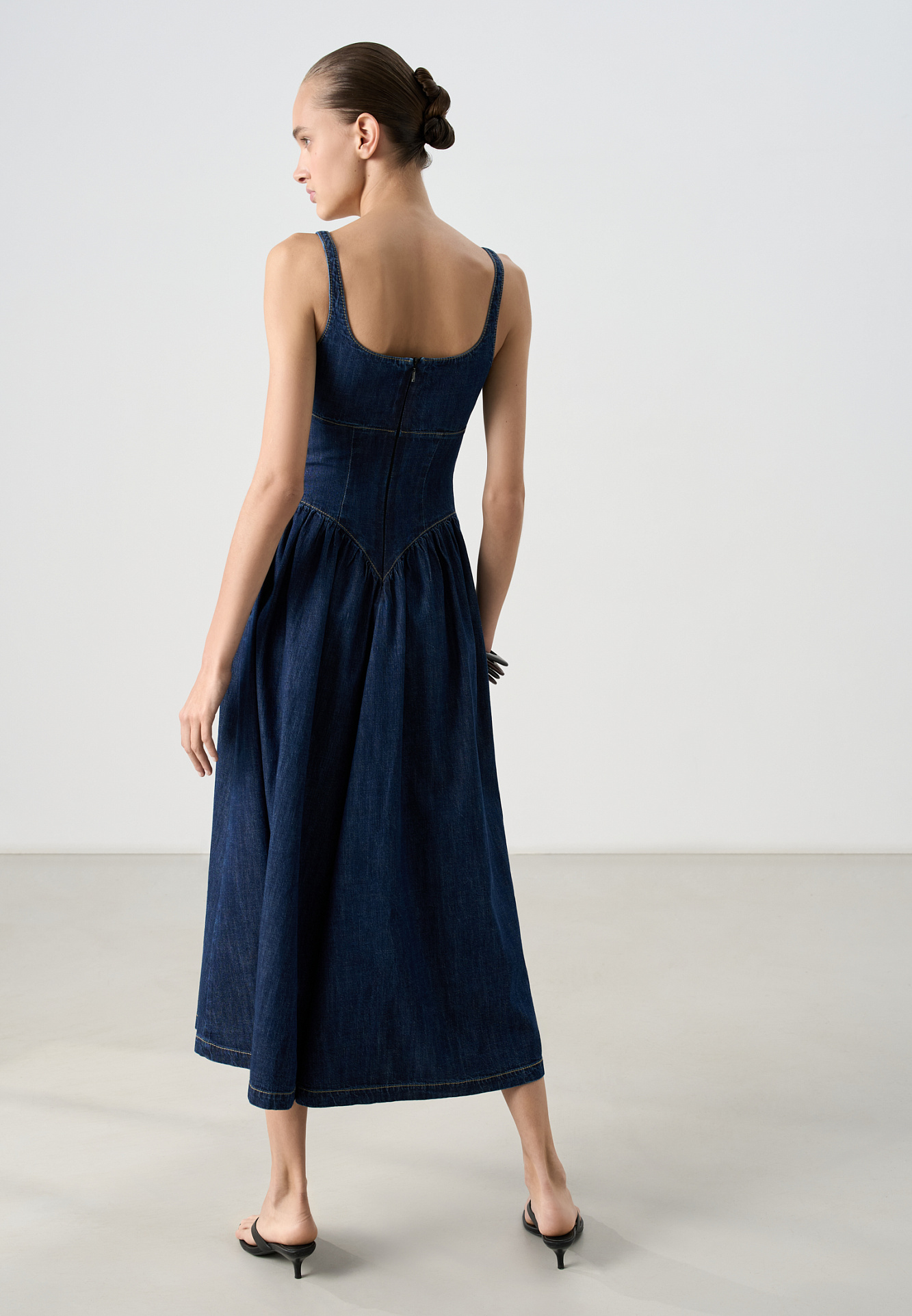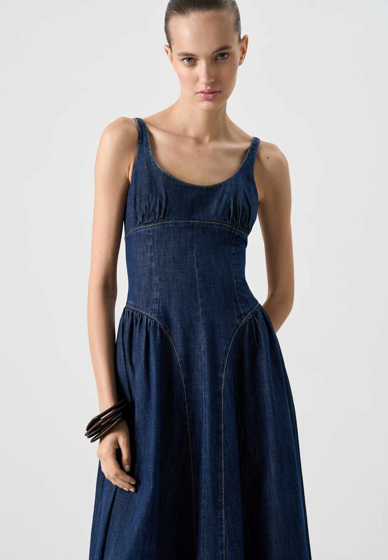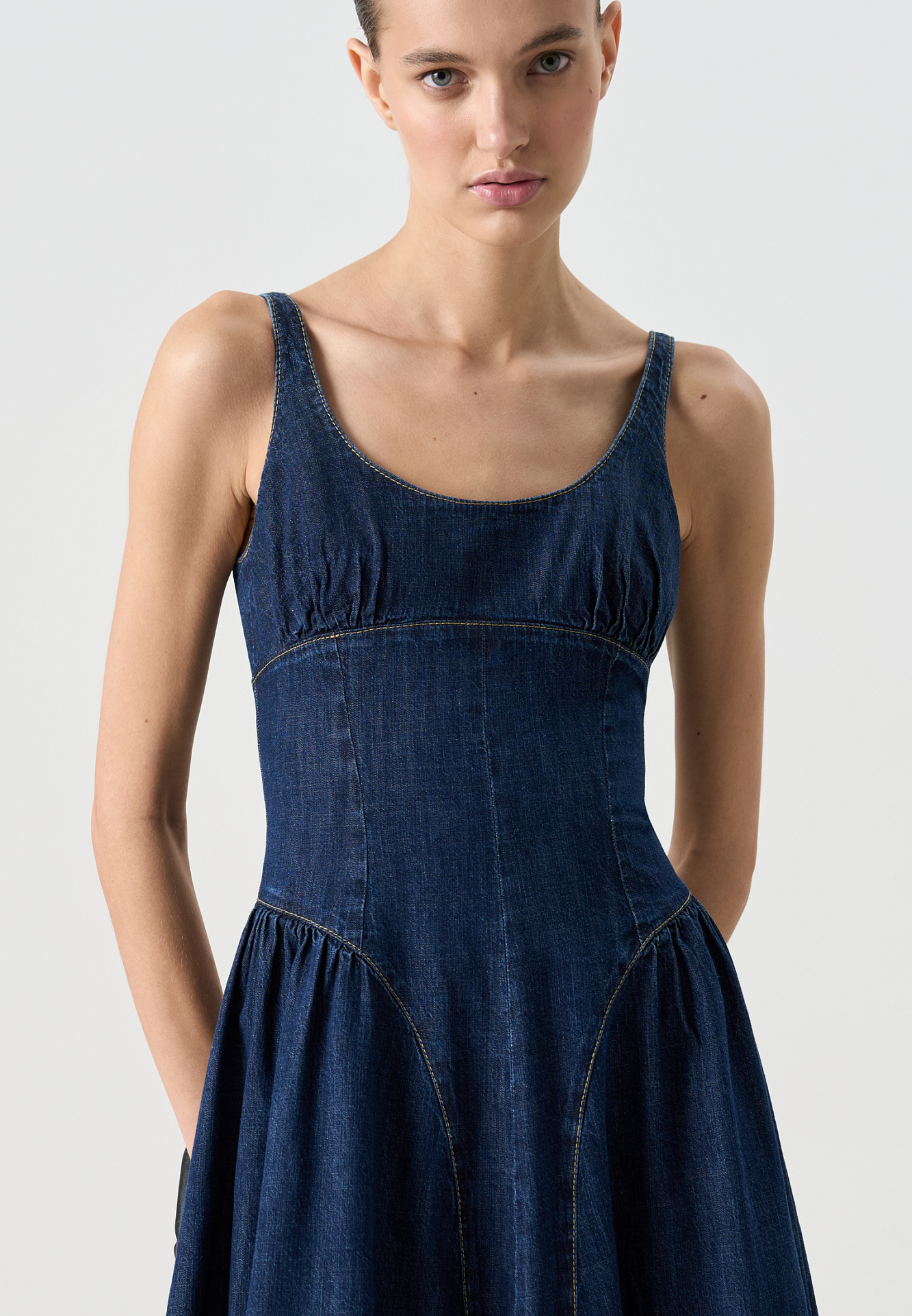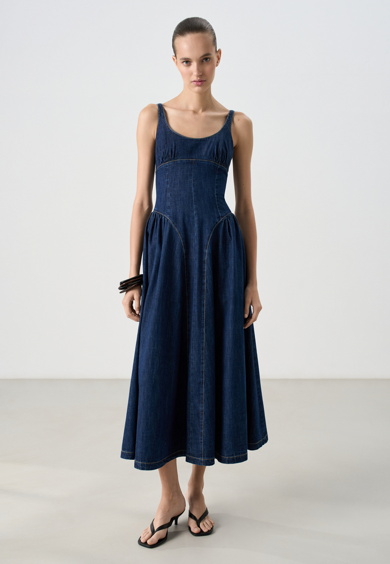 Джинсовое платье длины миди из 100% хлопка. Модель приталенного силуэта с акцентными вытачками по фигуре, без рукавов, U-образным вырезом, на тонких нерегулируемых бретельках и расклешенной юбкой. Застежка на молнию сзади.
