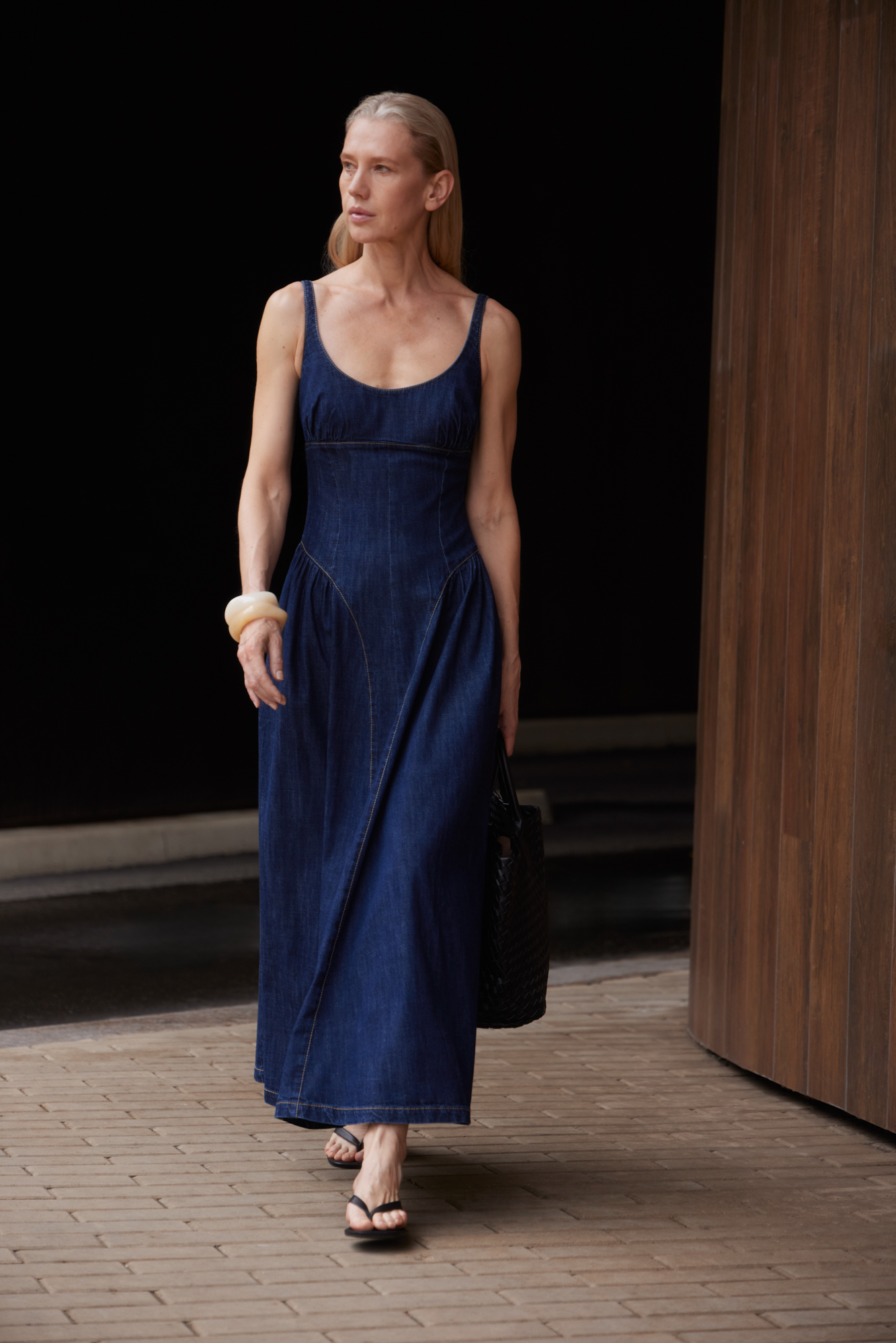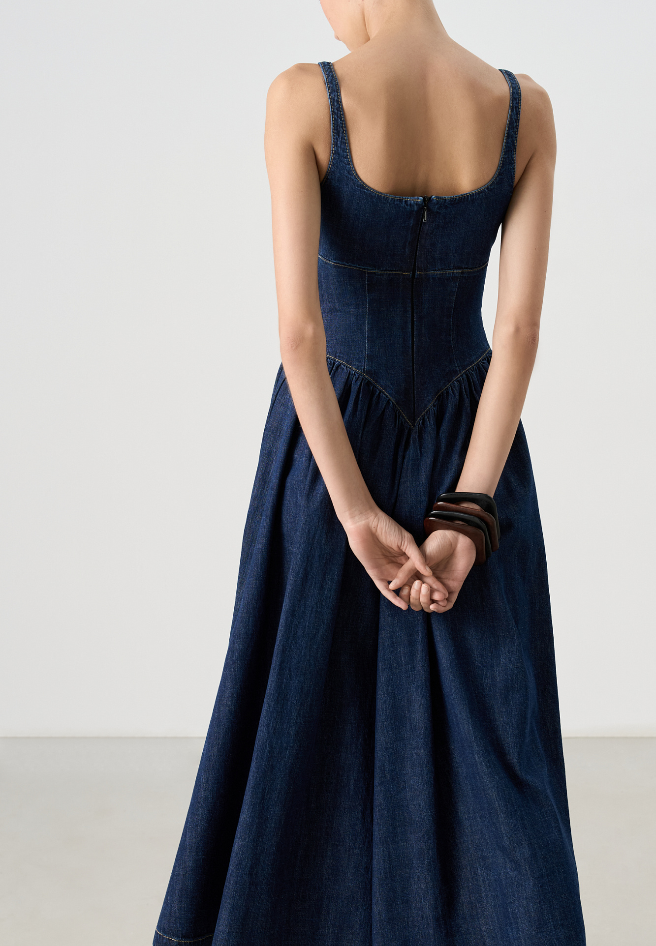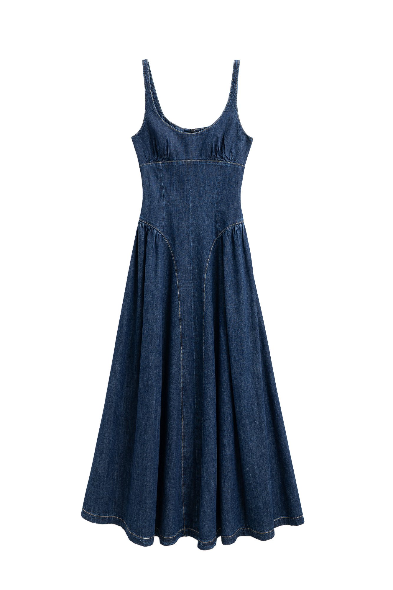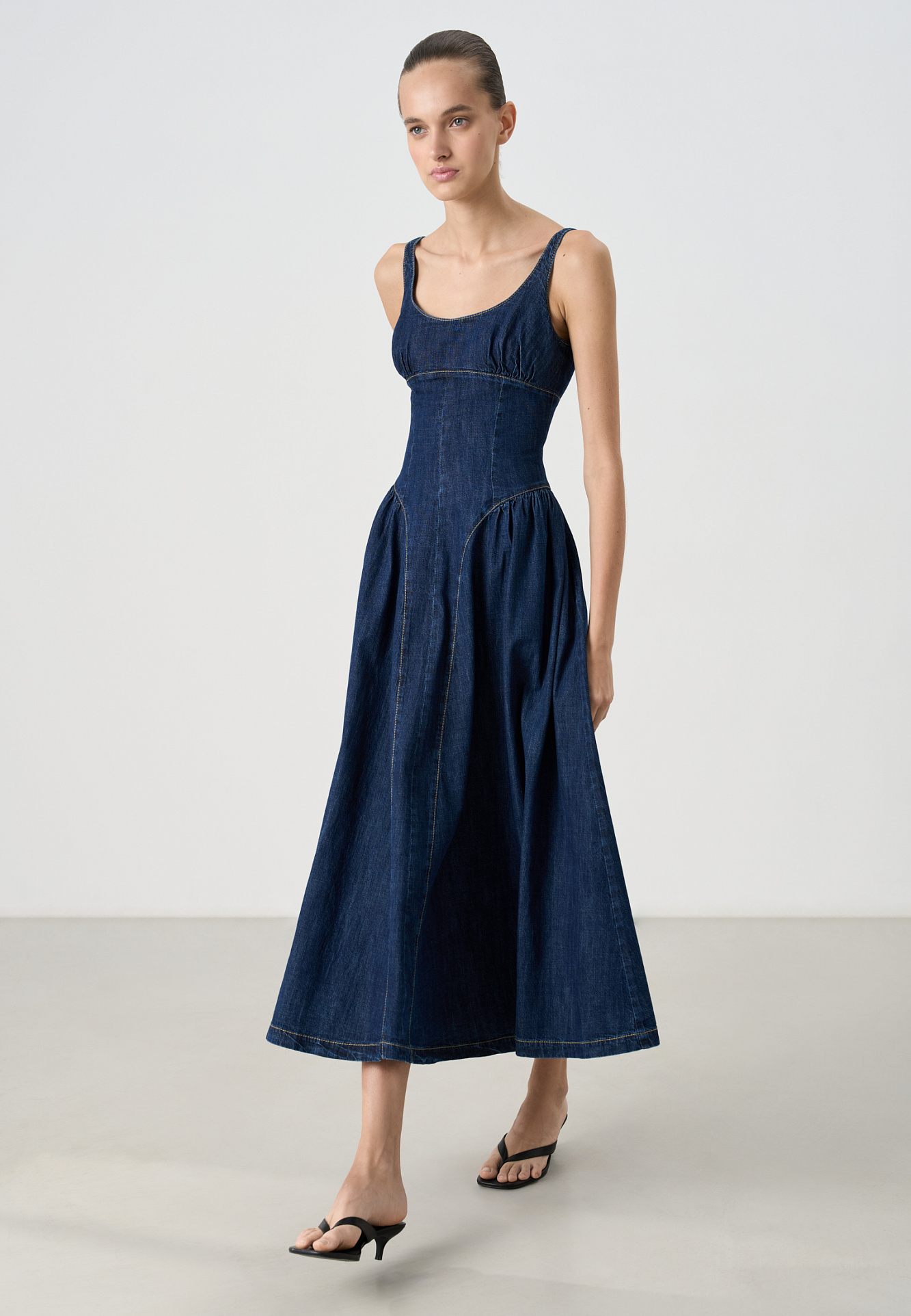 Джинсовое платье длины миди из 100% хлопка. Модель приталенного силуэта с акцентными вытачками по фигуре, без рукавов, U-образным вырезом, на тонких нерегулируемых бретельках и расклешенной юбкой. Застежка на молнию сзади.
