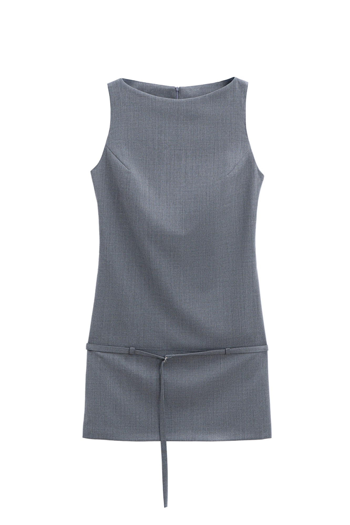 Платье-футляр длины мини из шерсти. Модель прямого кроя, без рукавов, с вырезом-лодочкой. Изделие декорировано шлевками и тонким ремешком на бедрах. Застежка на молнию сзади.