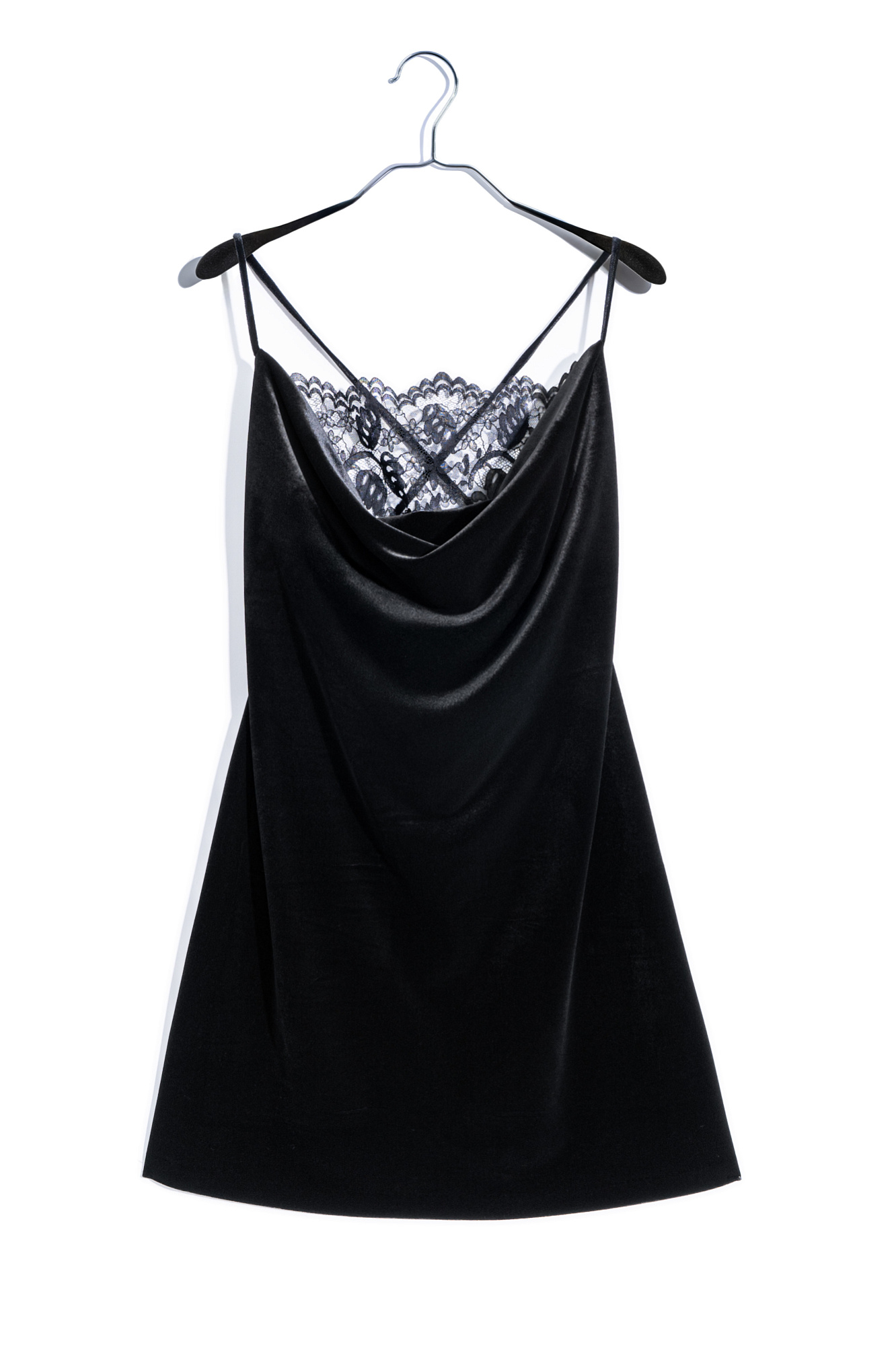 Бархатное вечернее платье длины мини. Модель приталенного силуэта на тонких бретельках. Лиф изделия декорирован тонким кружевом.