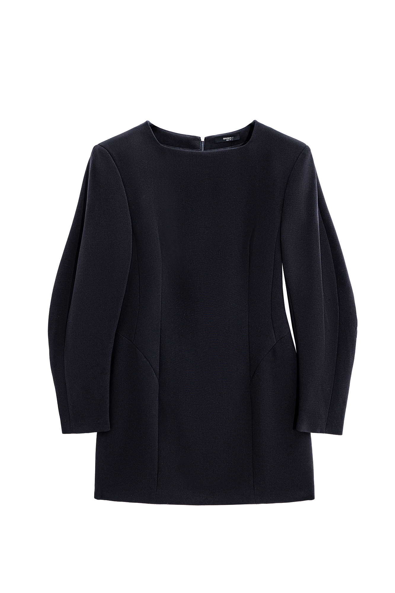 Платье из вискозы длины мини. Модель по фигуре с длинными рукавами, подплечниками и квадратным вырезом горловины. Застежка на молнию сзади. Изделие выполнено на подкладке.
