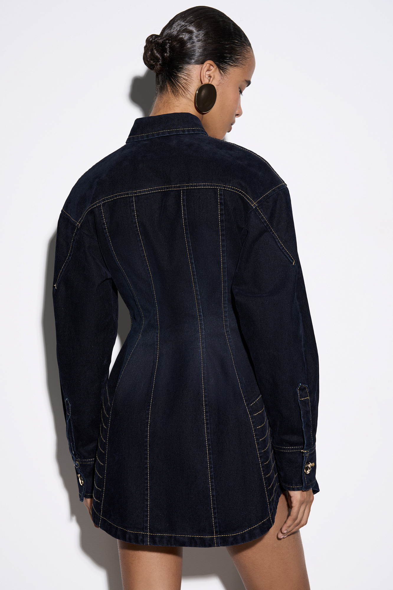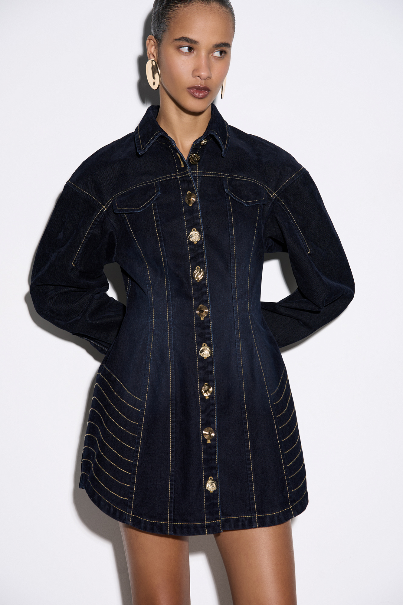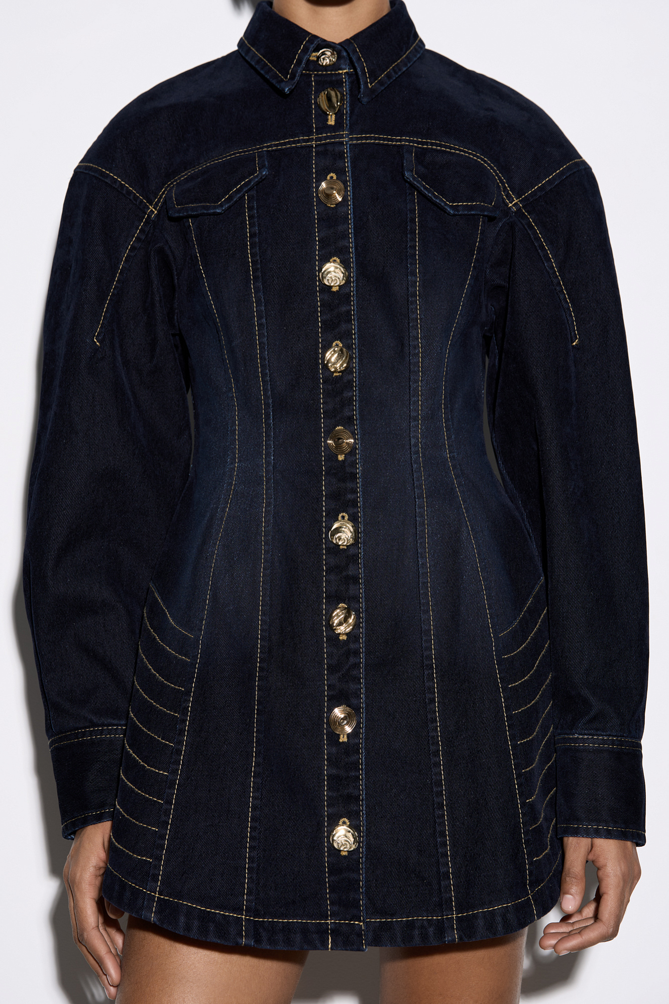 Платье длины мини из флокированного денима - 100% хлопка с имитацией бархатной текстуры. Модель приталенного силуэта с акцентной строчкой, с длинным рукавом и отложным воротником. Застежка на декоративные пуговицы.