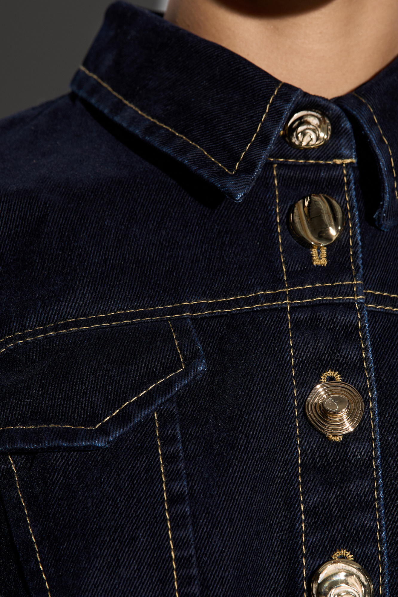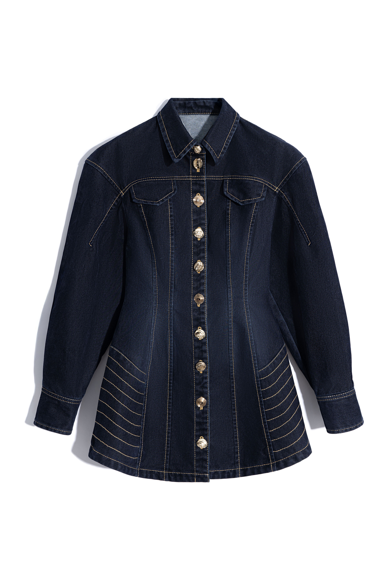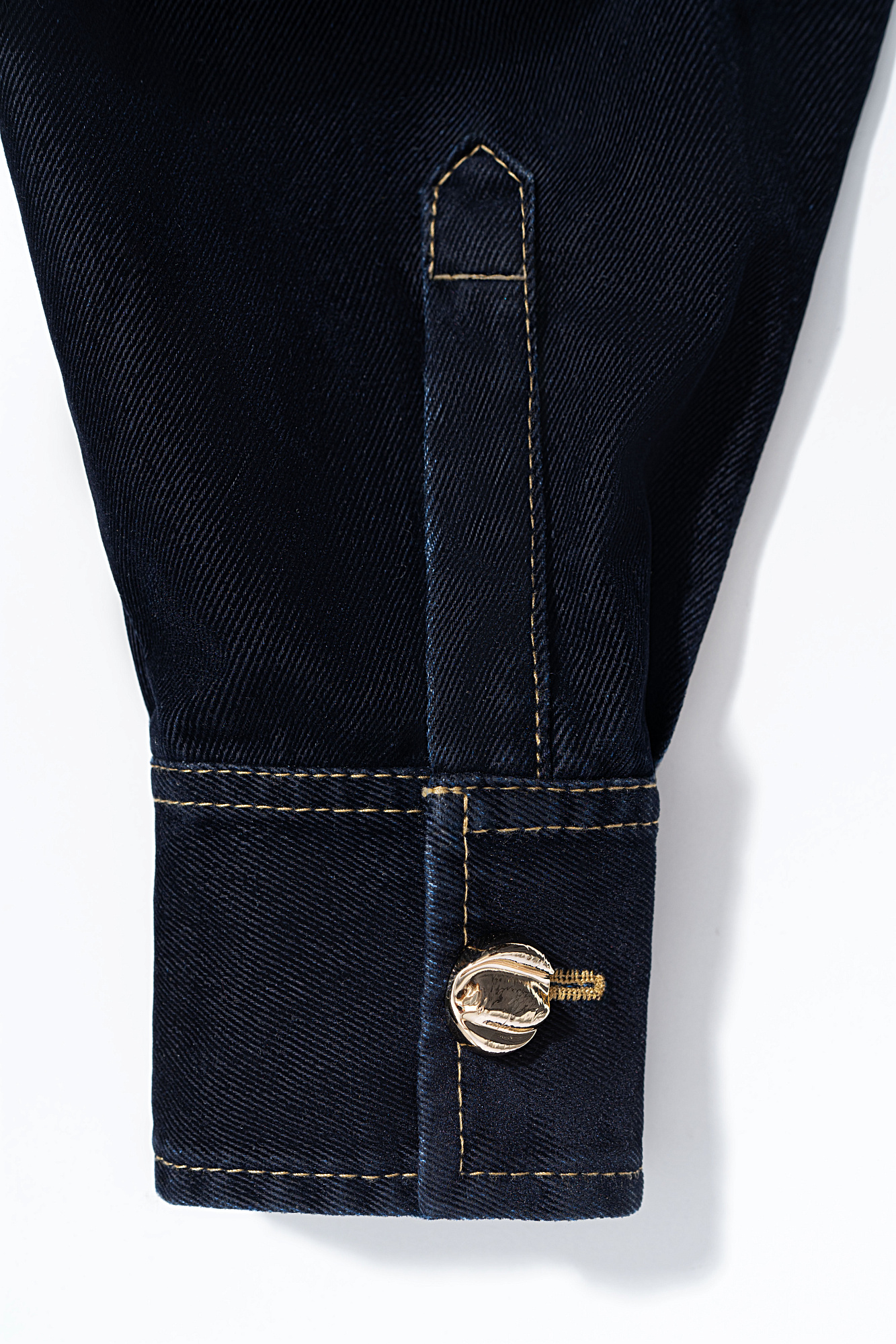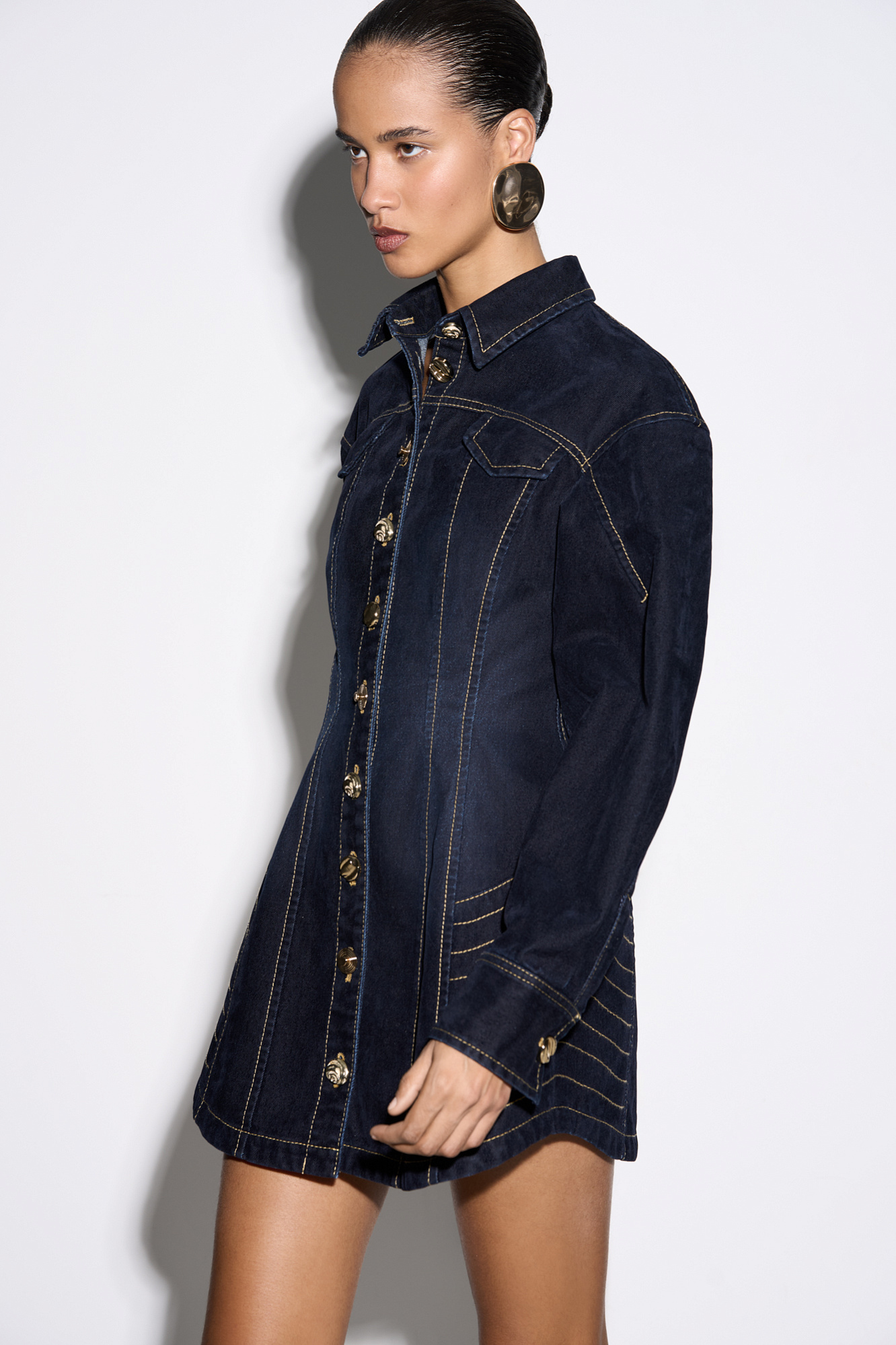 Платье длины мини из флокированного денима - 100% хлопка с имитацией бархатной текстуры. Модель приталенного силуэта с акцентной строчкой, с длинным рукавом и отложным воротником. Застежка на декоративные пуговицы.